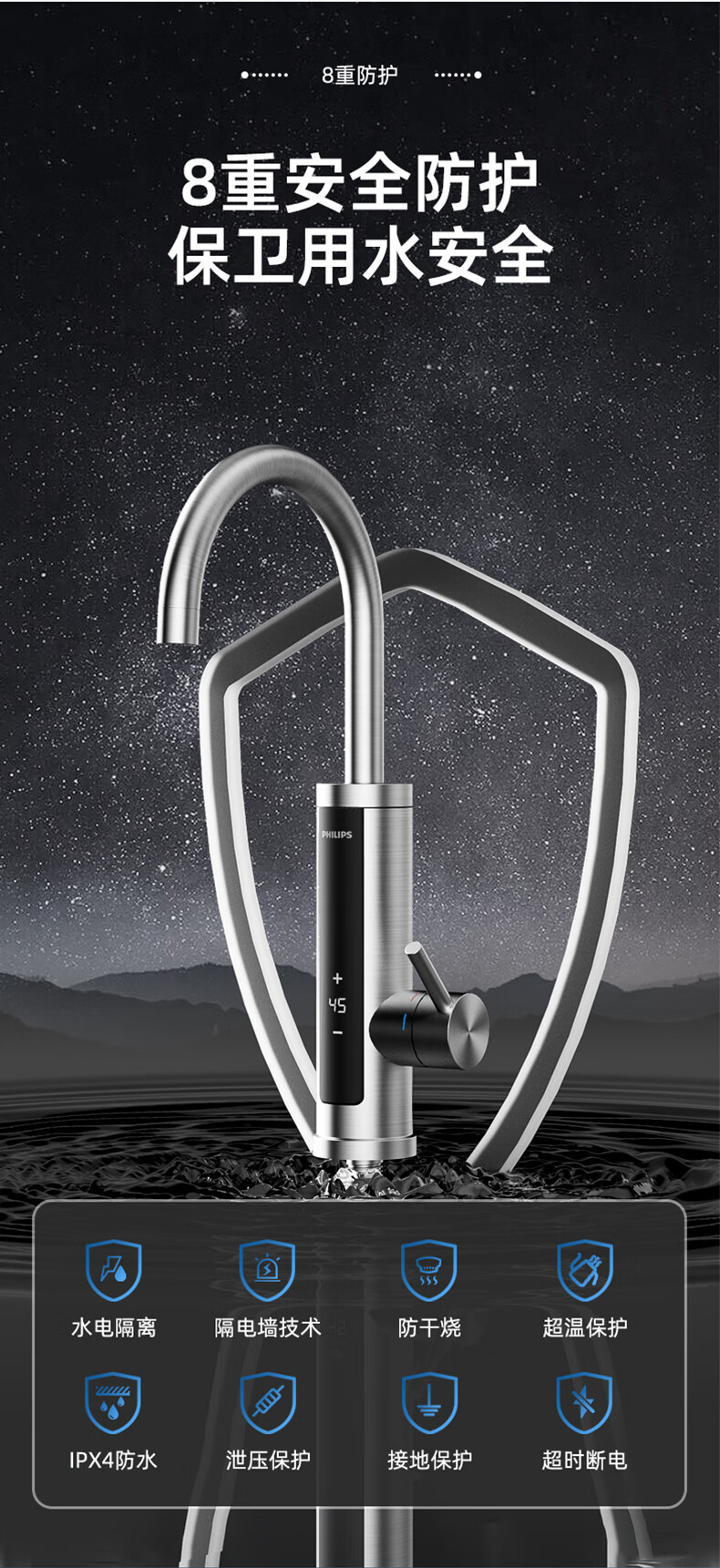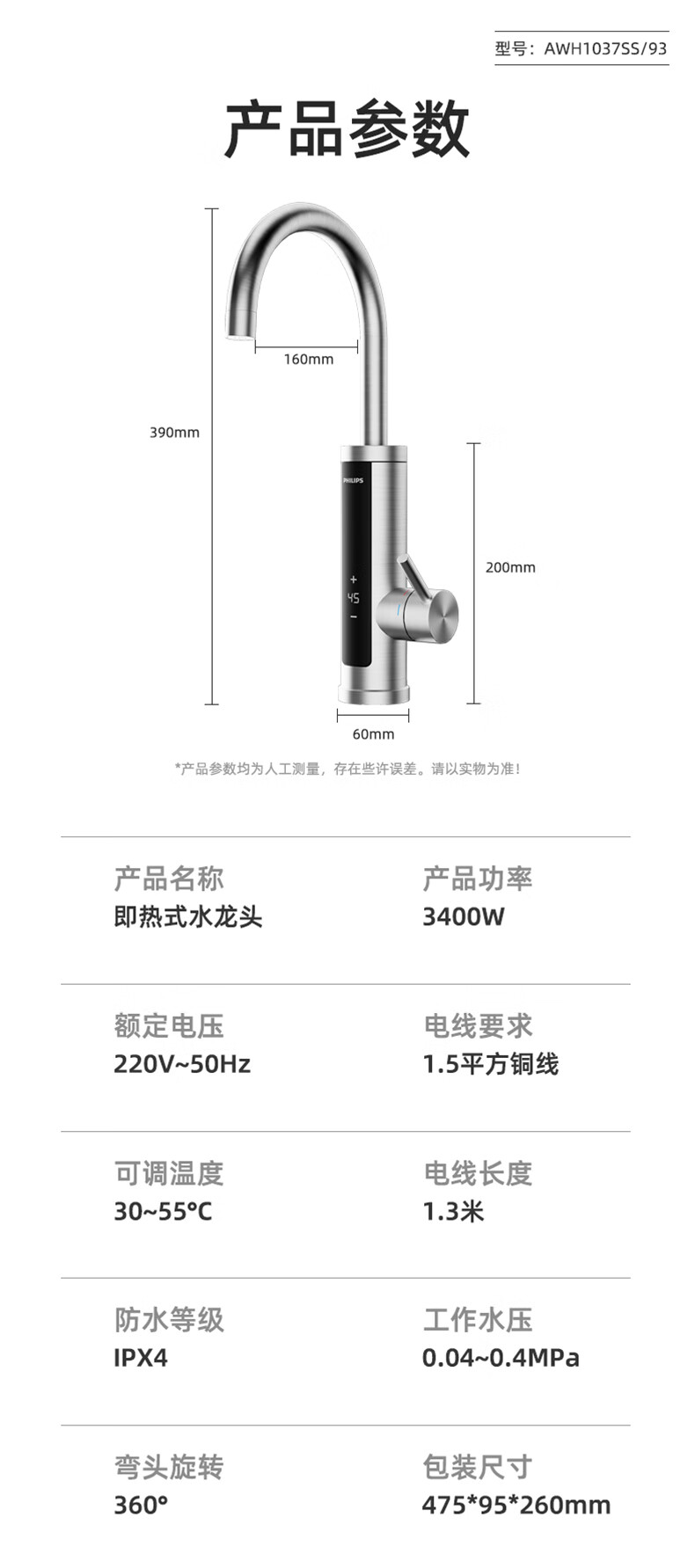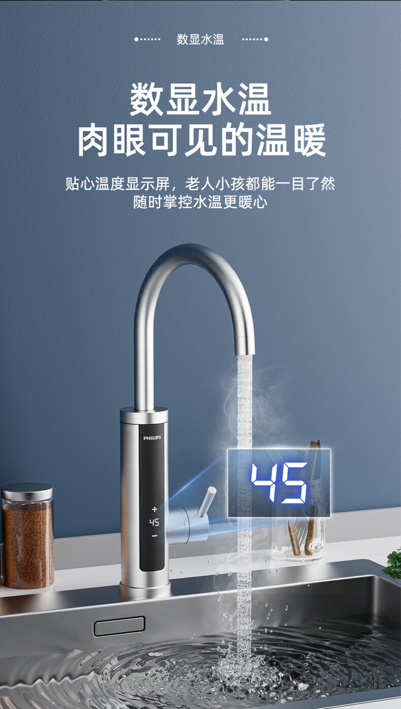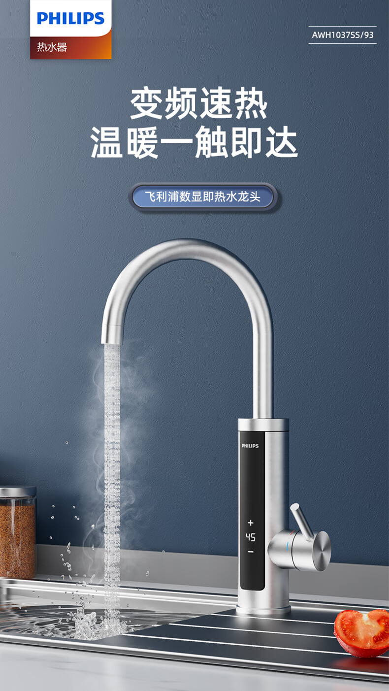 飞利浦Philips-AWH1037电热水龙头奥即热式克变频恒温斯不锈钢过水热水器厨房家用卫生间款数显款包安装 【人气热卖】变频不锈钢款 AWH1037