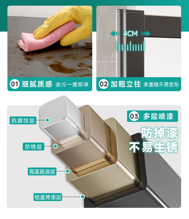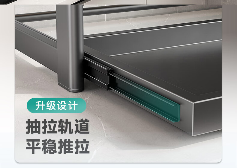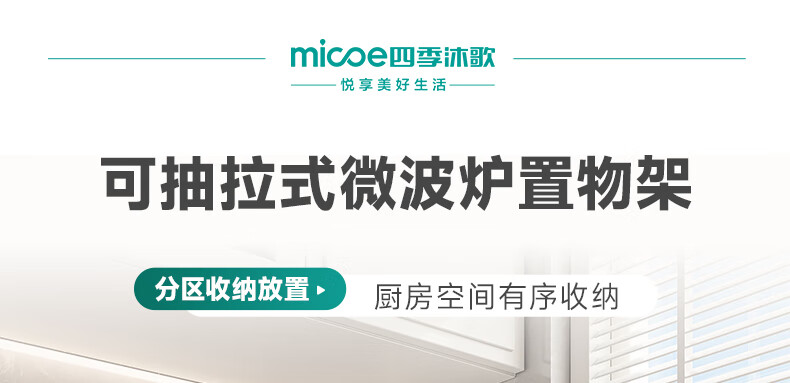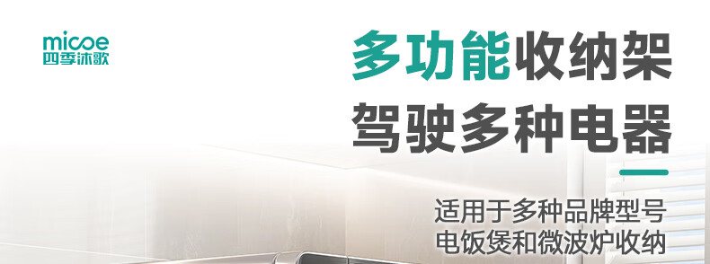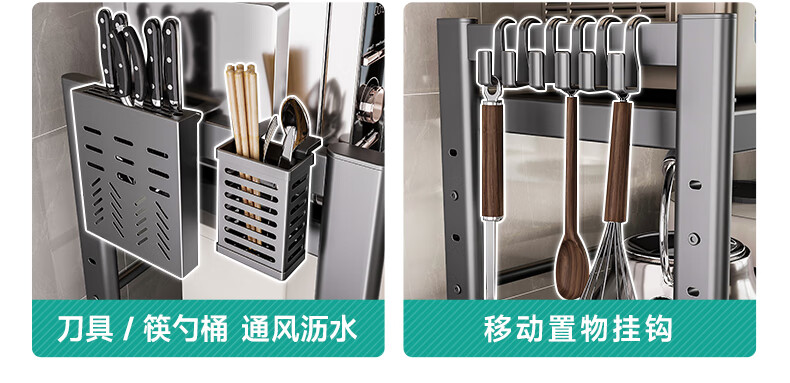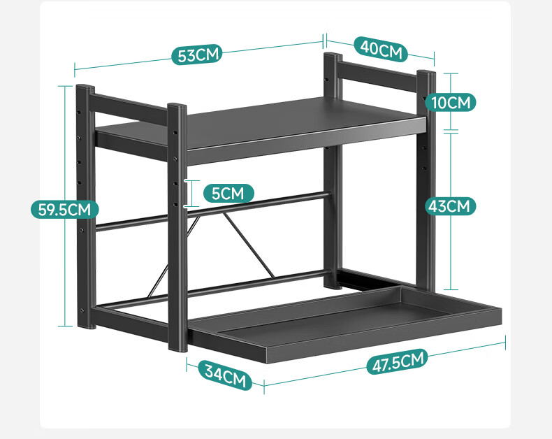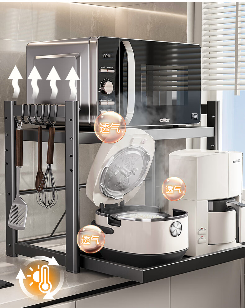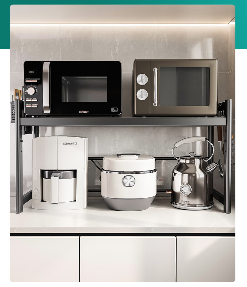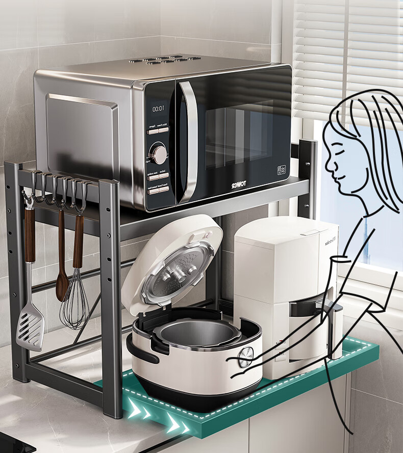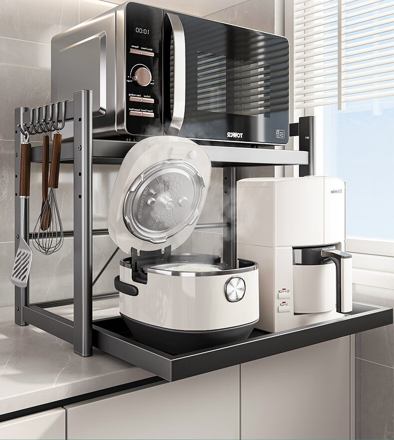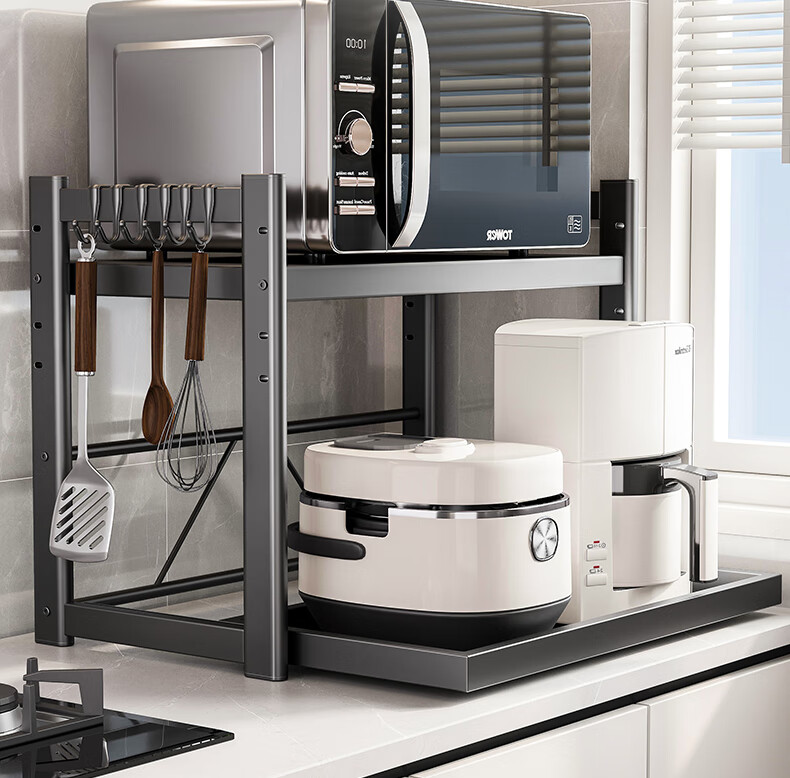 四季沐歌厨房置物架伸缩微波炉烤箱架电饭锅家用多功能台面用具储物收纳架 枪灰【双层固定58cm+6钩】