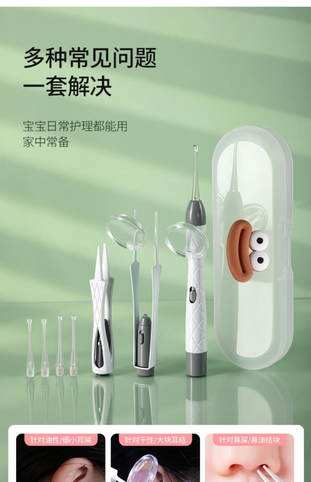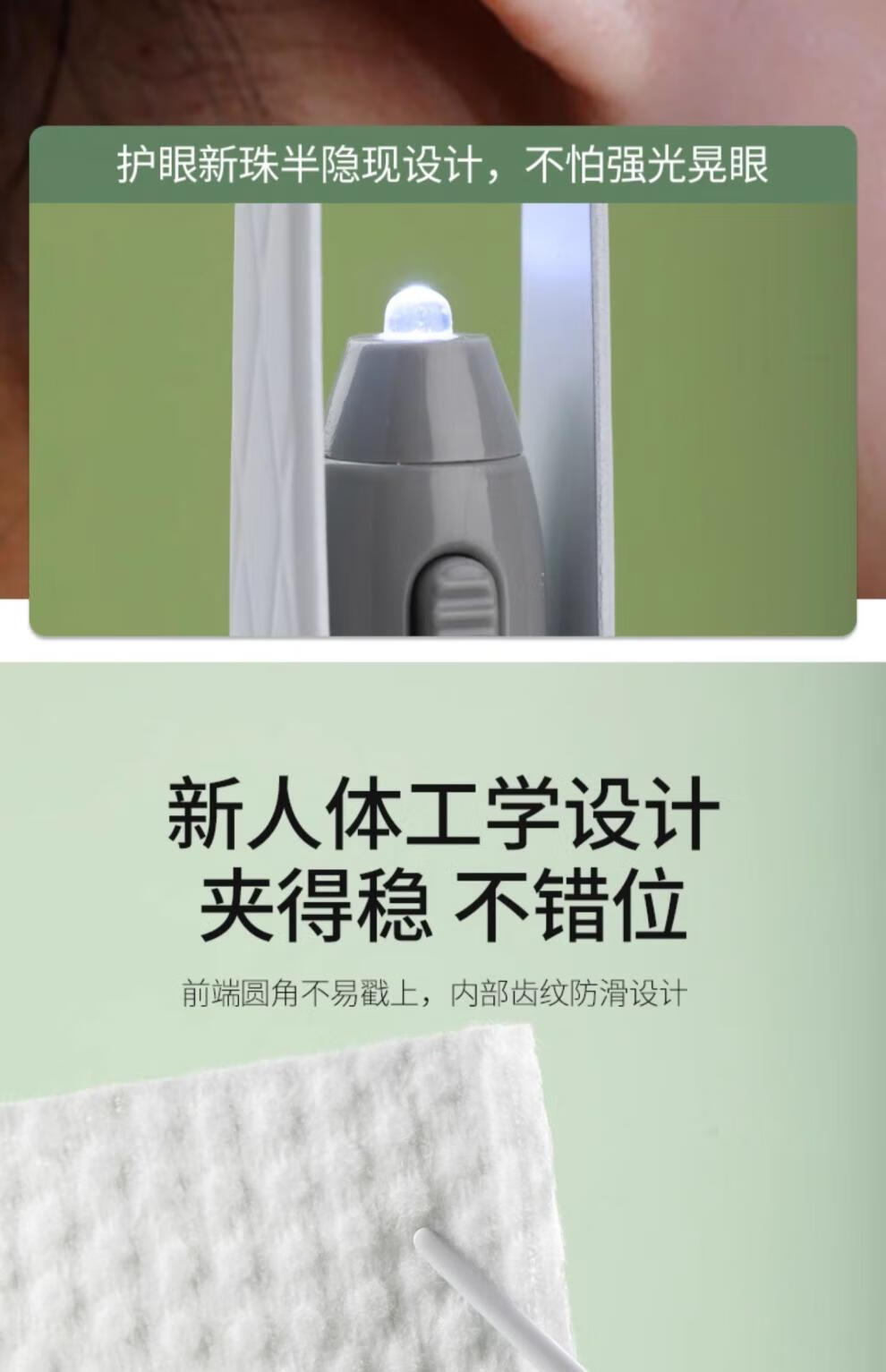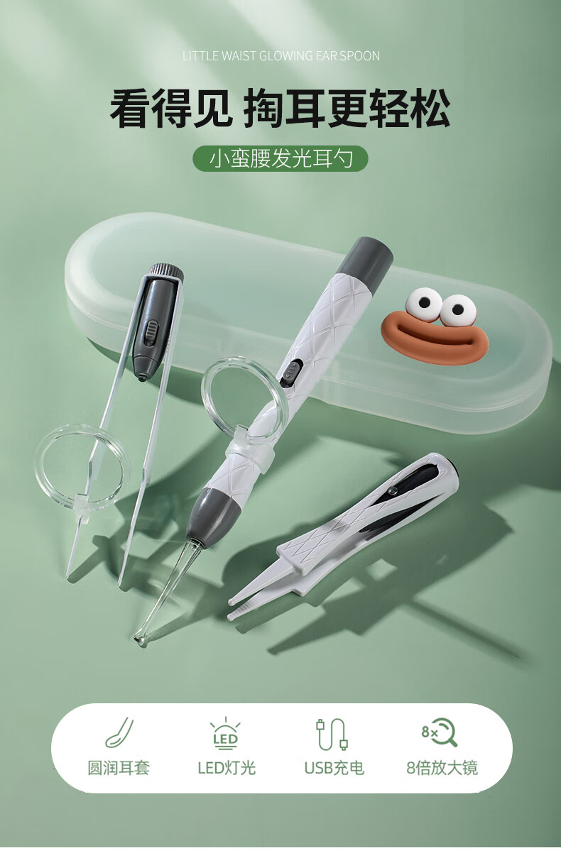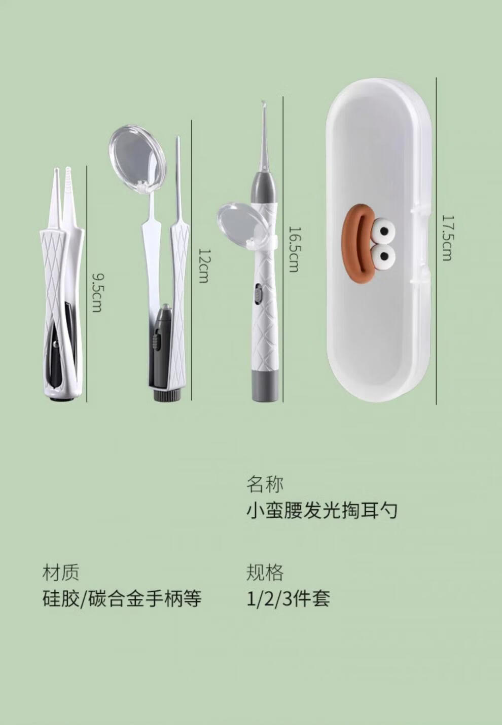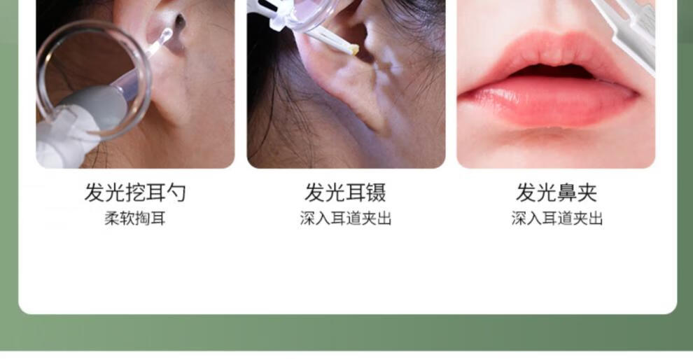 兮儿掏耳家用抠扣挖耳朵宝宝挖耳勺软头耳屎儿童用安全镊子发光带灯 3件套-绿色【耳勺+耳镊+鼻夹】