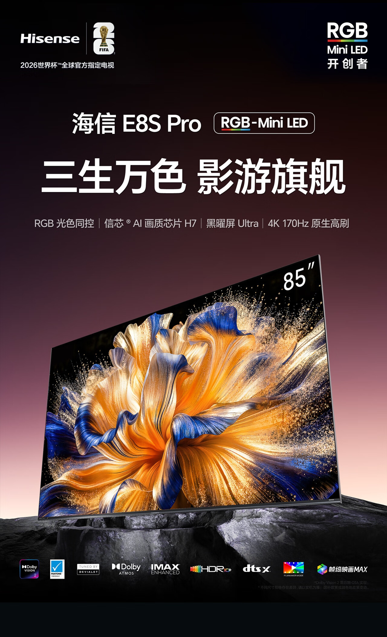 海信RGB-MiniLED电视 E8S Pro 85吋 7020分区 H7芯片 黑曜屏Ultra 170Hz高刷 国家补贴 世界杯指定电视