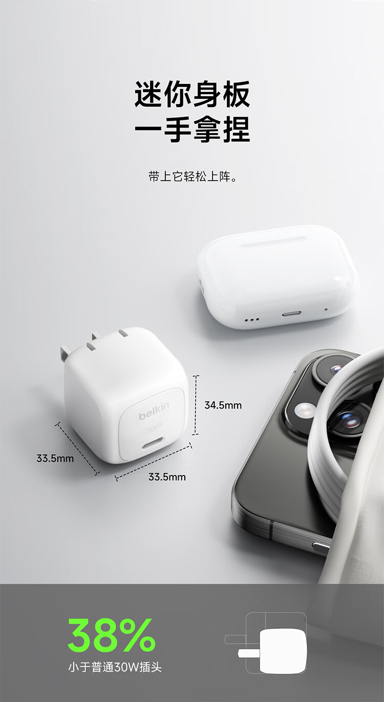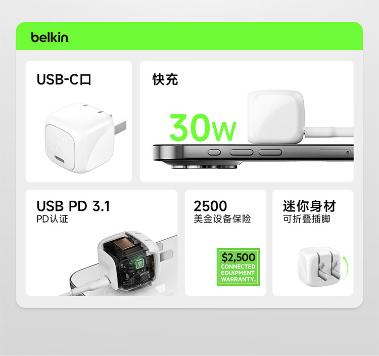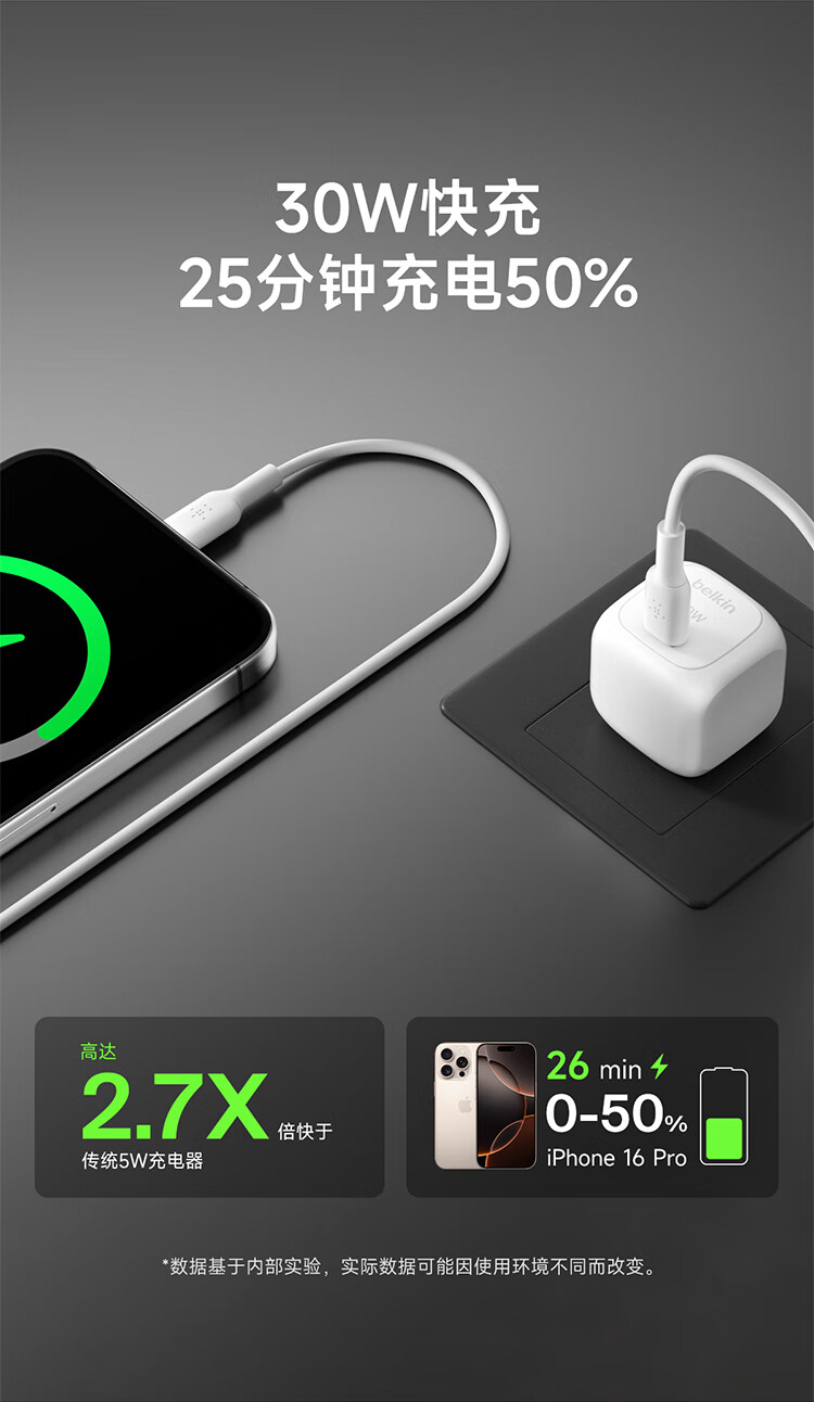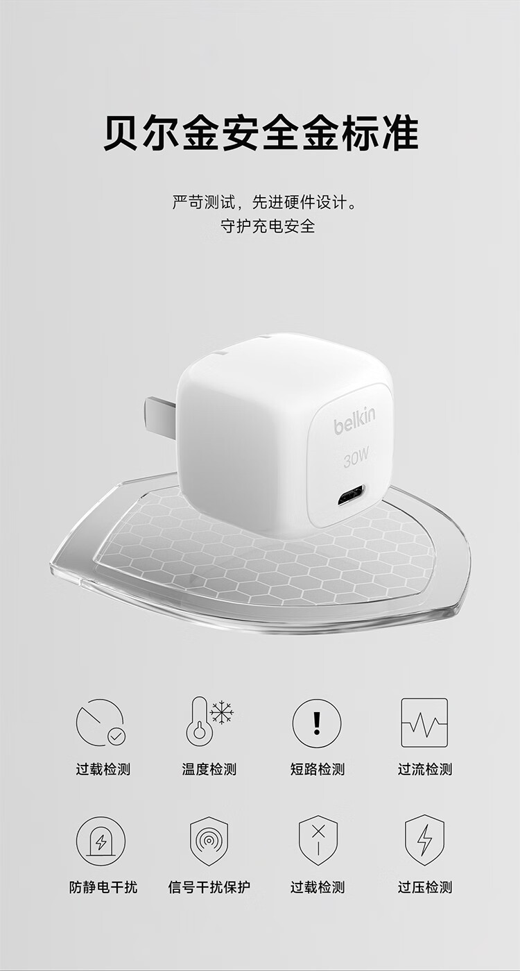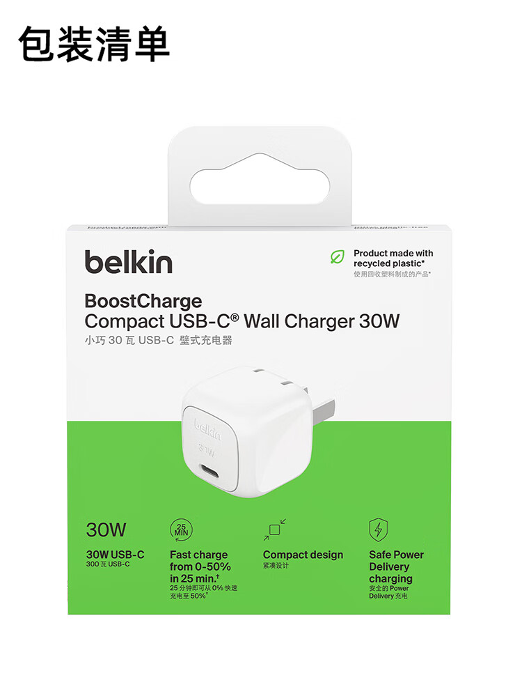 贝尔金(BELKIN)充电器 PD快充苹果充电器 30W便携充电头 Type-C手机iPhone充电头 C口电源适配器