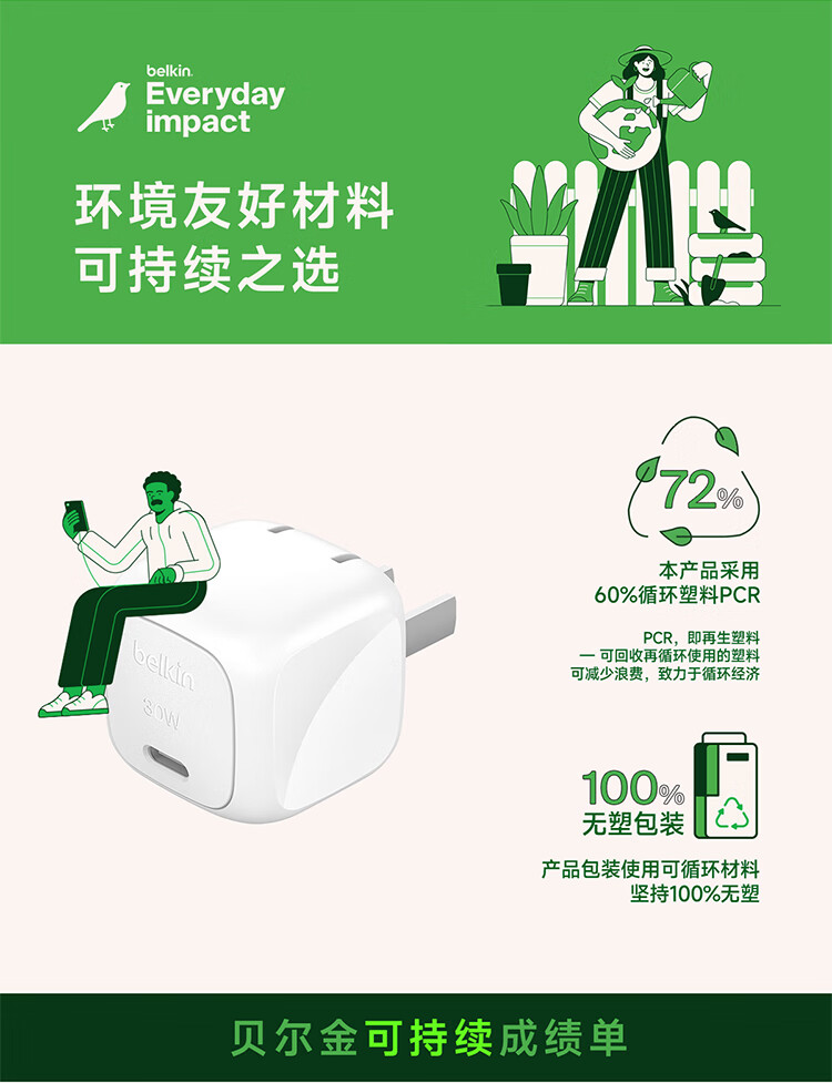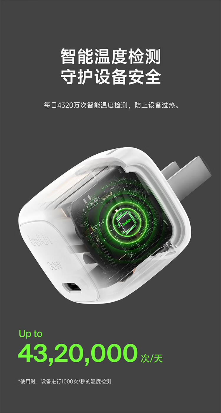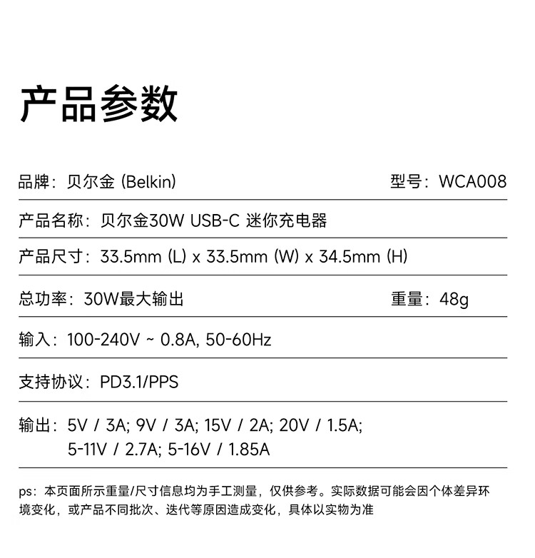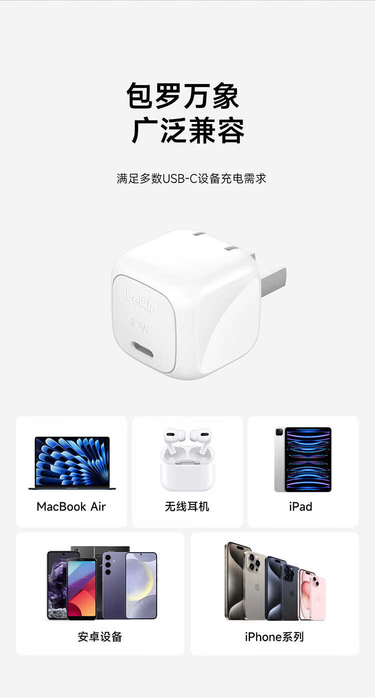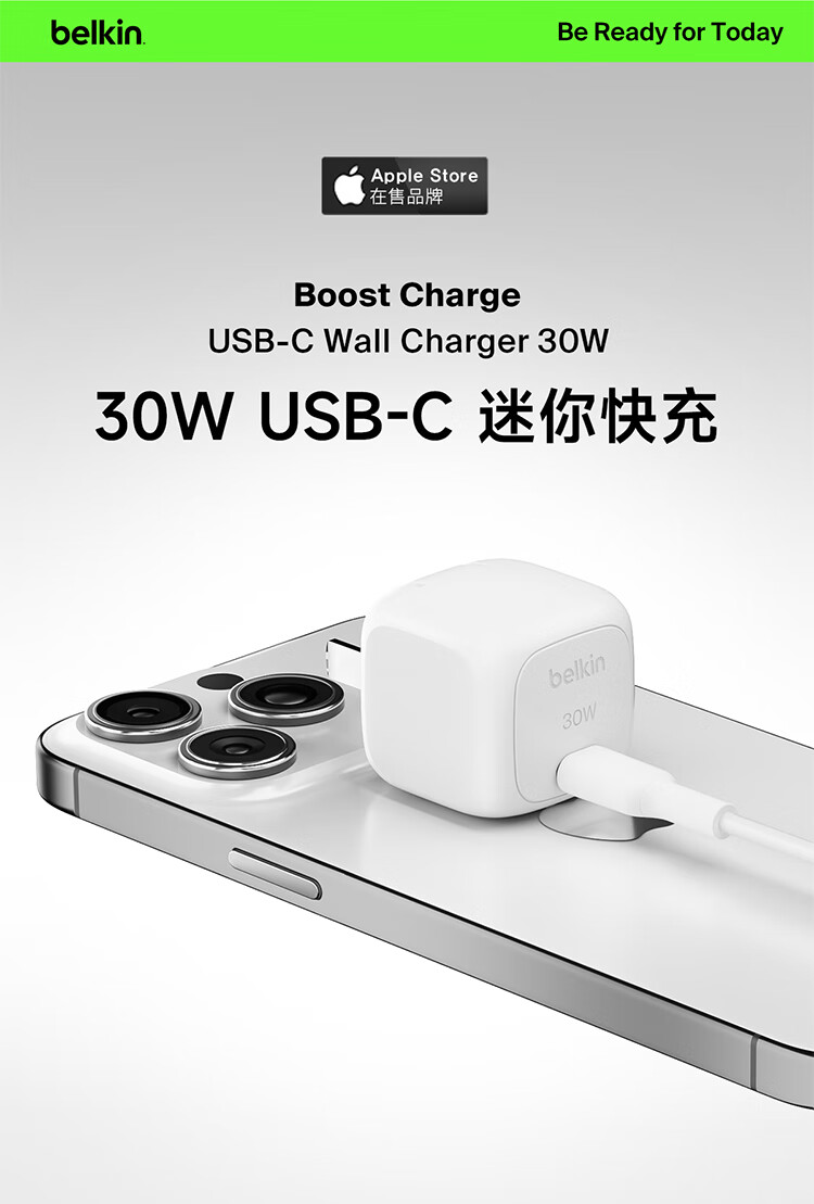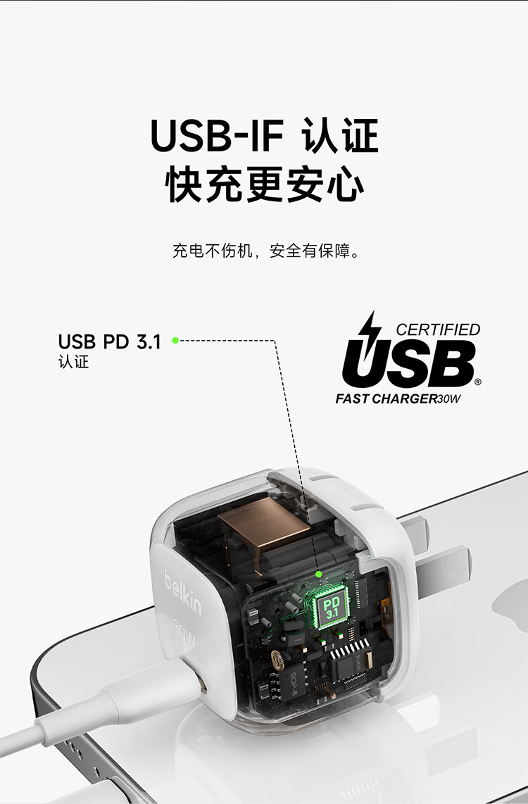 贝尔金(BELKIN)充电器 PD快充苹果充电器 30W便携充电头 Type-C手机iPhone充电头 C口电源适配器