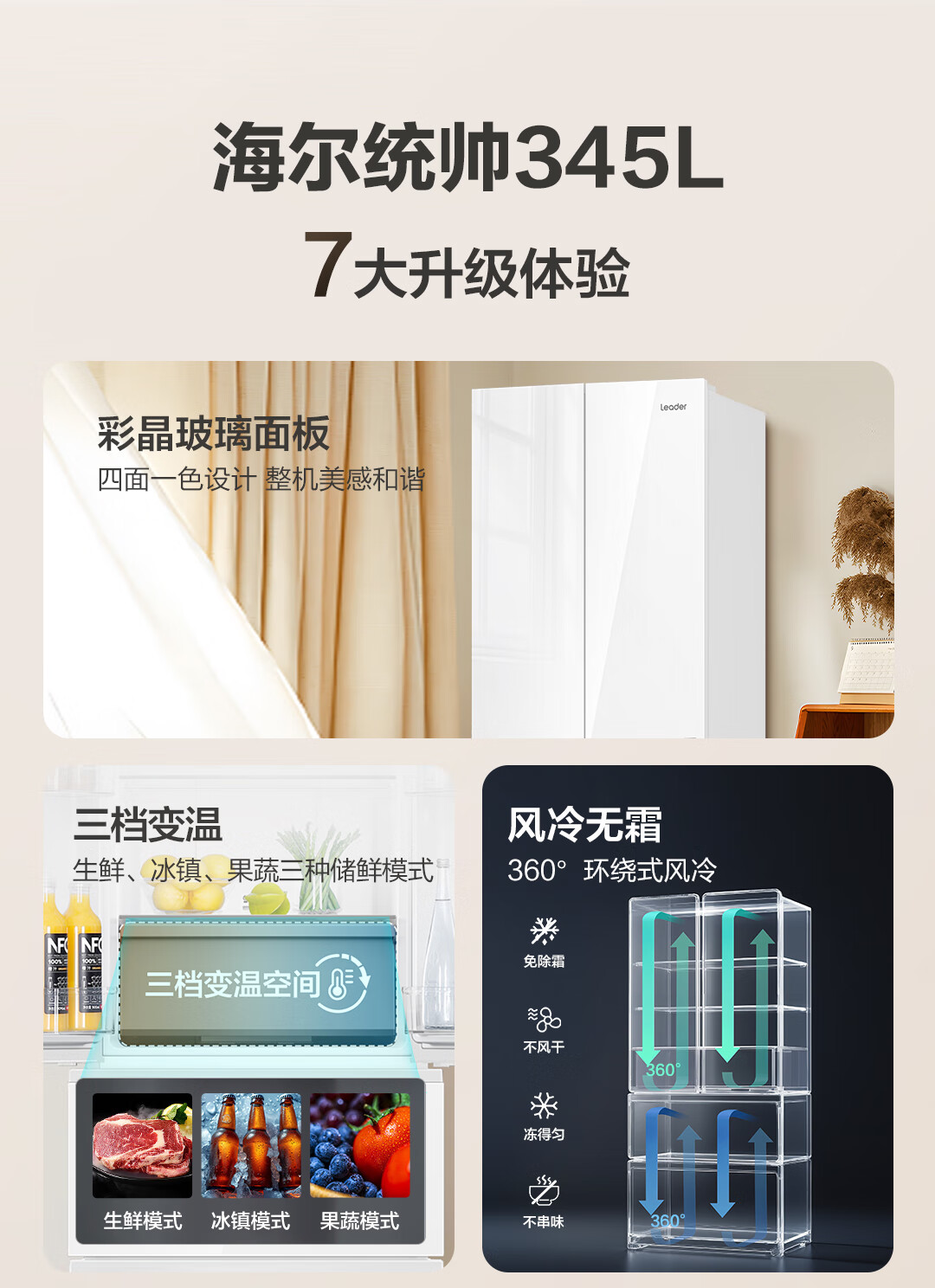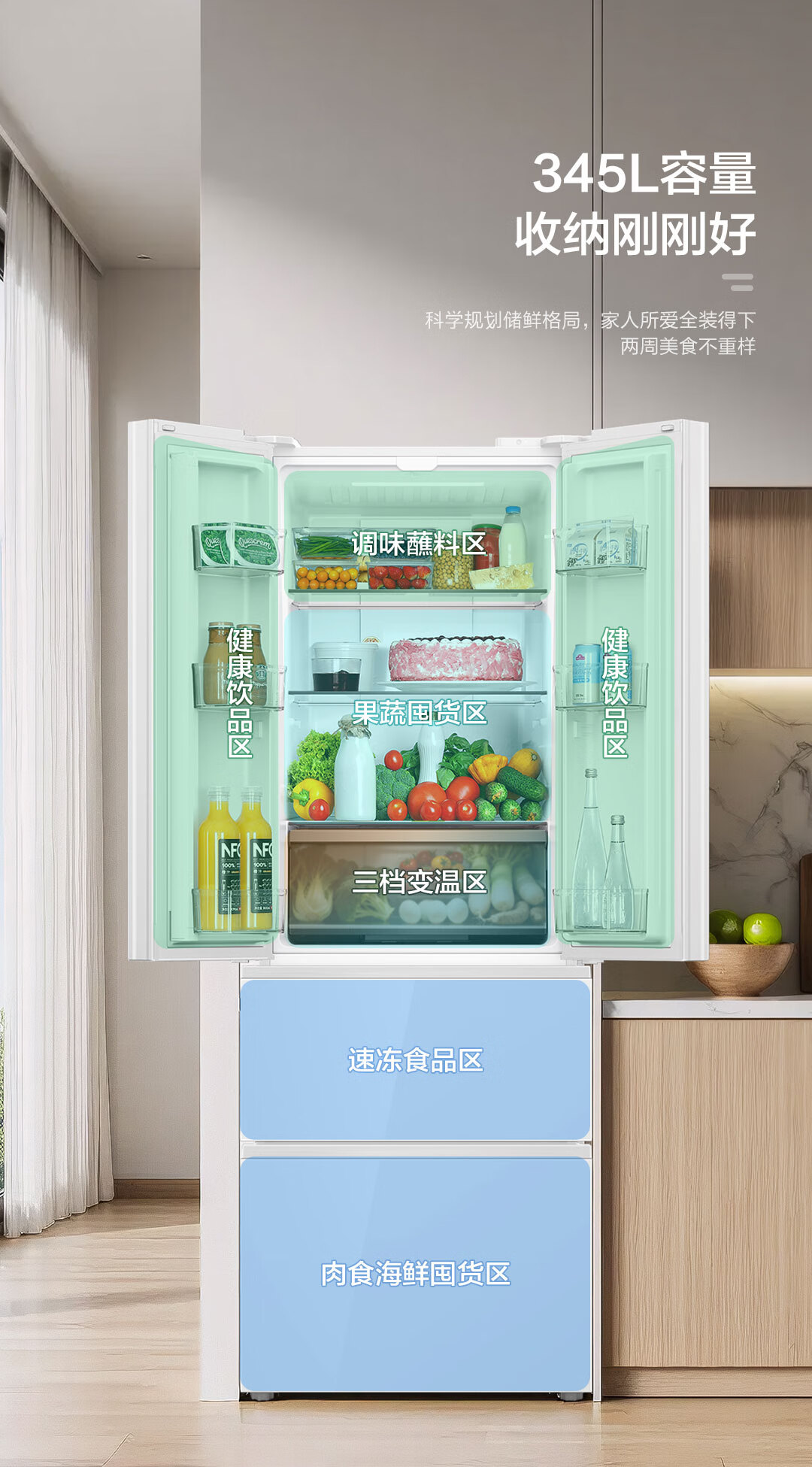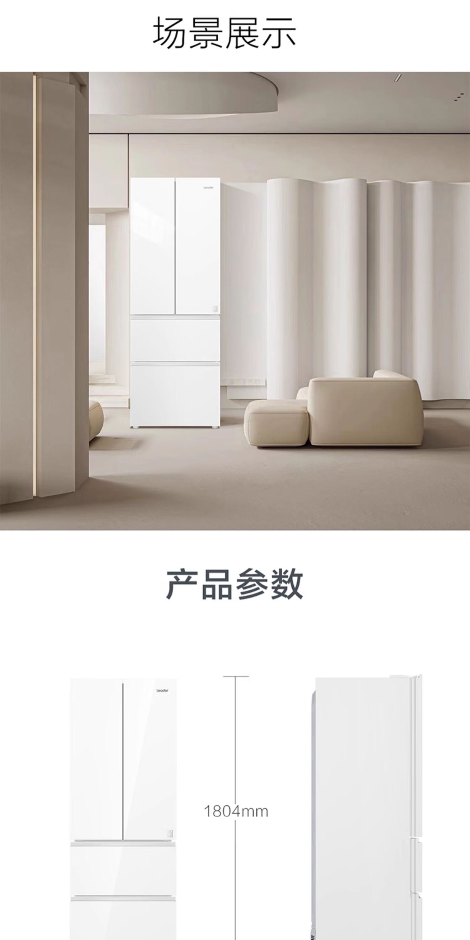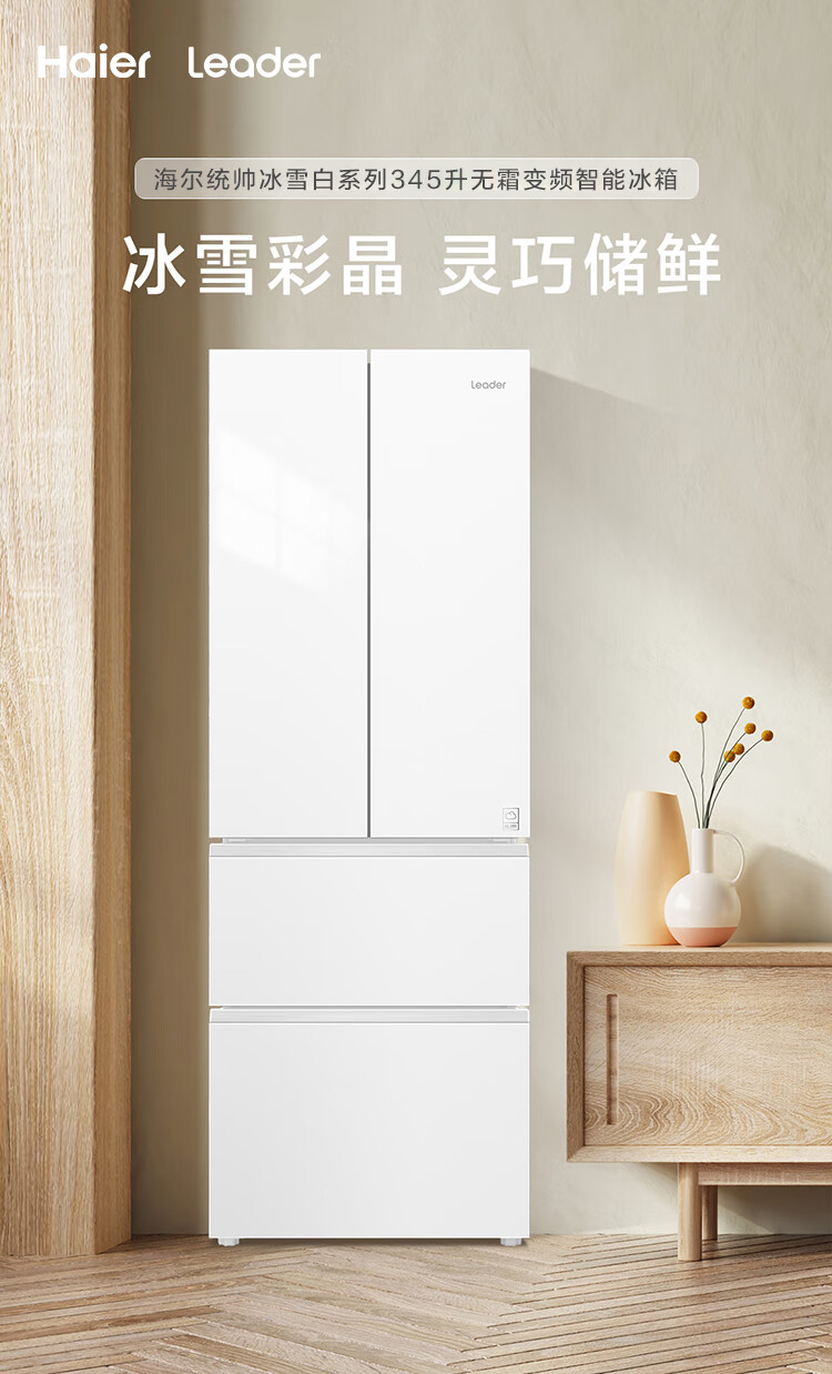 海尔(Haier)冰箱345升法式多门双开门四门一级能效双变频风冷无霜黑金抗菌三档变温超薄家用冰箱国家补贴统帅 345L冰雪白丨彩晶玻璃丨三档变温丨黑金净化