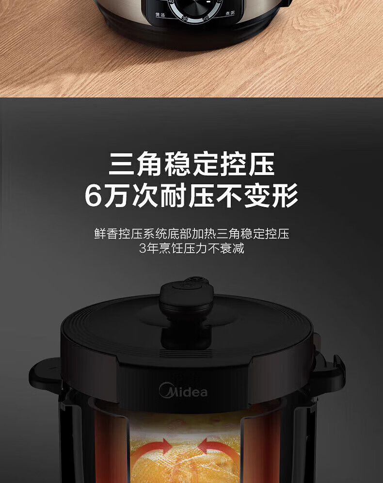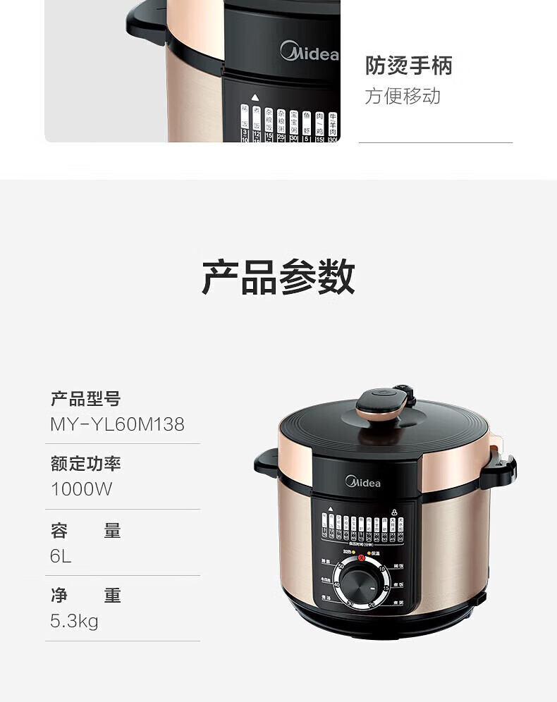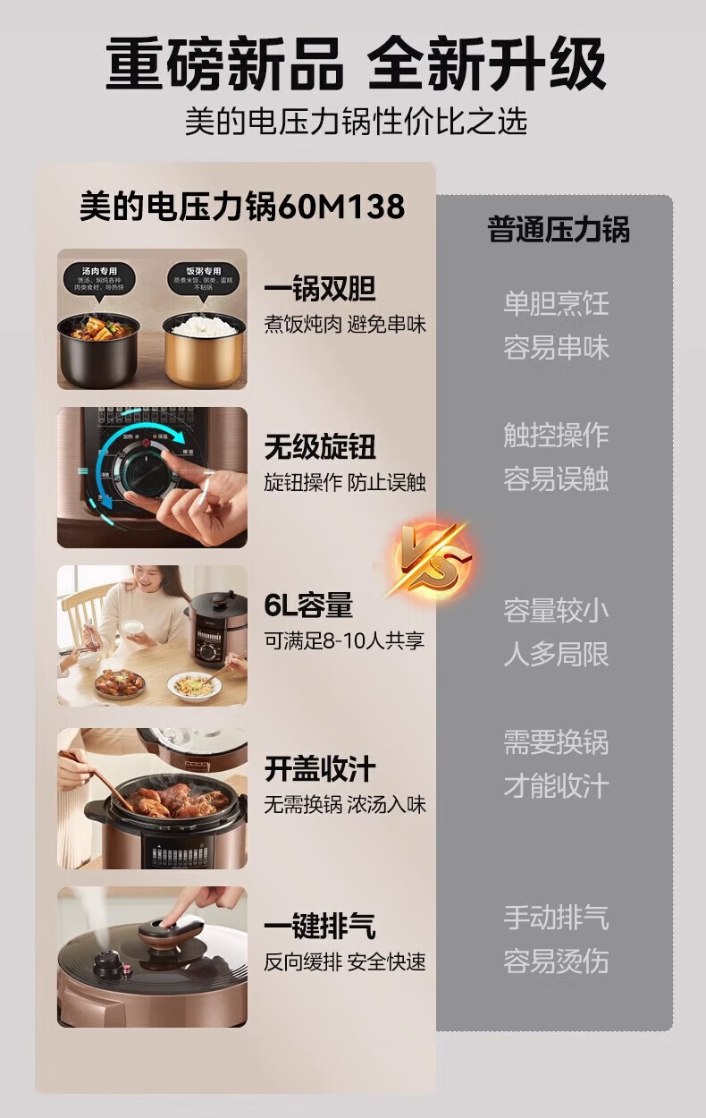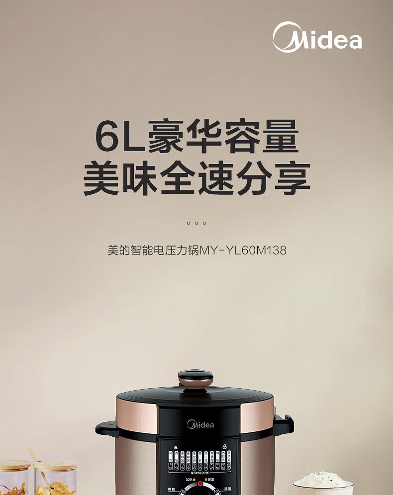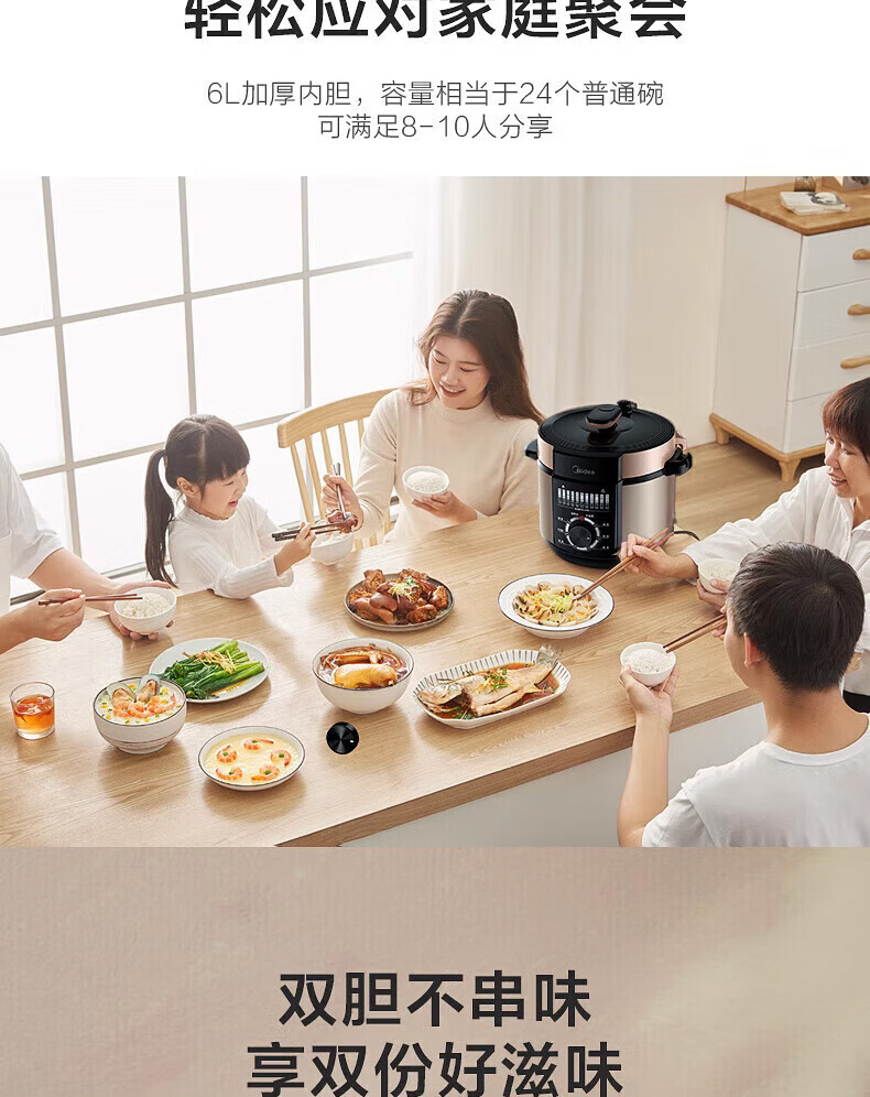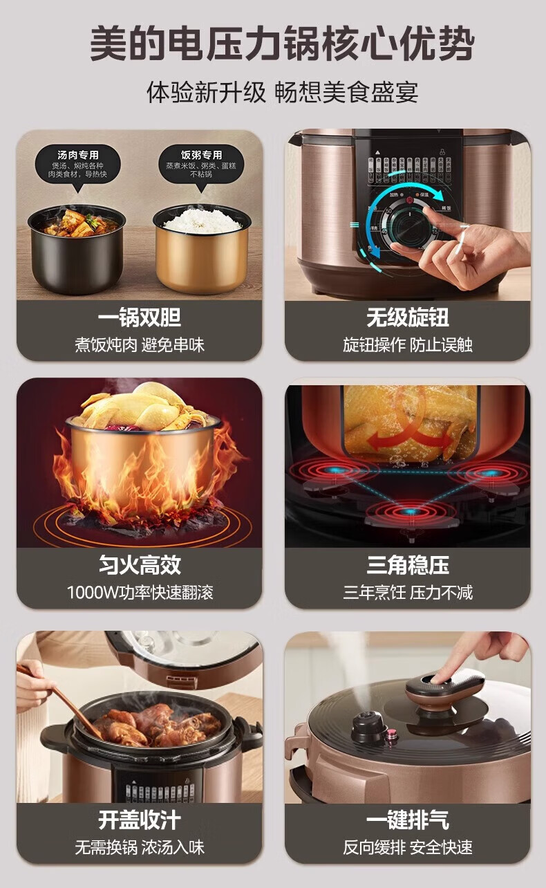 美的(Midea)电压力锅电高压锅 家用6L大容量多功能电饭煲高压电饭锅不粘双胆 智能煮饭煲汤 一键排气 【6升一锅双胆】高压快煮 6L