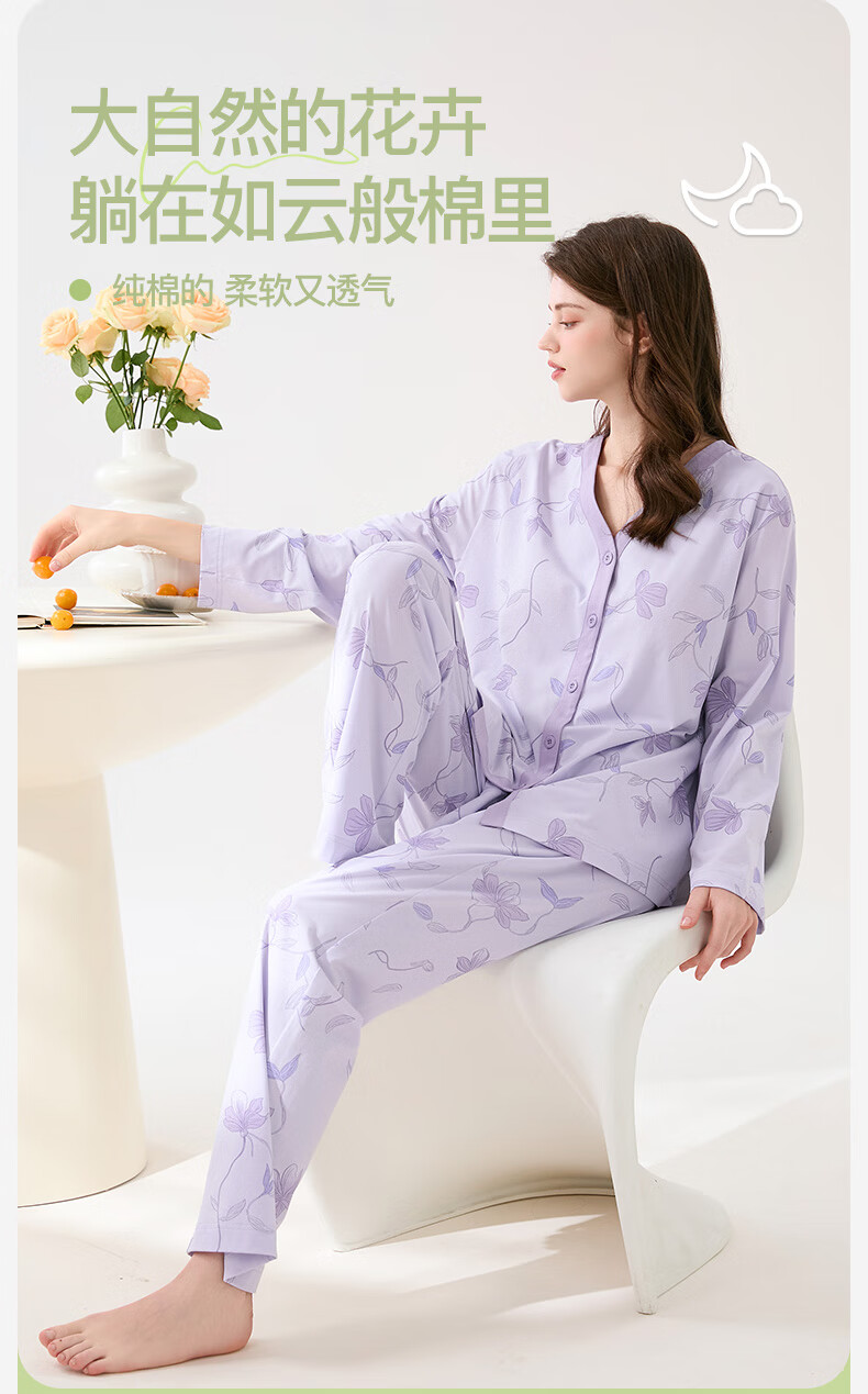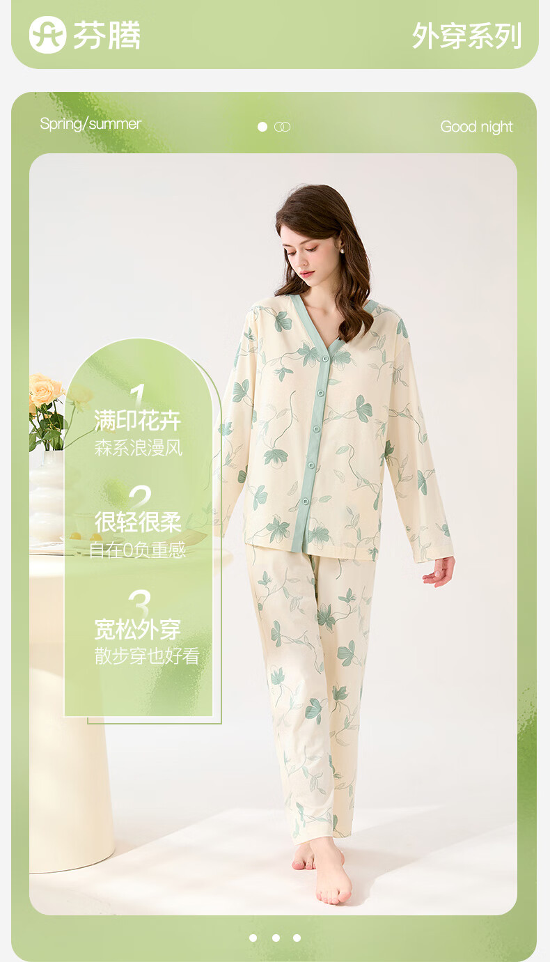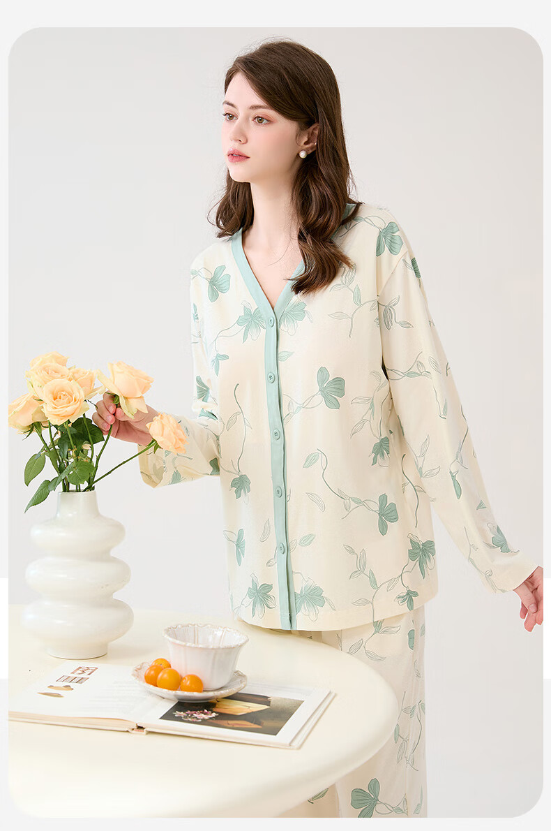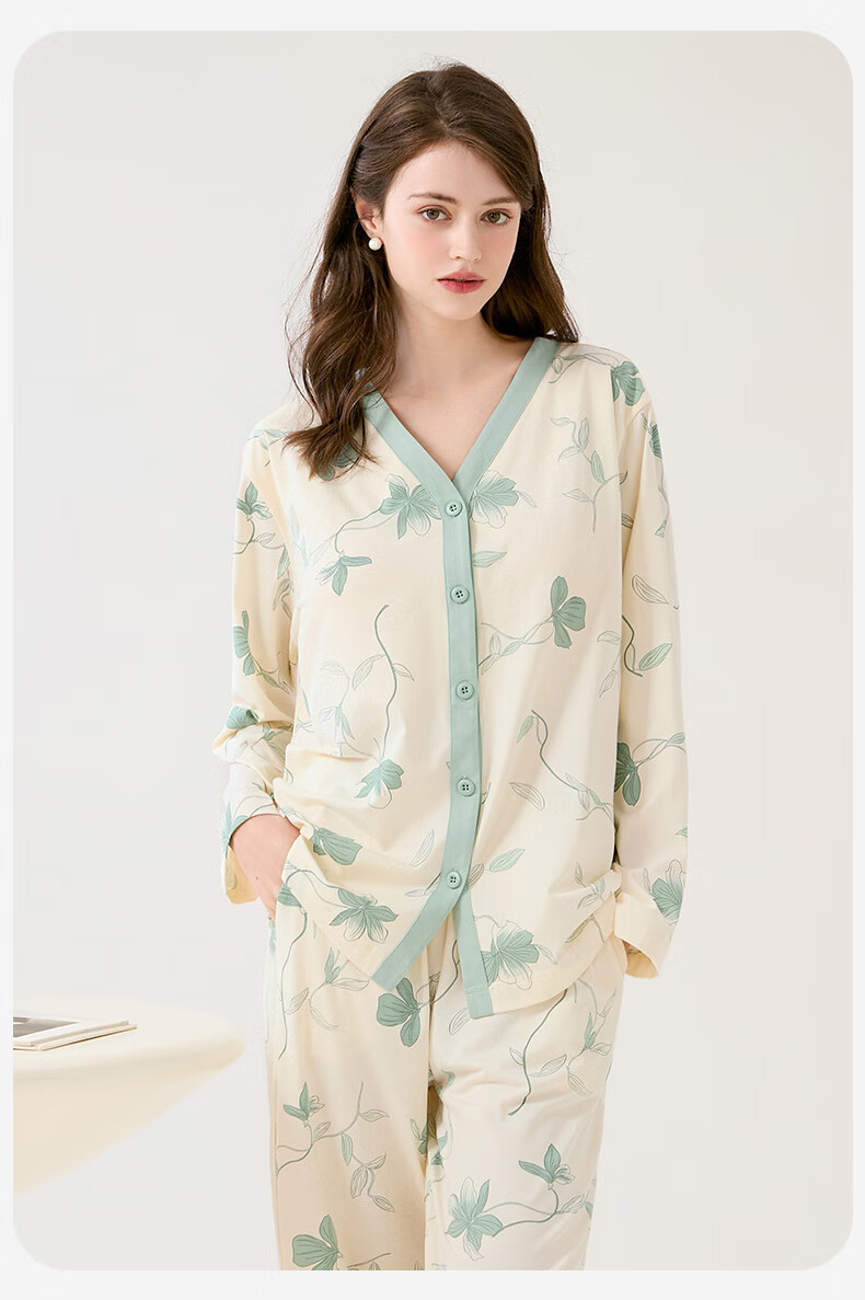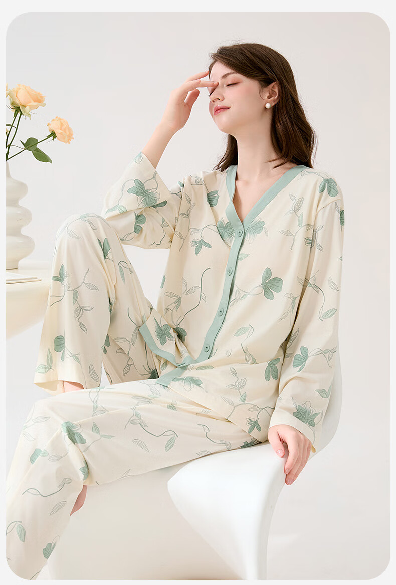 芬腾睡衣女士纯棉带胸垫新疆棉2025年春季V领开衫长袖套装软棉棉