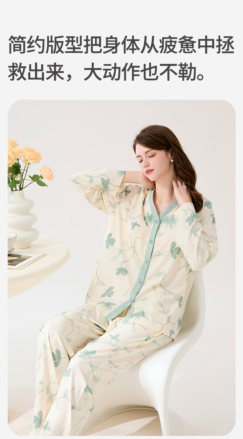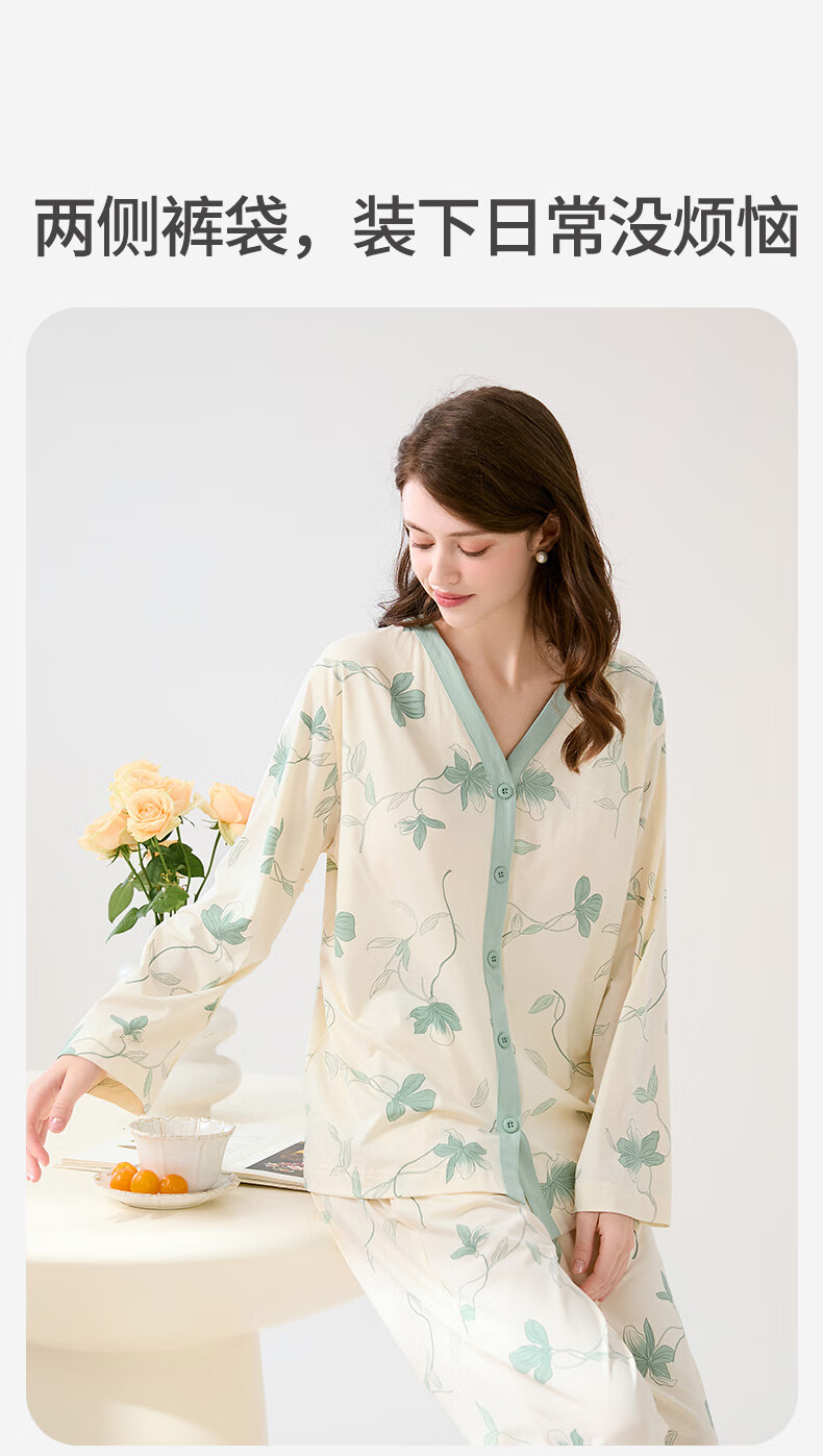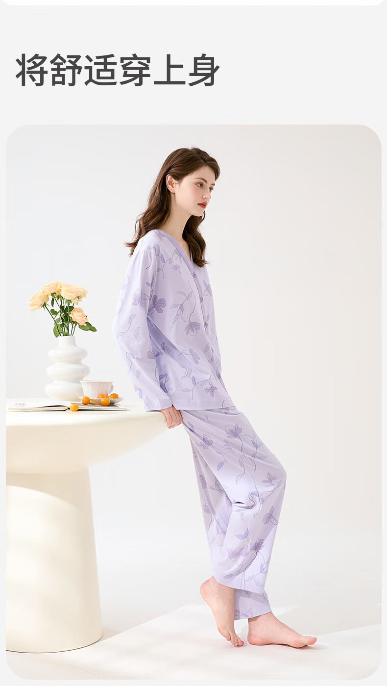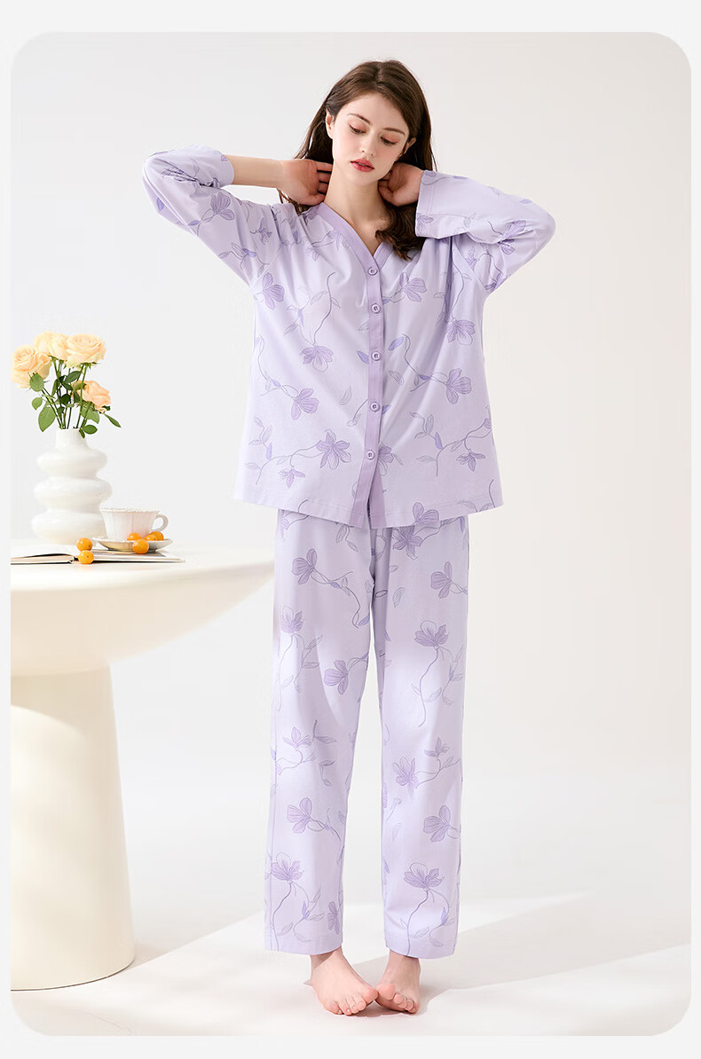 芬腾睡衣女士纯棉带胸垫新疆棉2025年春季V领开衫长袖套装软棉棉