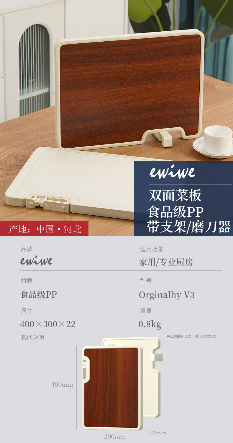EWIWE加大版菜板双面食品级PP材质可用砧板不易发霉案板揉面板光面砧板 40cm规格/食品级材质/磨刀器