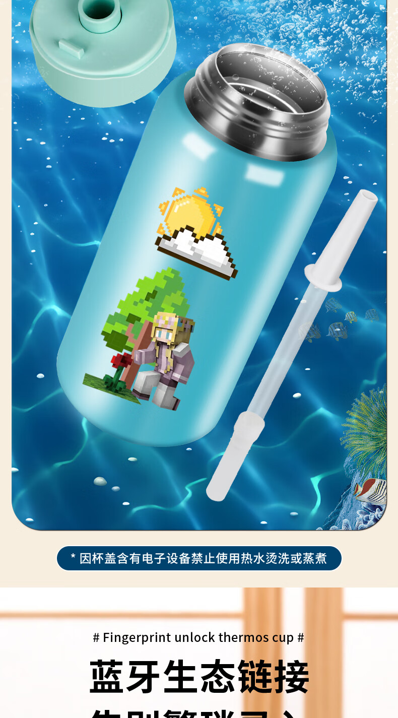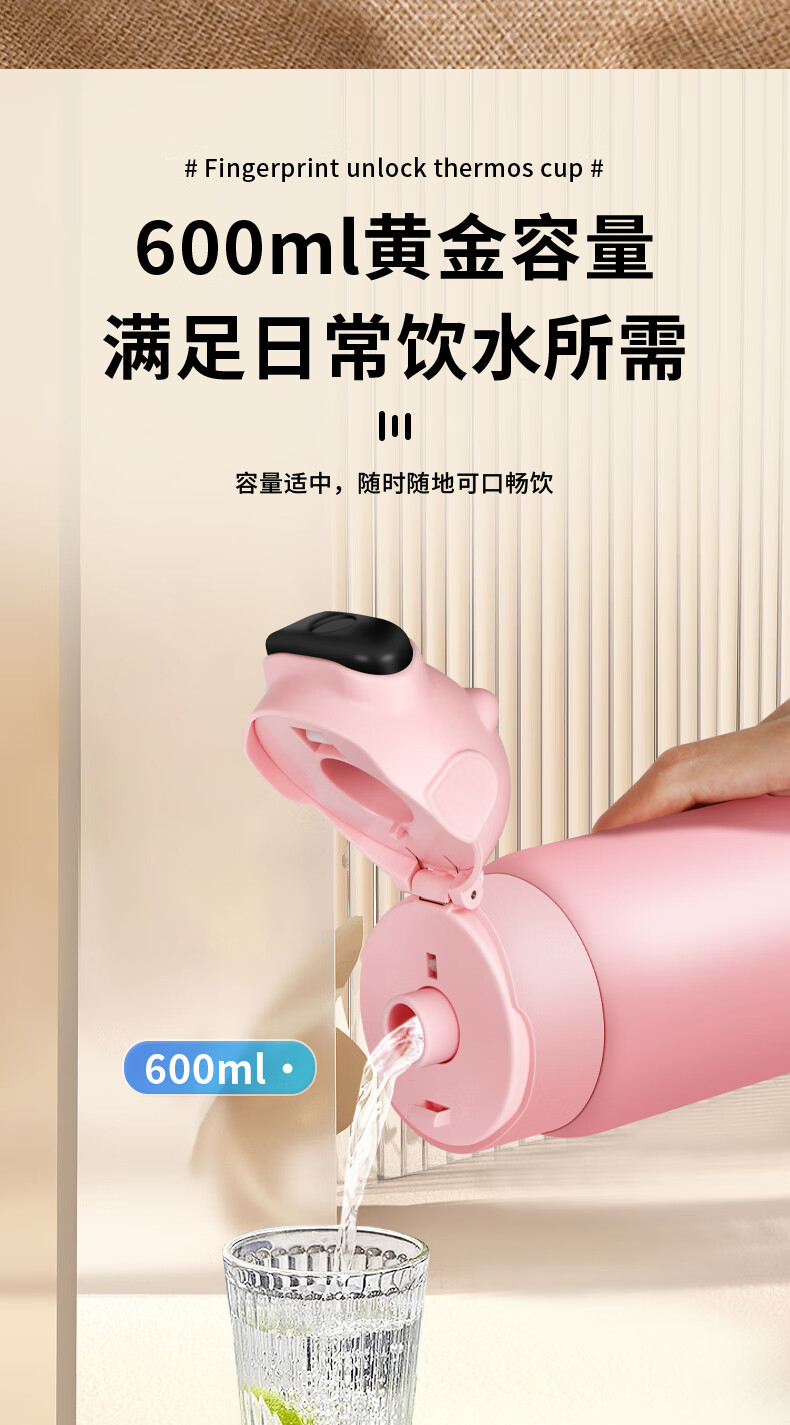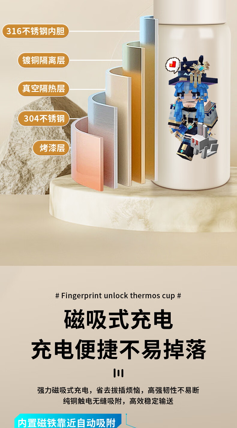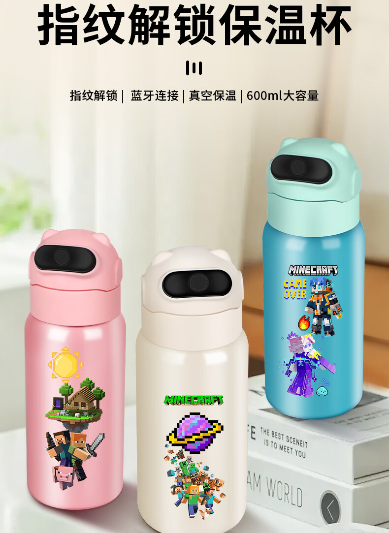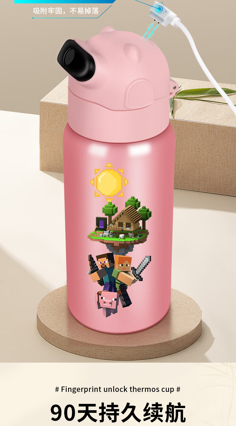 手游我的世界智能指纹解锁保温杯私密性高自带挂绳充电线防恶作剧 04粉色指纹解锁保温杯 蓝牙款Z911我的世界