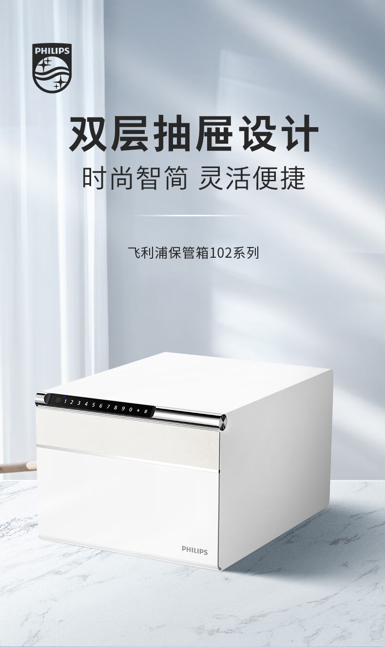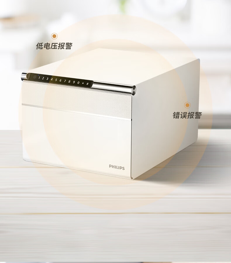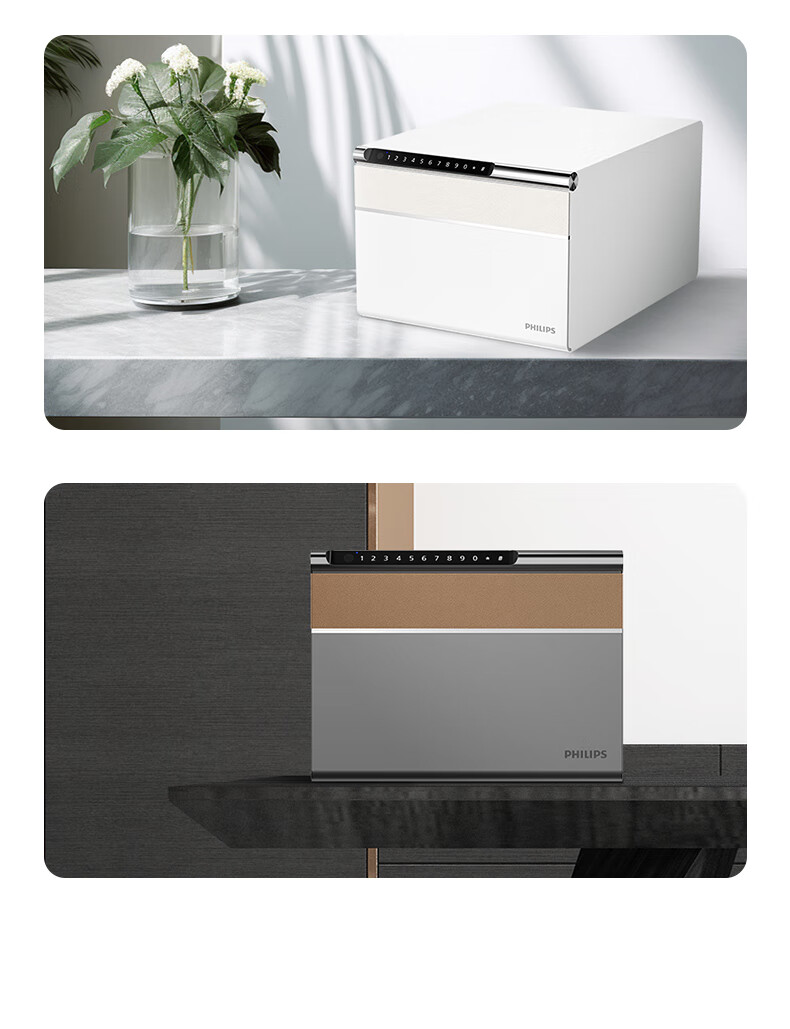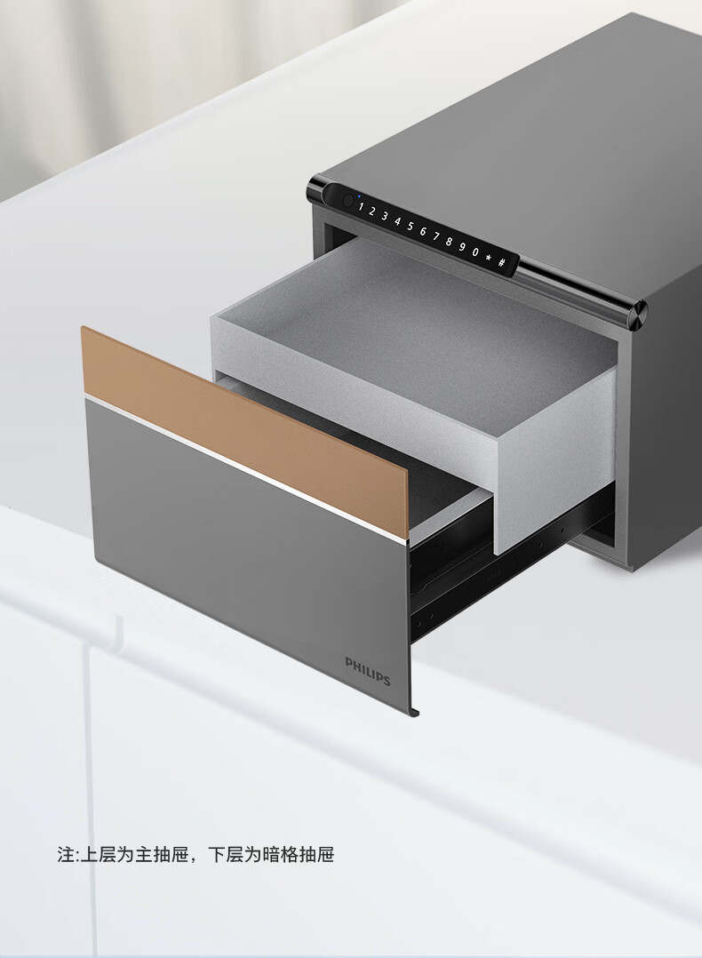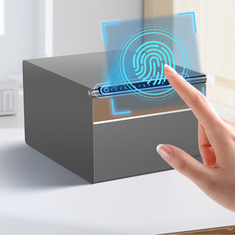 飞利浦保险柜家用办公 床头保险柜保管箱 联动式双层抽屉设计 半导体指纹密码便携保险箱 薄雾灰