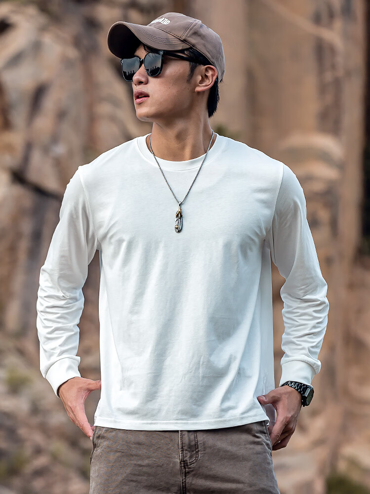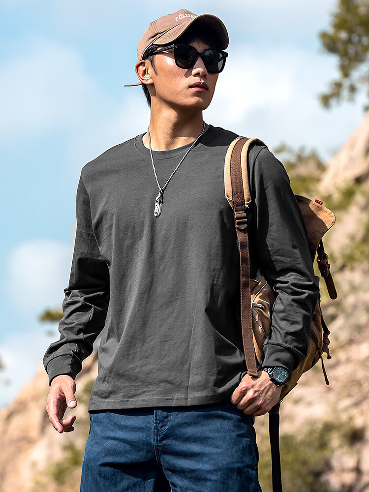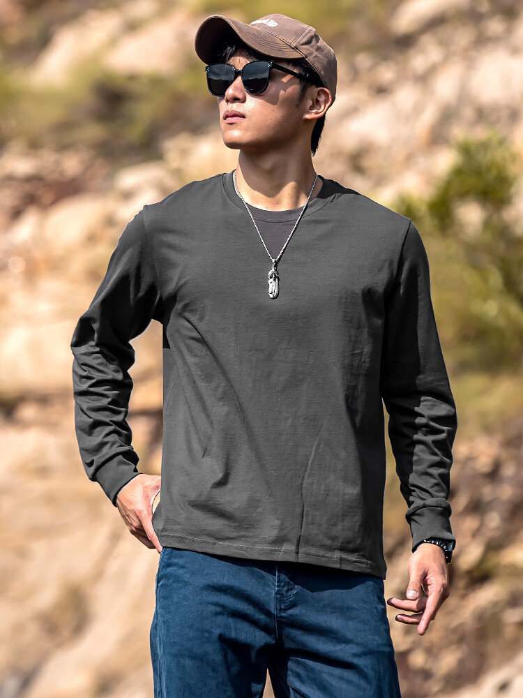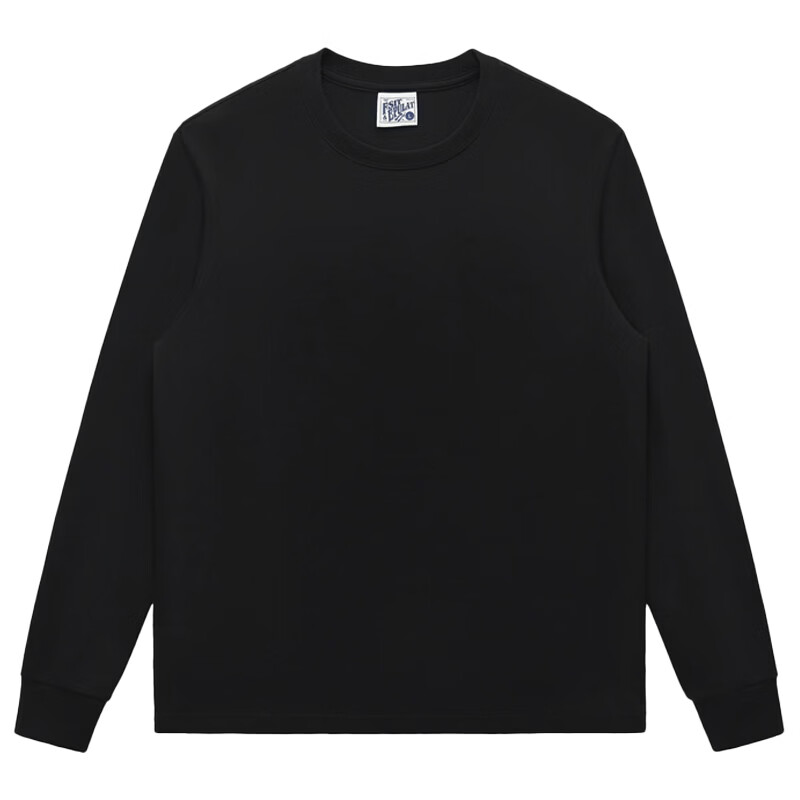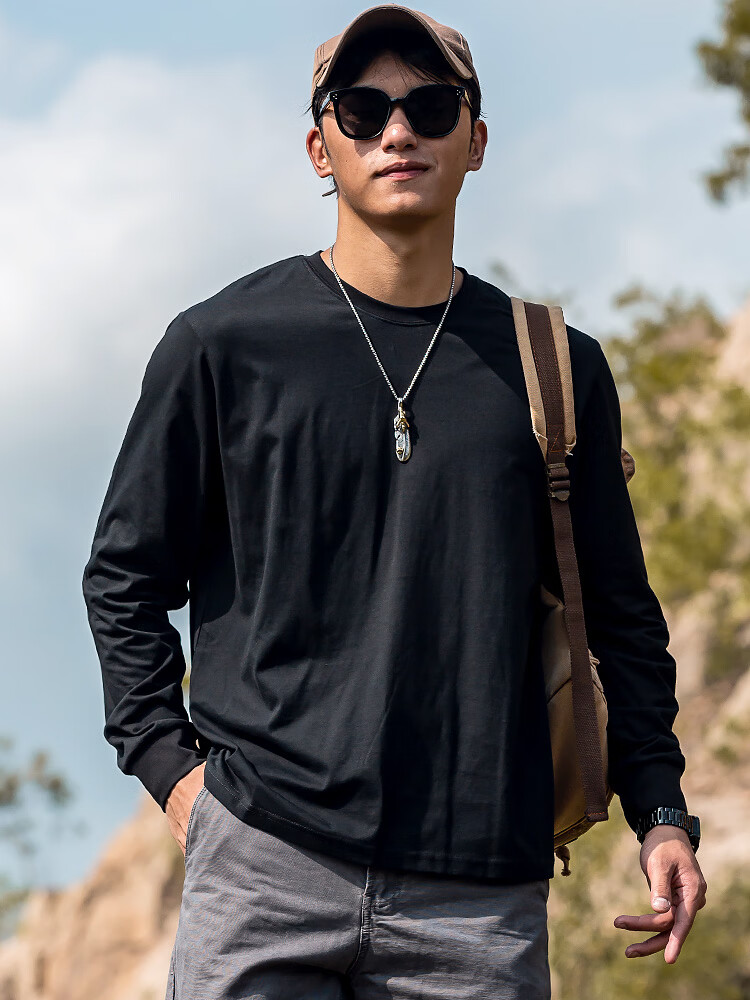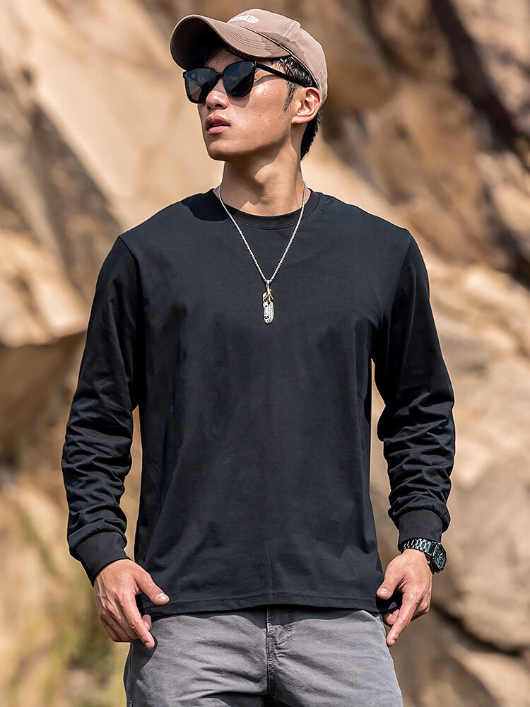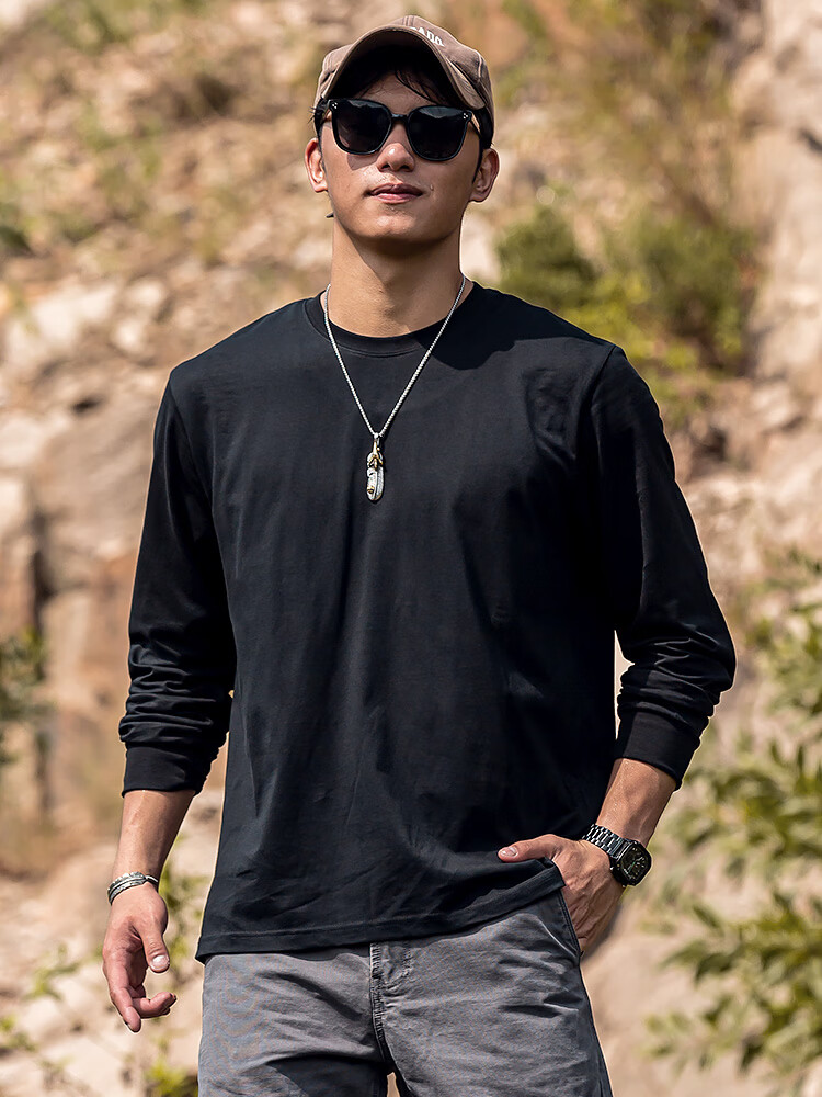 海行精梳纯棉长袖t恤男2025新款宽松透气圆领打底衫潮流百搭休闲上衣 黑色 3XL