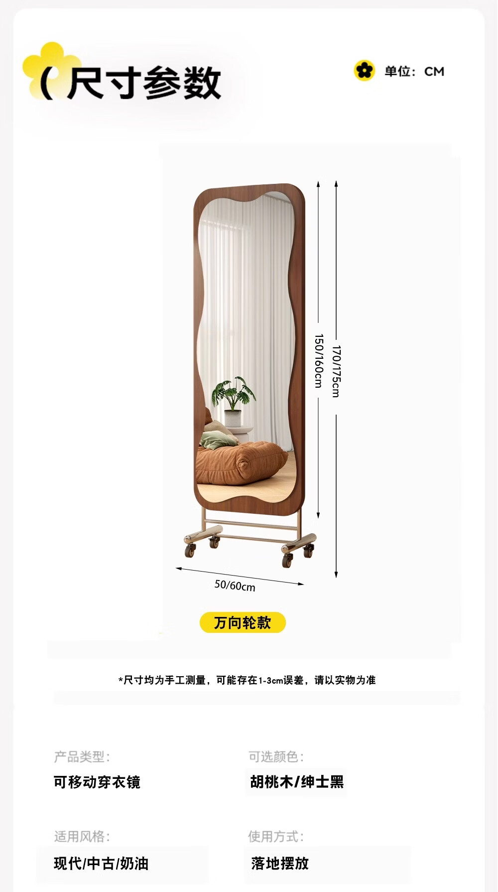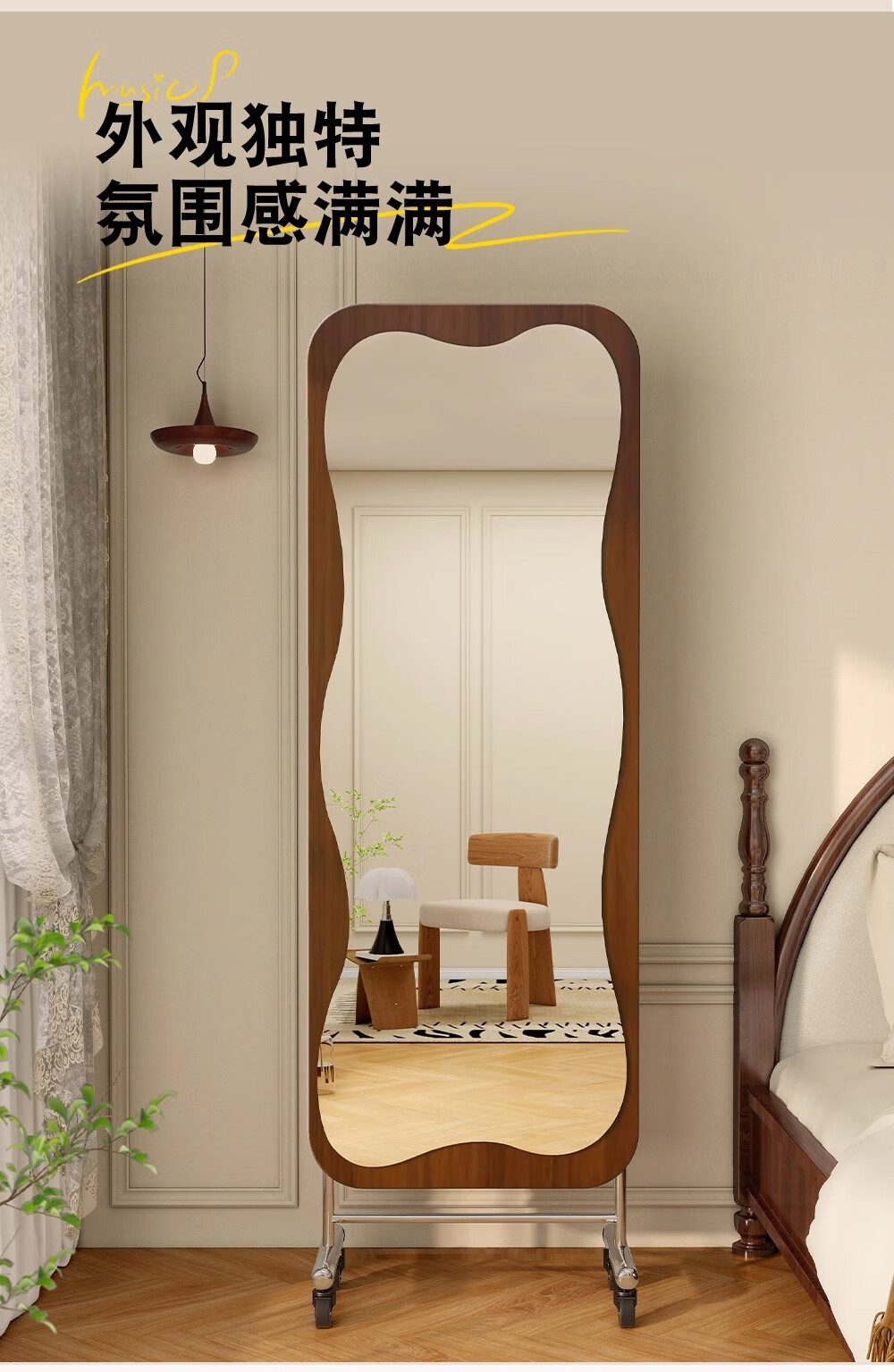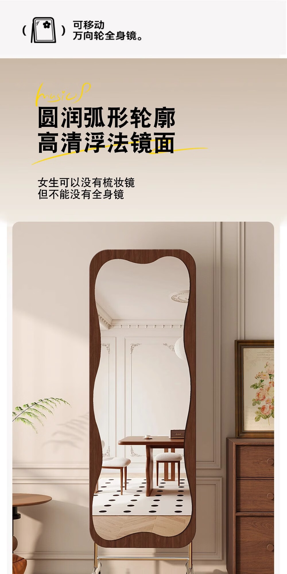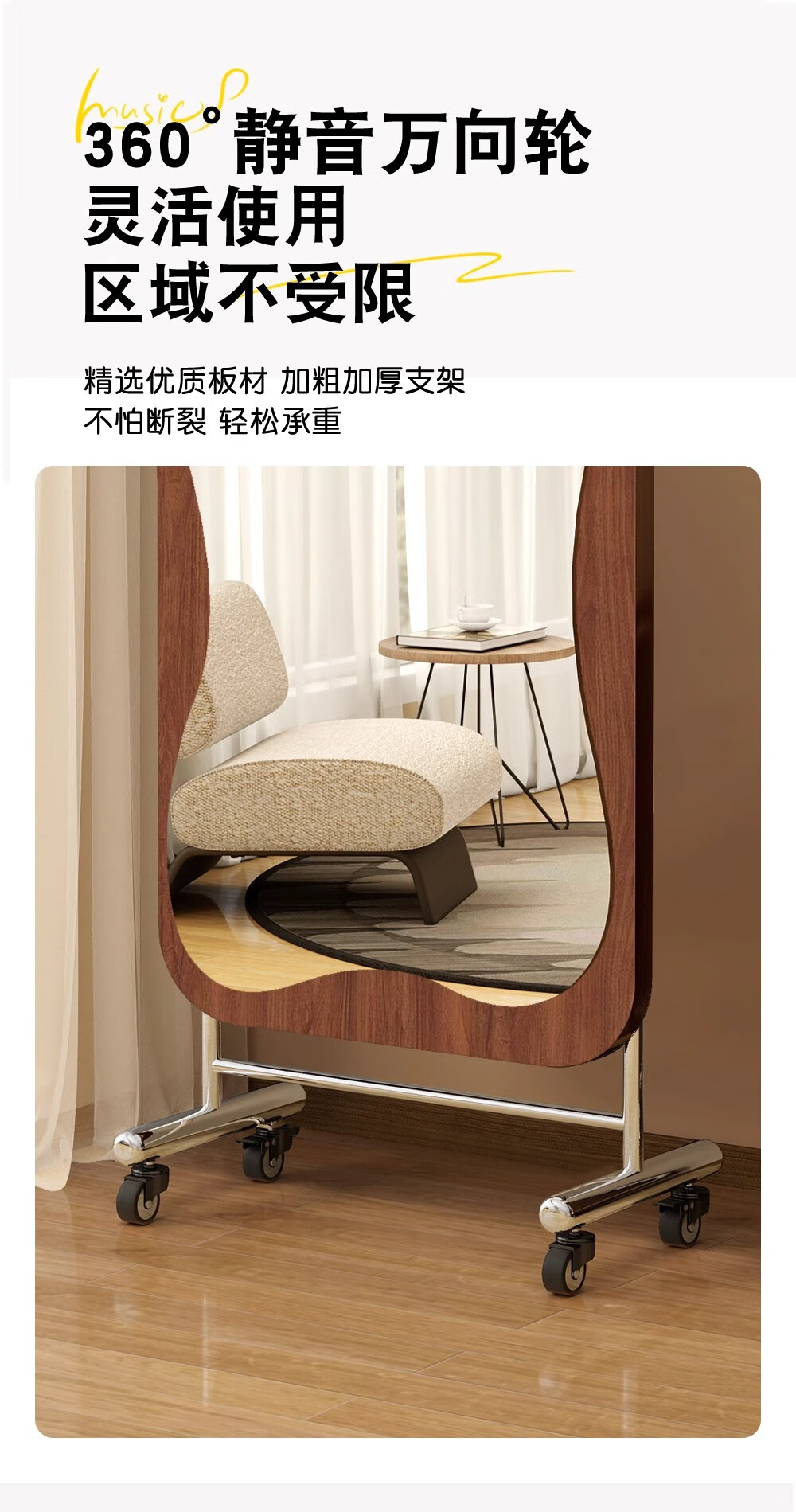 美竹乐可移动全身镜落地镜家用卧室中古风穿衣镜客厅不锈钢滑轮试衣镜子 新品首发【不锈钢滑轮】胡桃色50*150