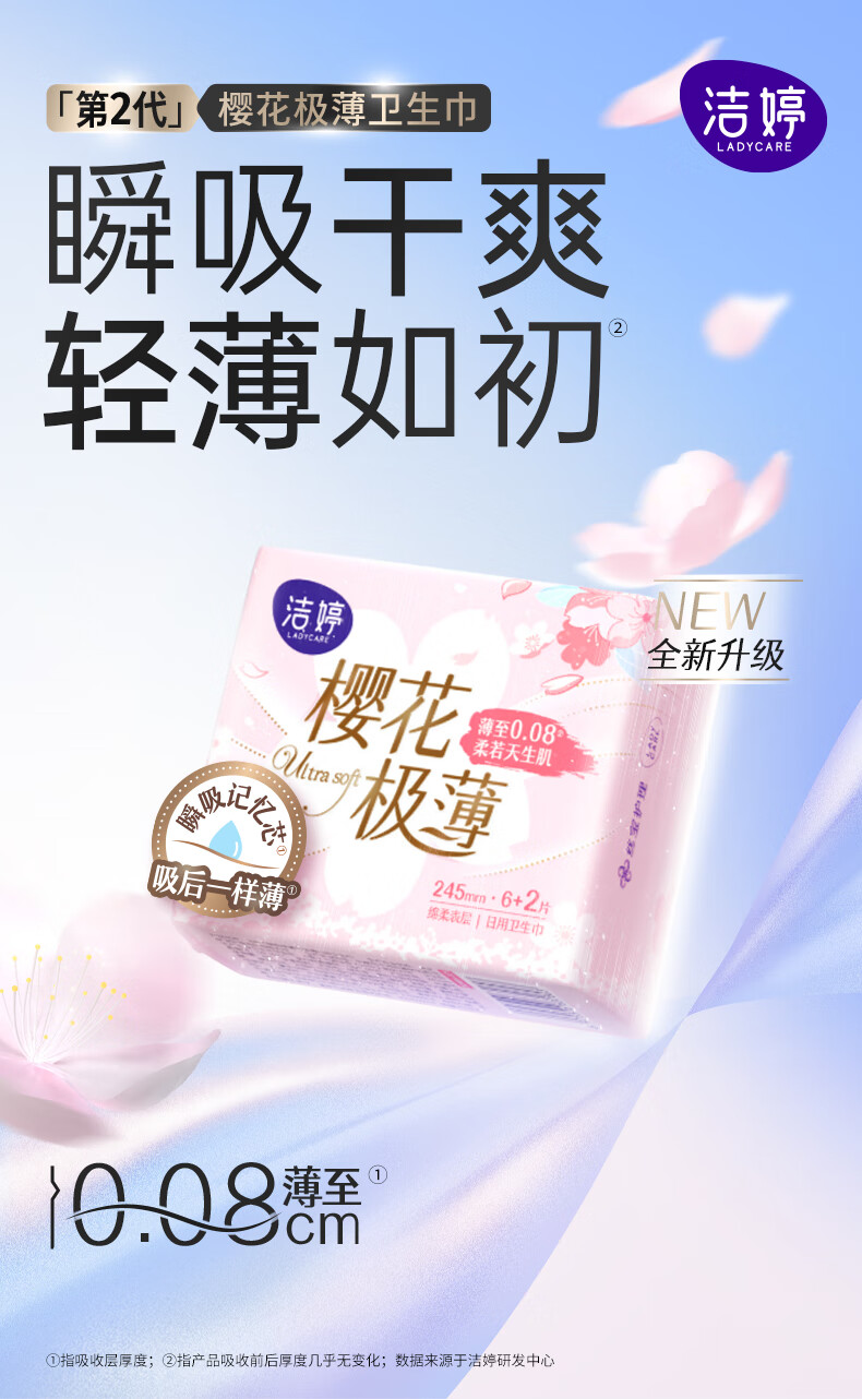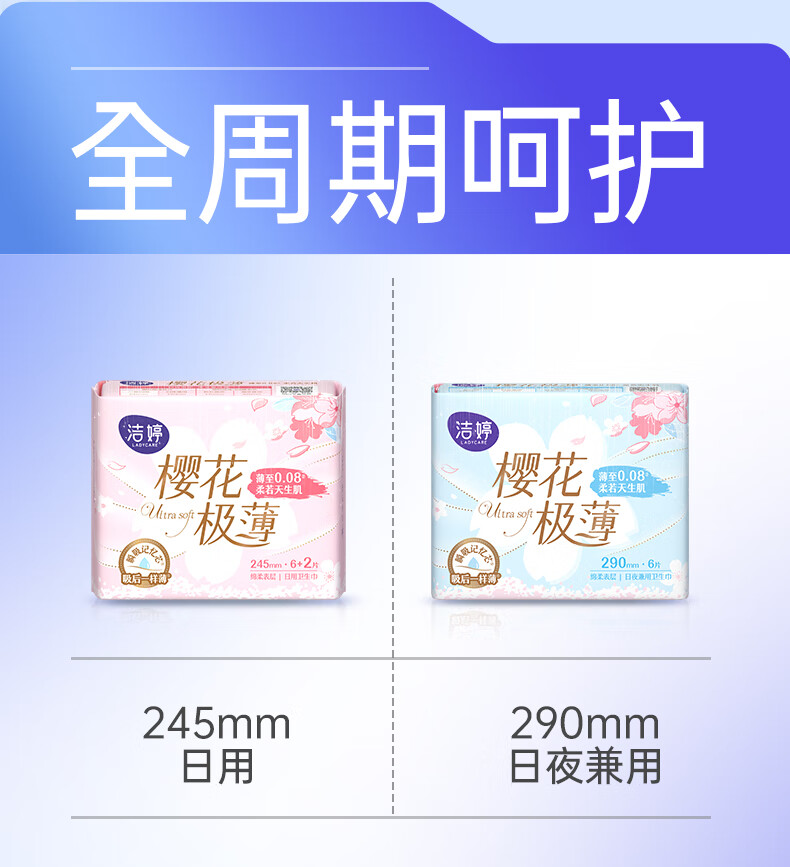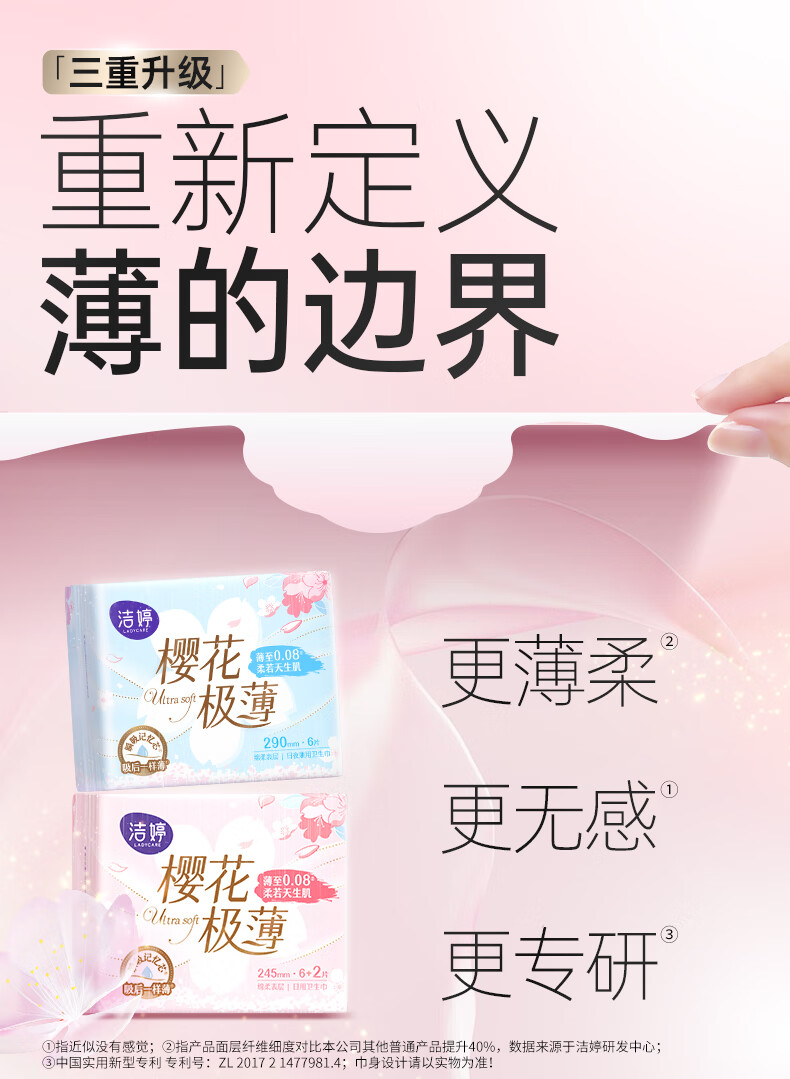 洁婷日用夜用卫生巾姨妈巾品牌直供安心品质【任选7件】 樱花极薄日用245mm8片