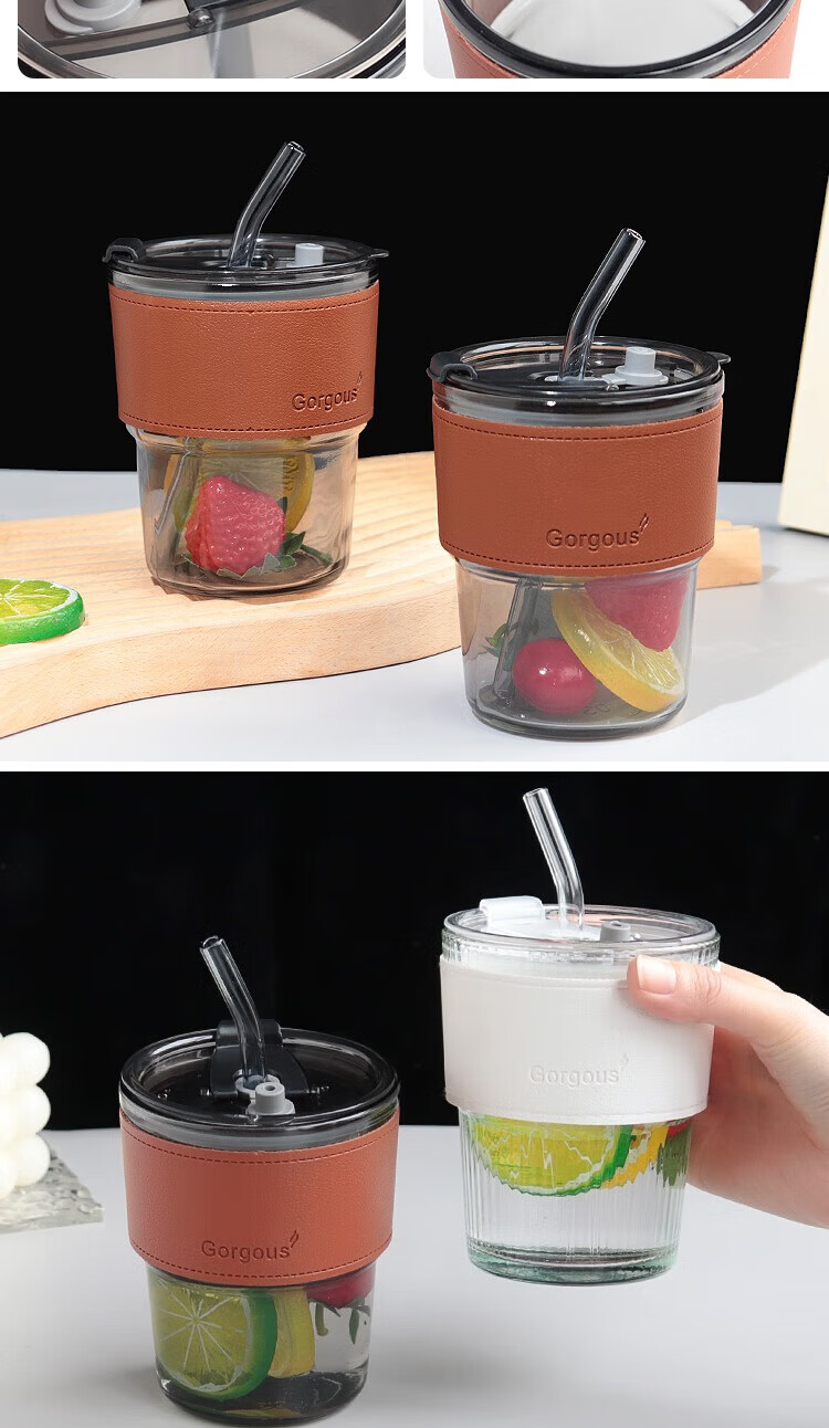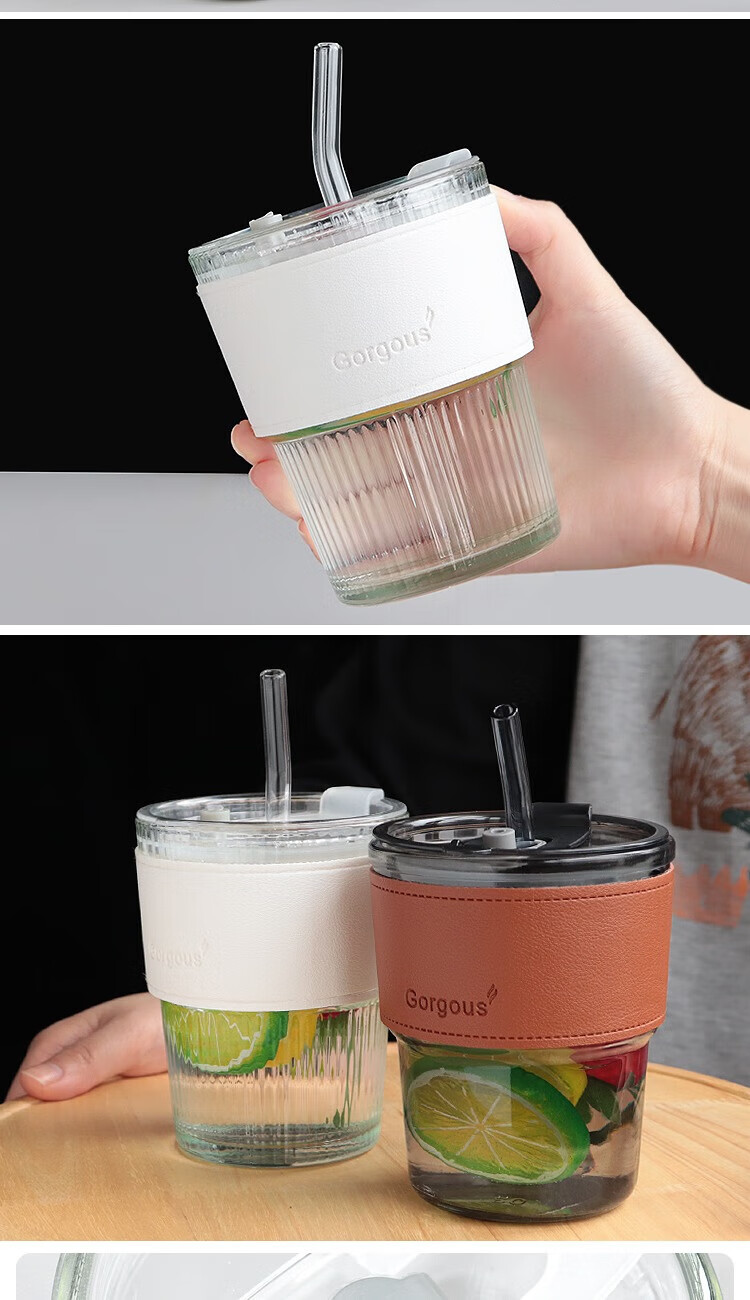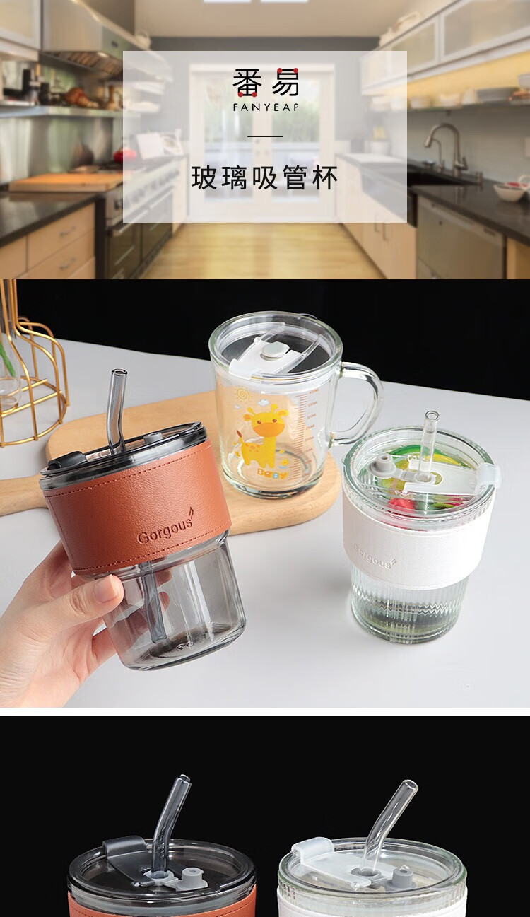 番易值吸管式杯子小巧便携带盖随手家用水杯咖啡杯高颜杯玻璃吸管杯 透明图案400ml 1套 400ml