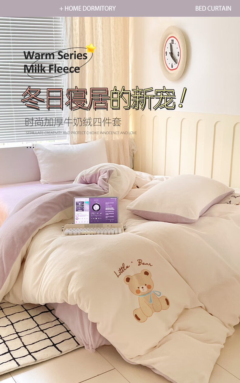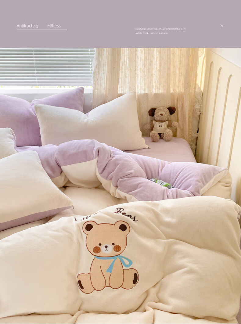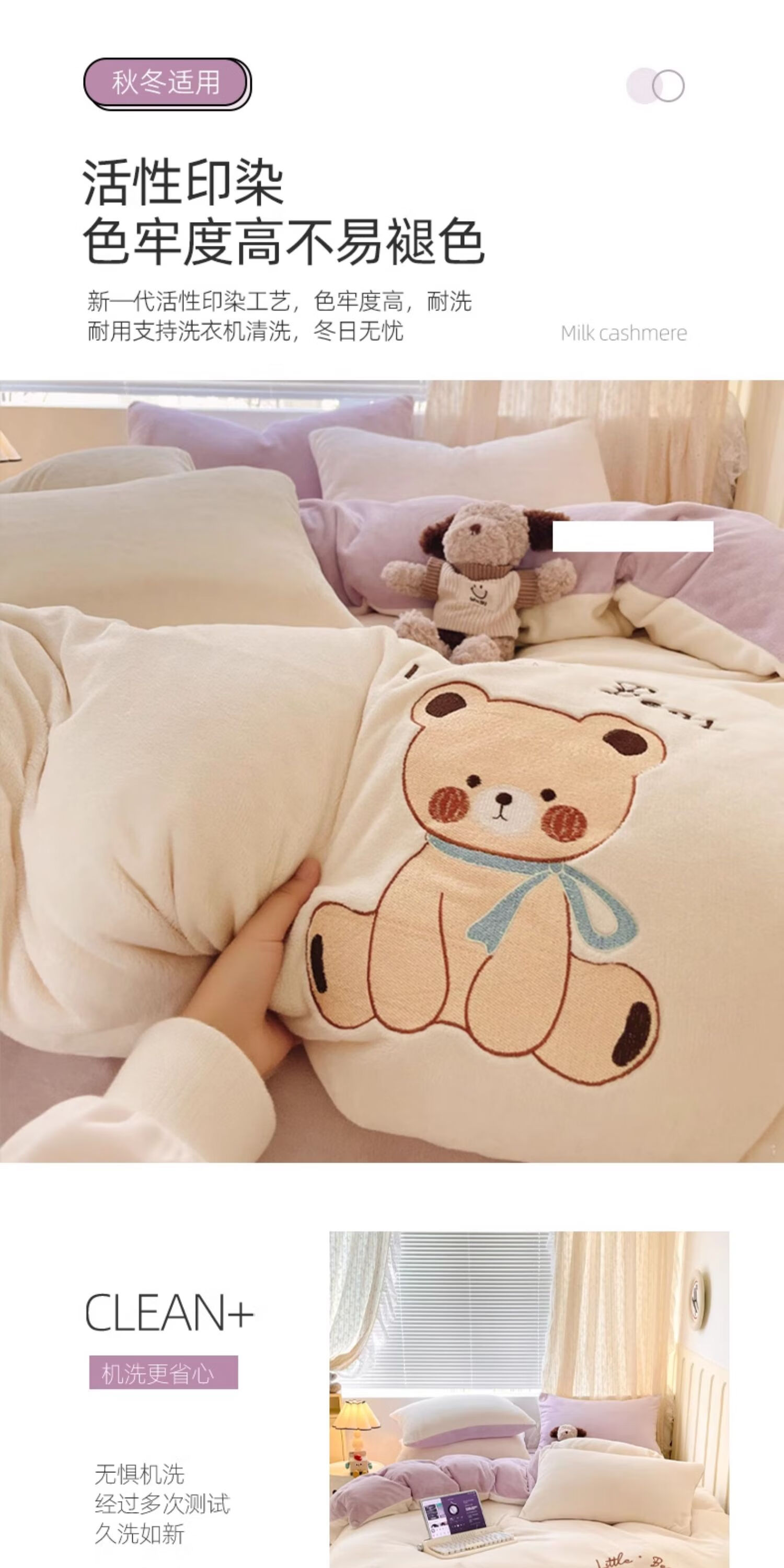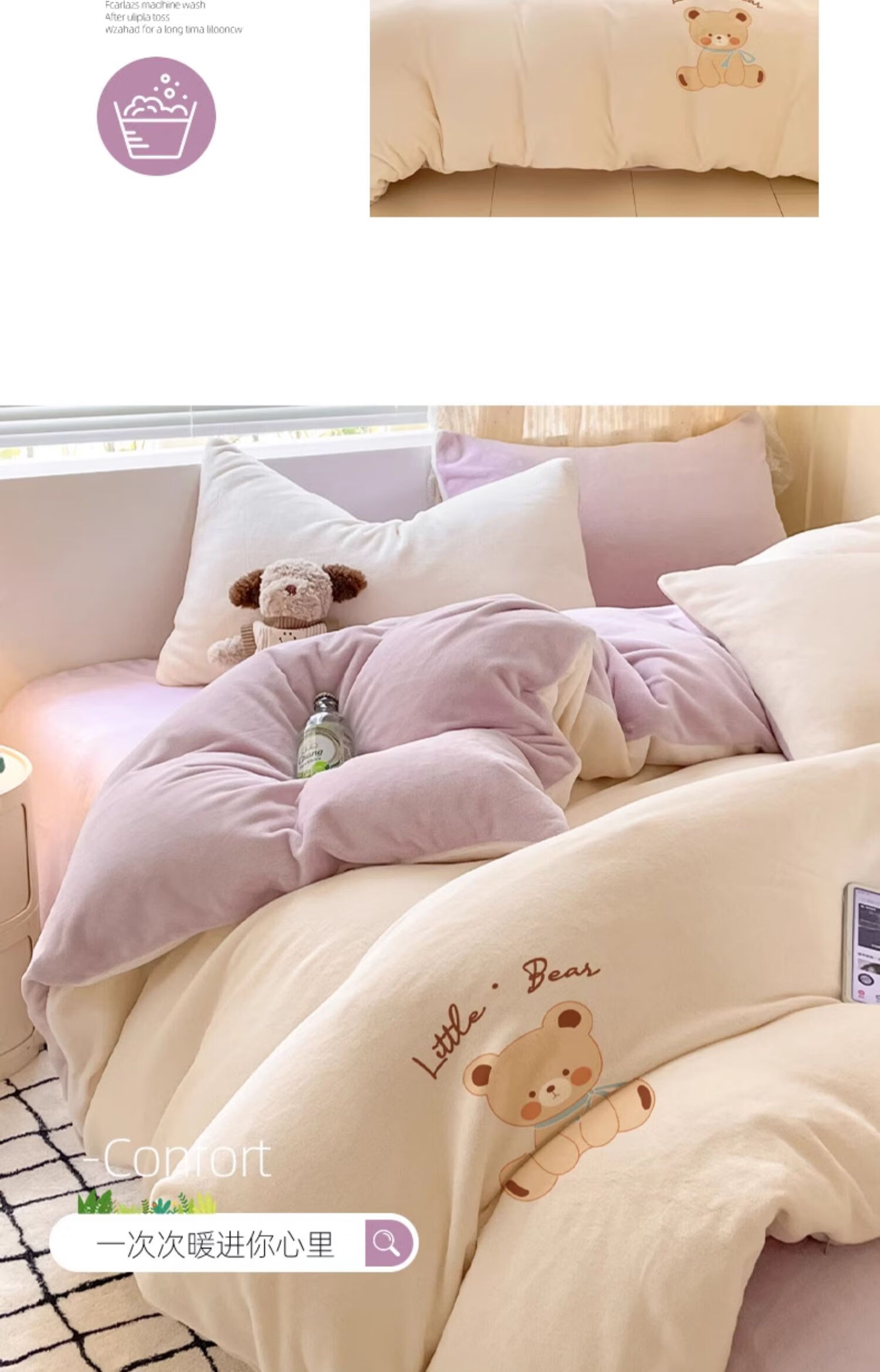 高睿牛奶绒四件套床上加厚毛绒珊瑚绒水晶绒双面被套法兰绒床单三件套 刺绣小熊-奶油米【抗菌抑菌丨加绒加厚丨亲肤细腻】 床单款 (被套220*240cm) 2.0m四件套
