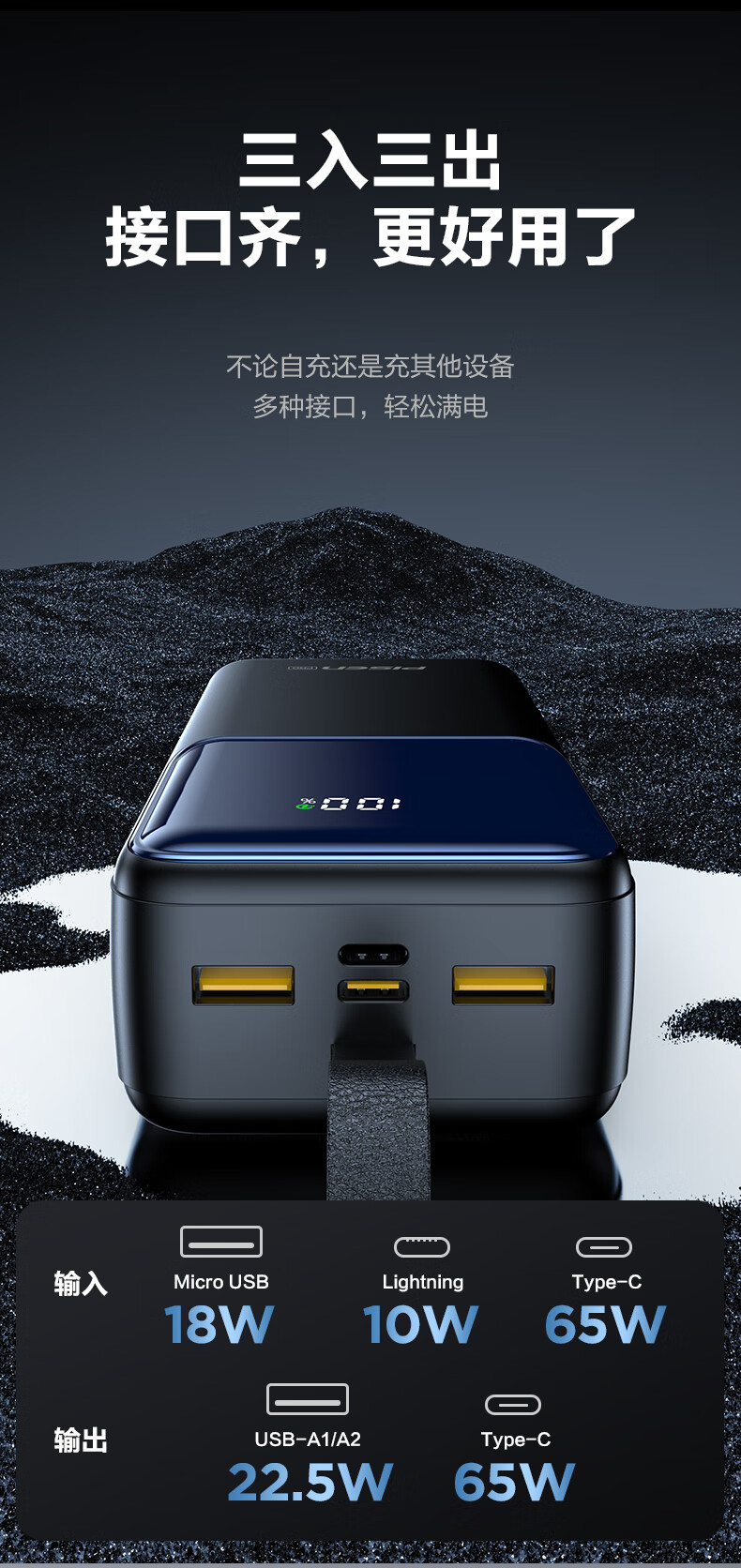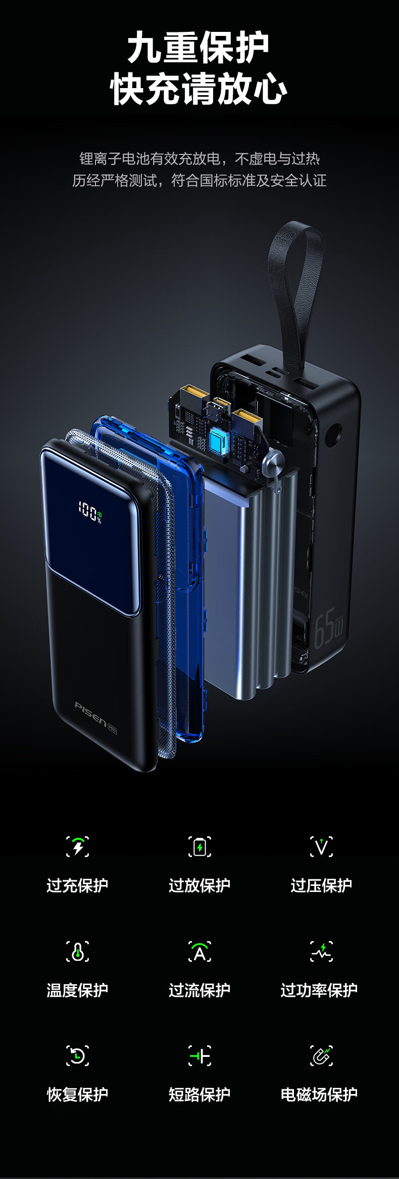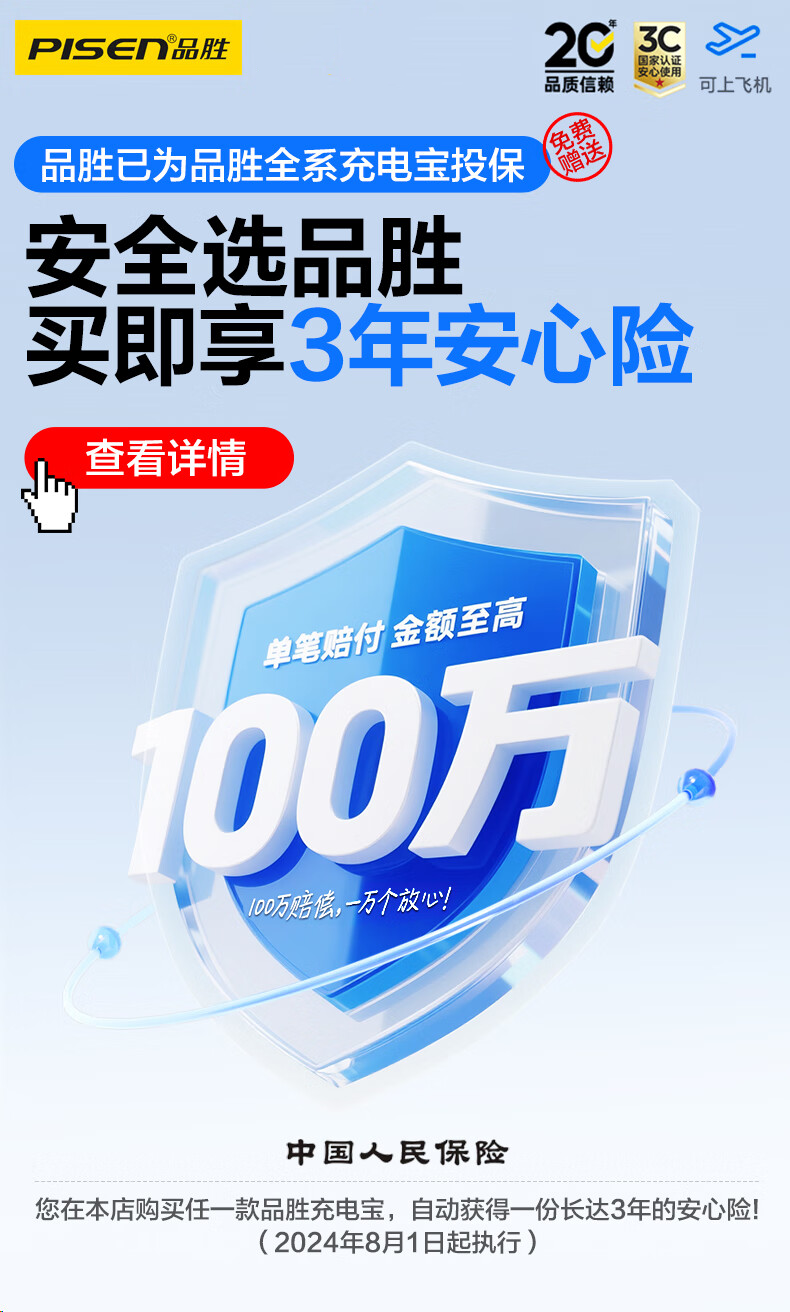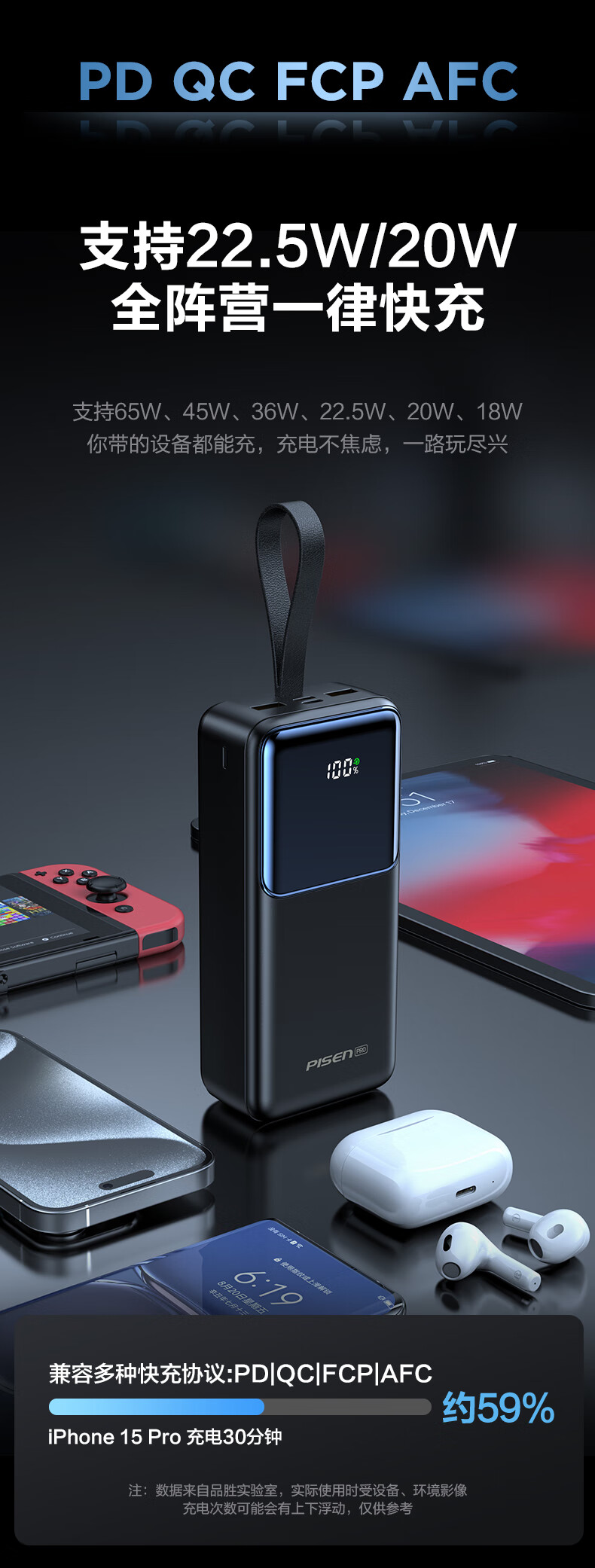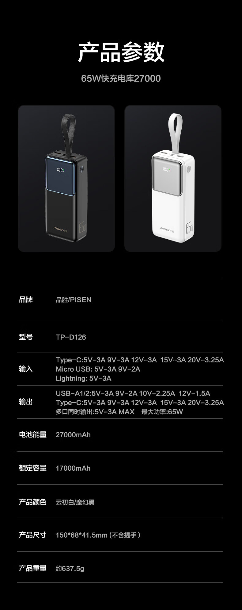 品胜(PISEN)3C认证充电宝65W可上飞机双向快充27000mAh大容量便携移动电源苹果17promax华为小米笔记本电脑 白色【65W快充|27000毫安】