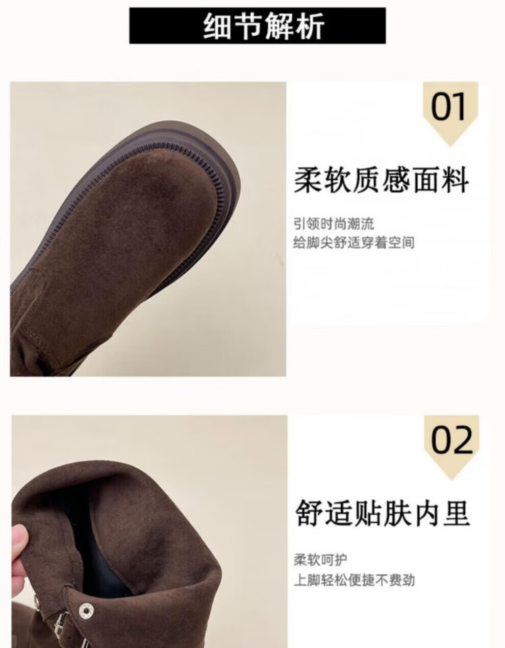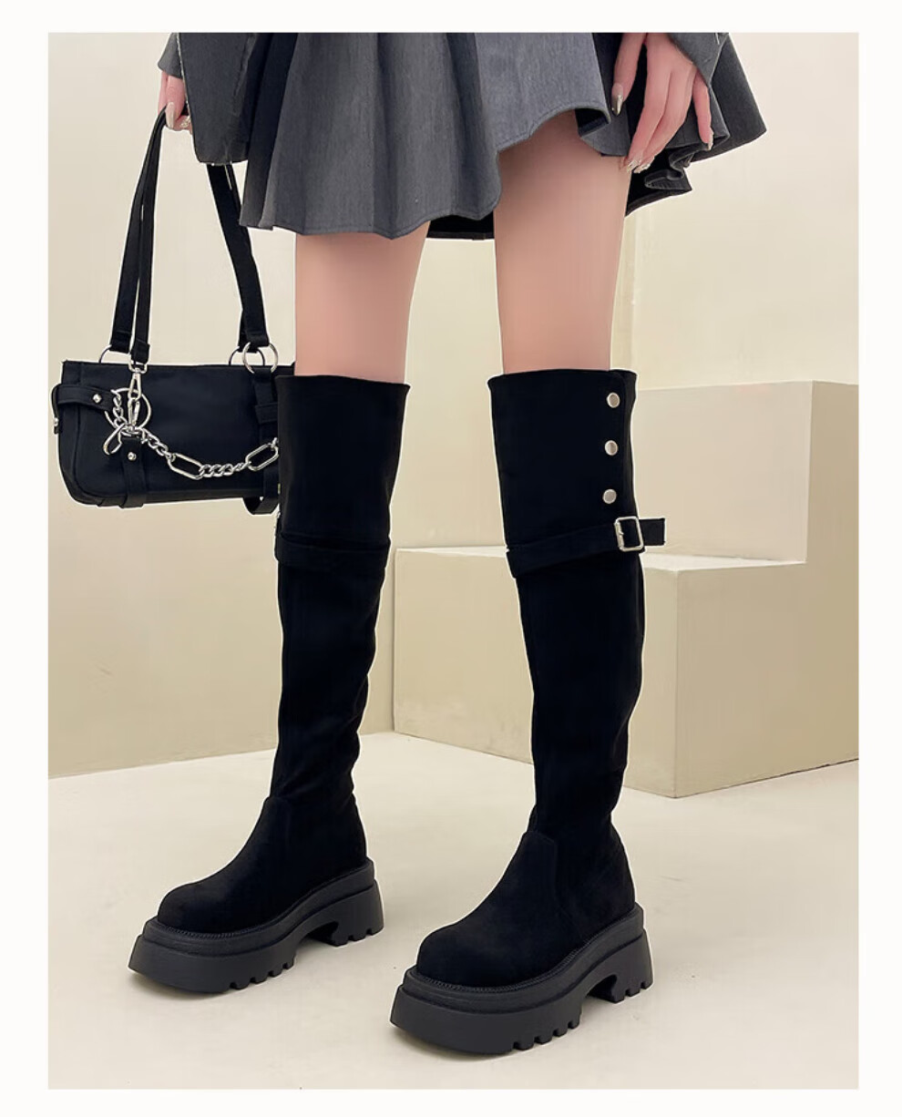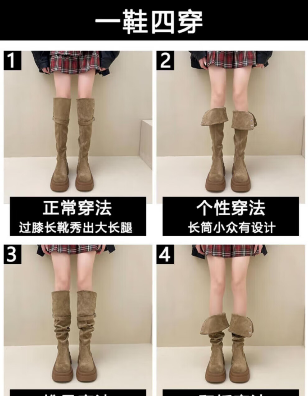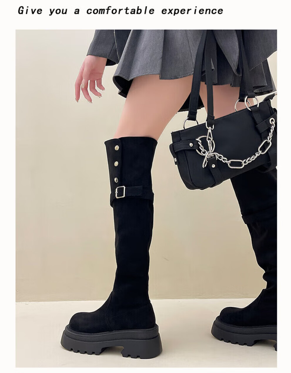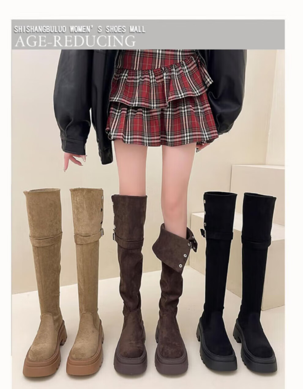 惠奴比厚底显瘦绒面堆堆弹力靴过膝靴子女2025秋冬新款两穿长筒靴时装靴 黑色【热卖升级款】 39