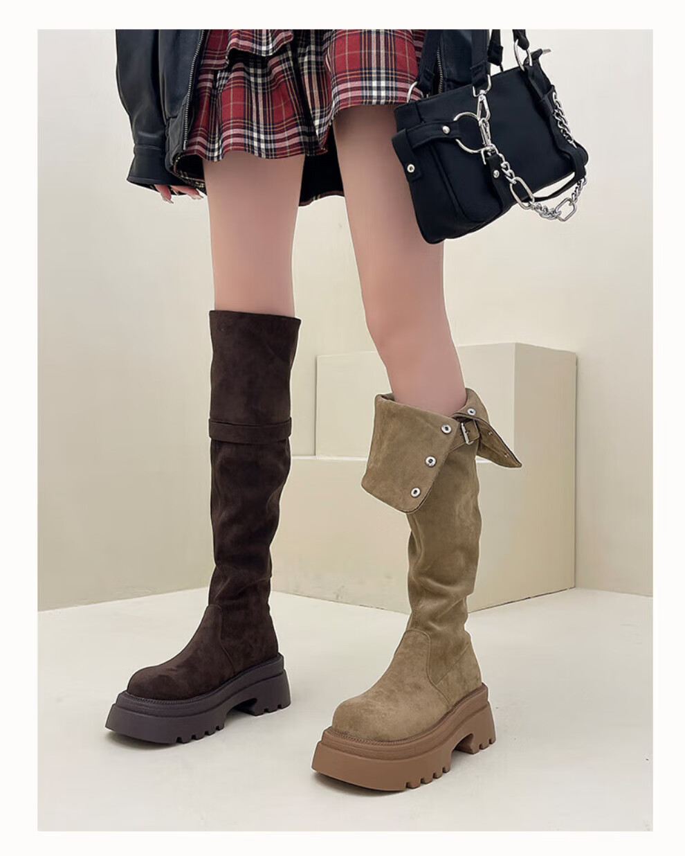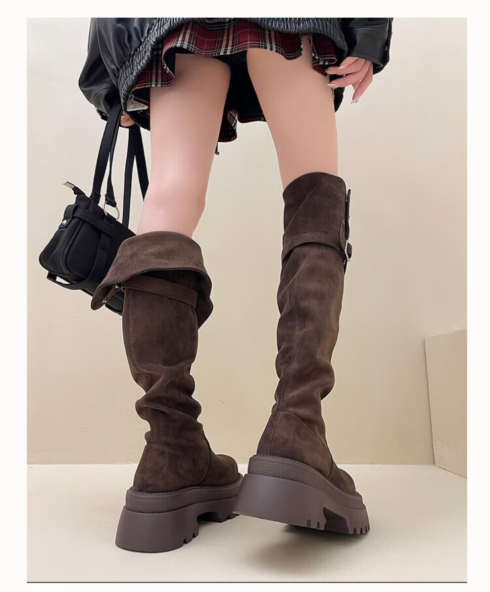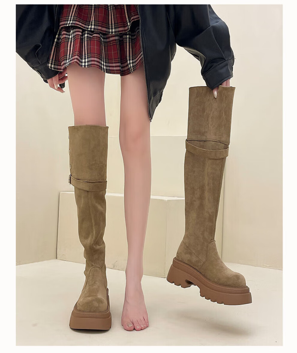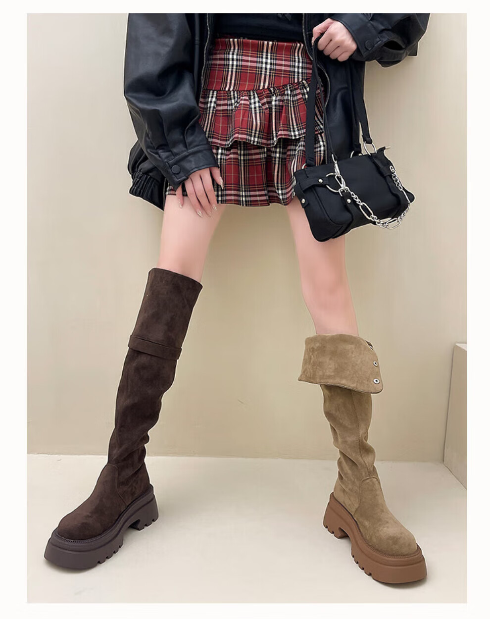 惠奴比厚底显瘦绒面堆堆弹力靴过膝靴子女2025秋冬新款两穿长筒靴时装靴 黑色【加绒款】 39