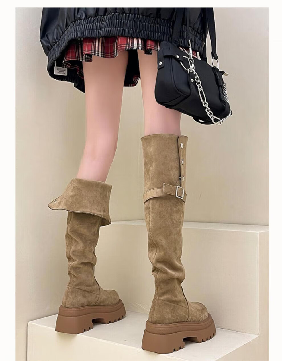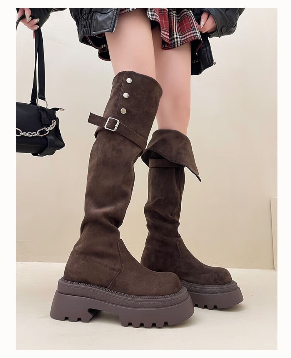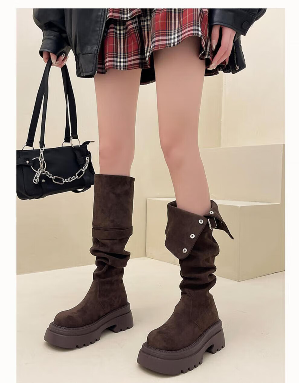 惠奴比厚底显瘦绒面堆堆弹力靴过膝靴子女2025秋冬新款两穿长筒靴时装靴 黑色【加绒款】 39