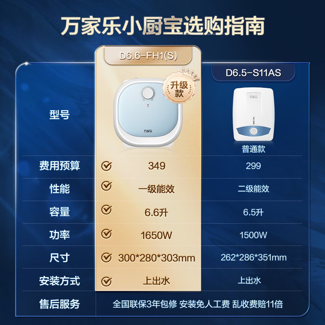 万家乐小厨宝【节能大师FH1(S)安全防电】6.6升一级能效1650W速热防电墙上出水电热水器家用D6.6-FH1(S)