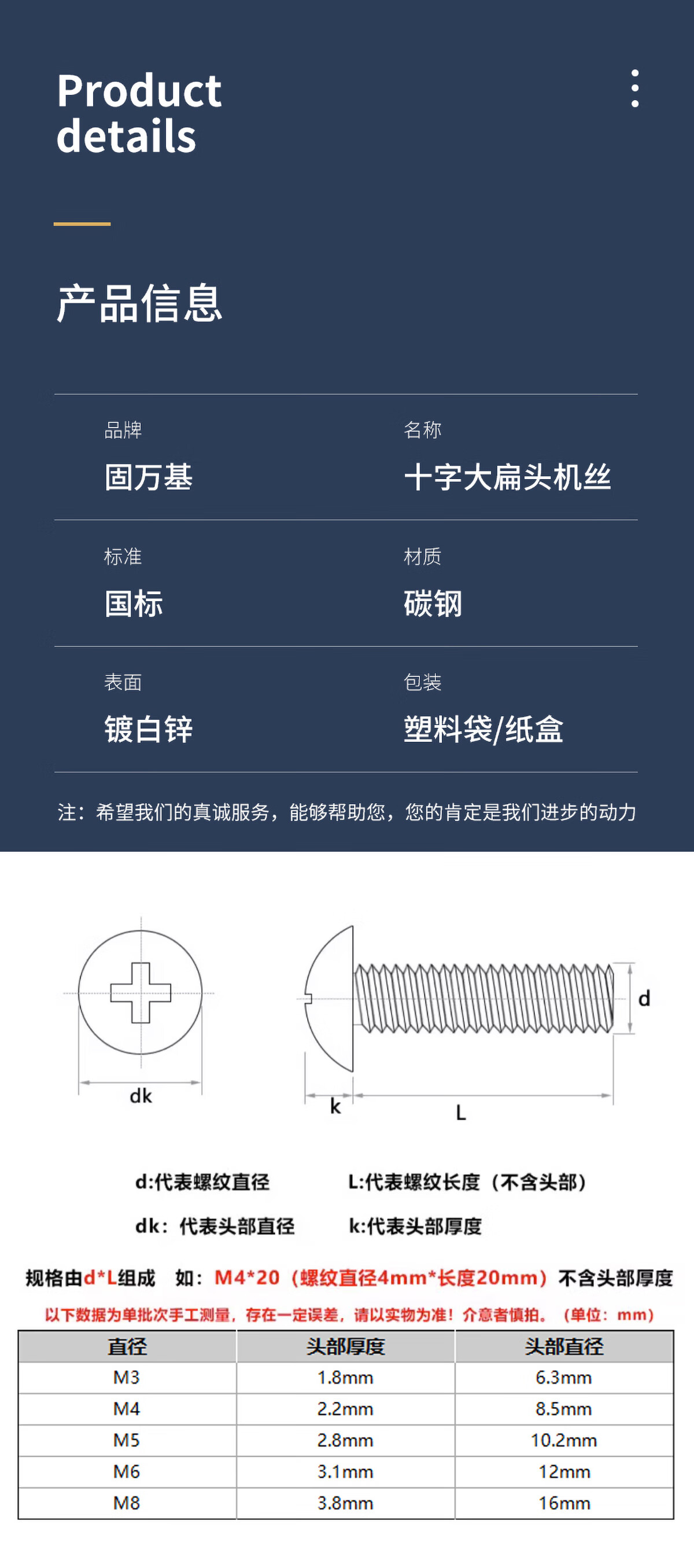 固万基(GUWANJI)铁镀锌十字大扁头螺丝圆头伞头螺栓蘑菇头螺钉M3M4M5M6M8 M3x4[2000个]