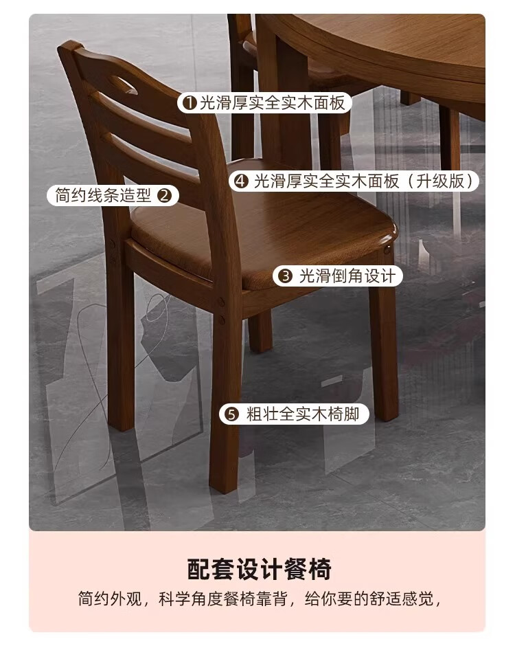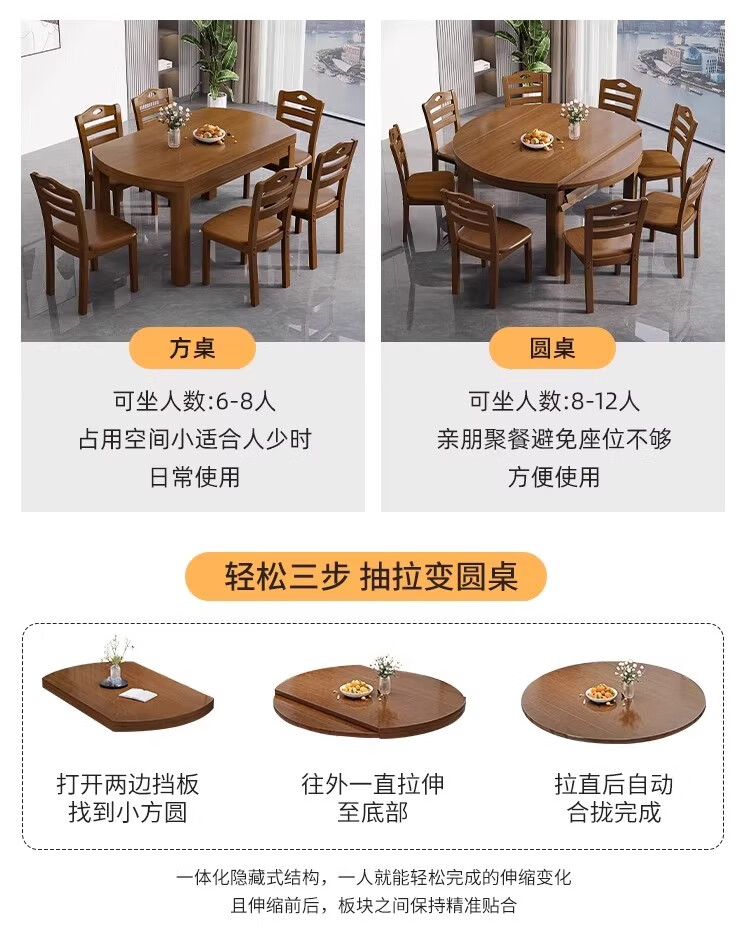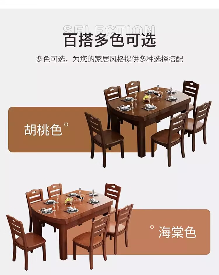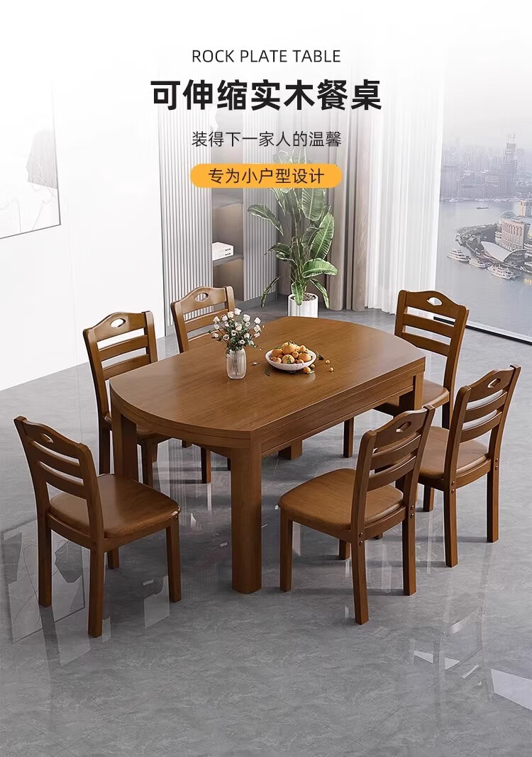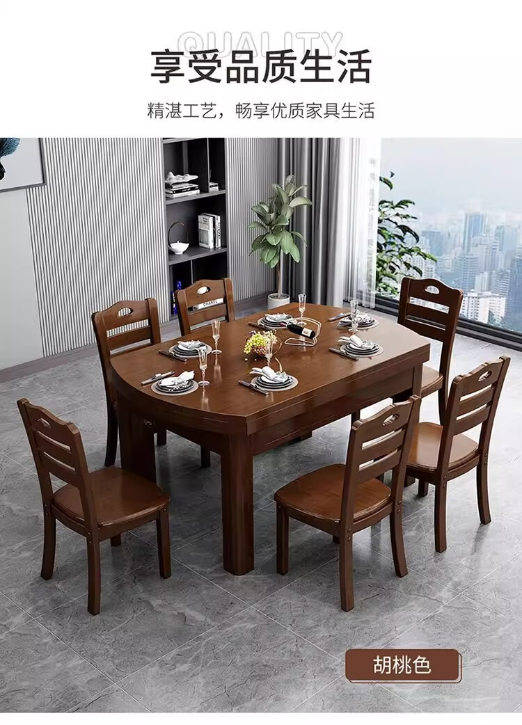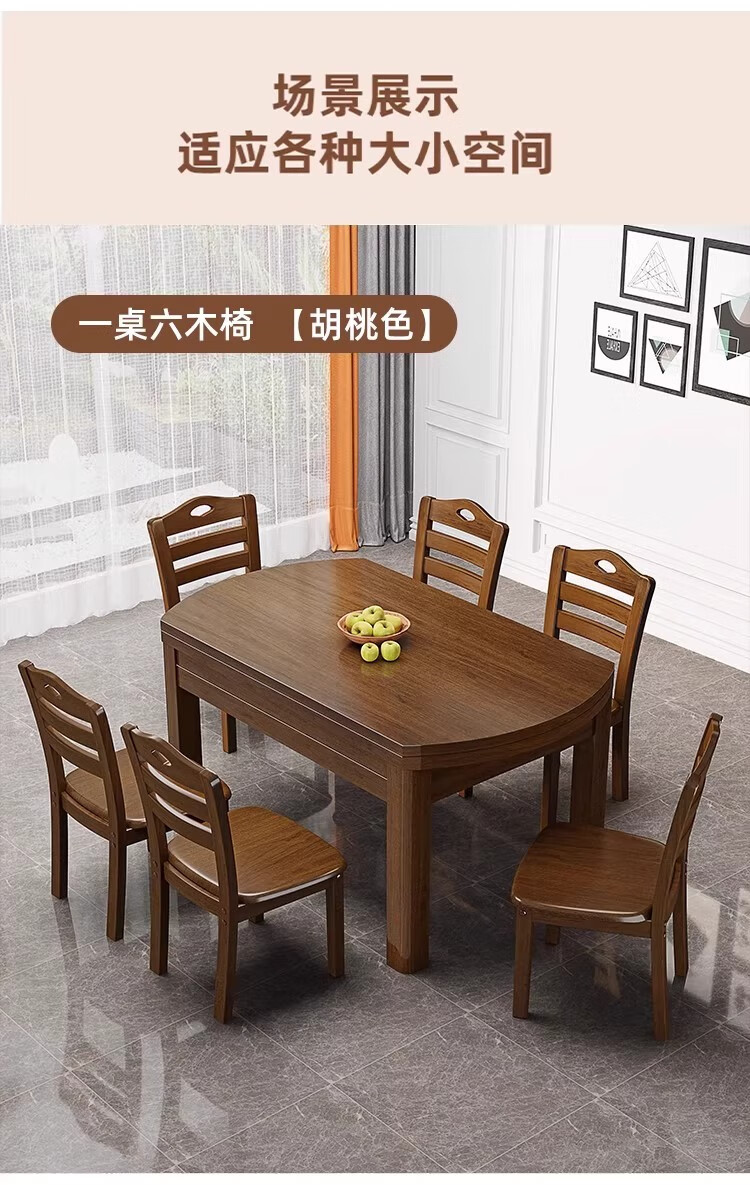 木斌全实木餐桌椅子组合现代中式吃饭桌子可伸缩折叠餐桌圆桌餐厅家具 【全实木胡桃色 】一桌6椅 138*86*76cm