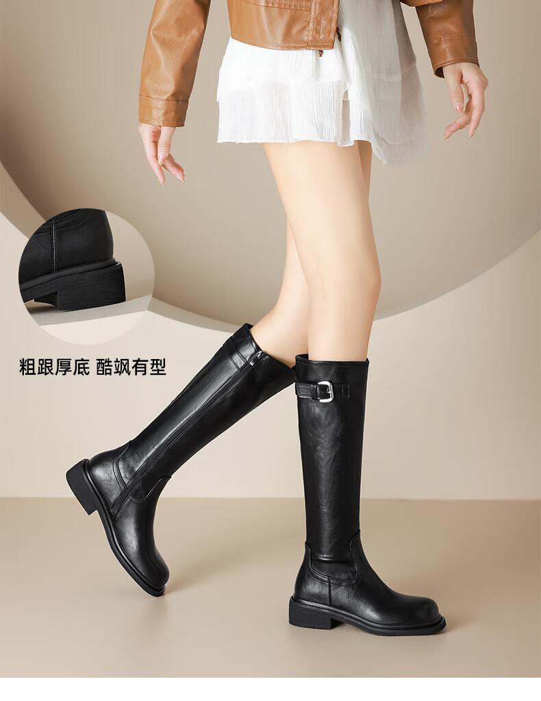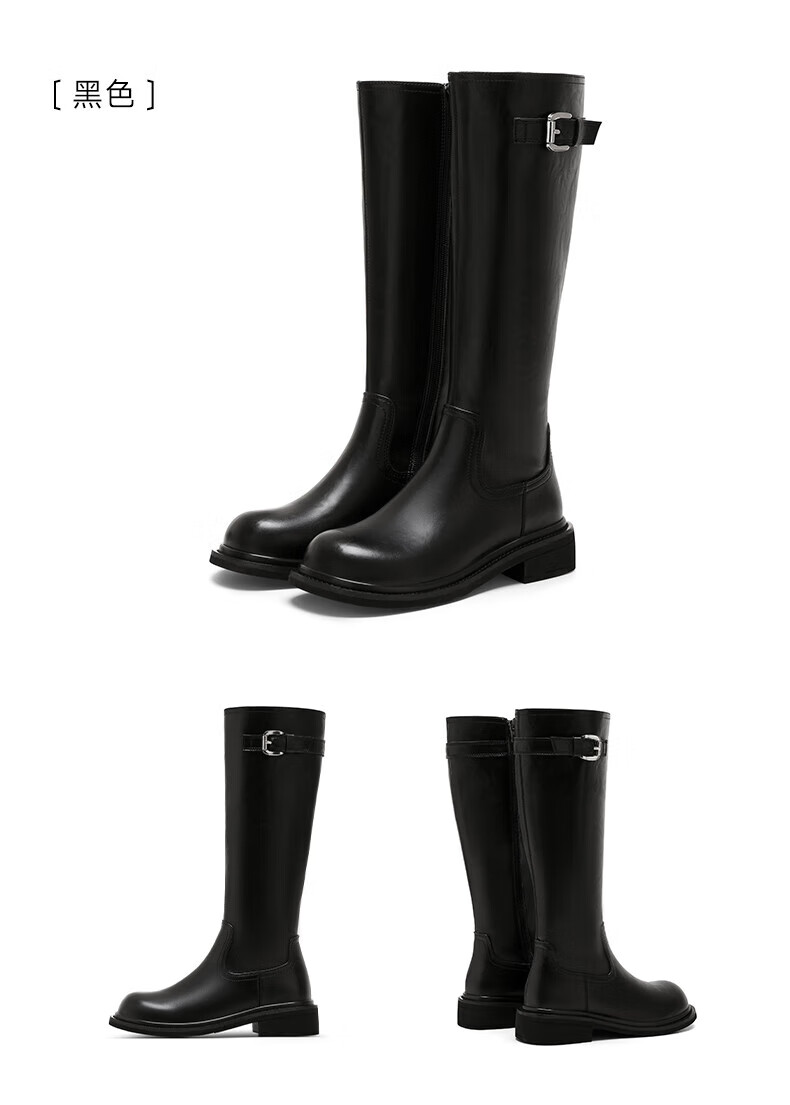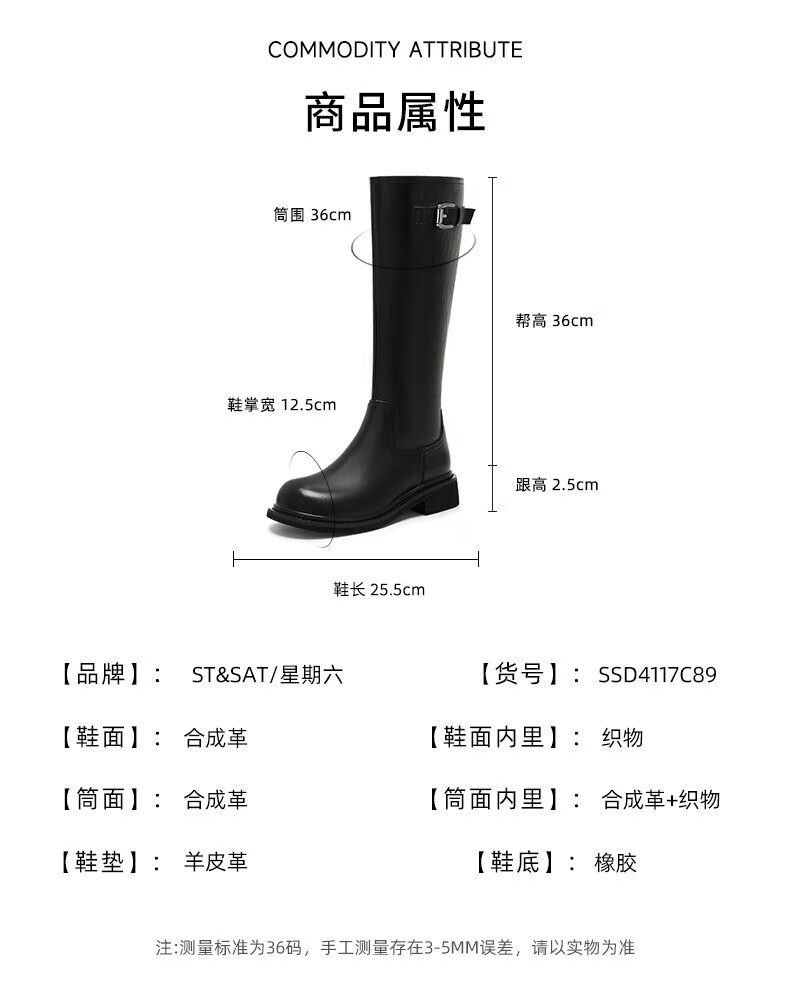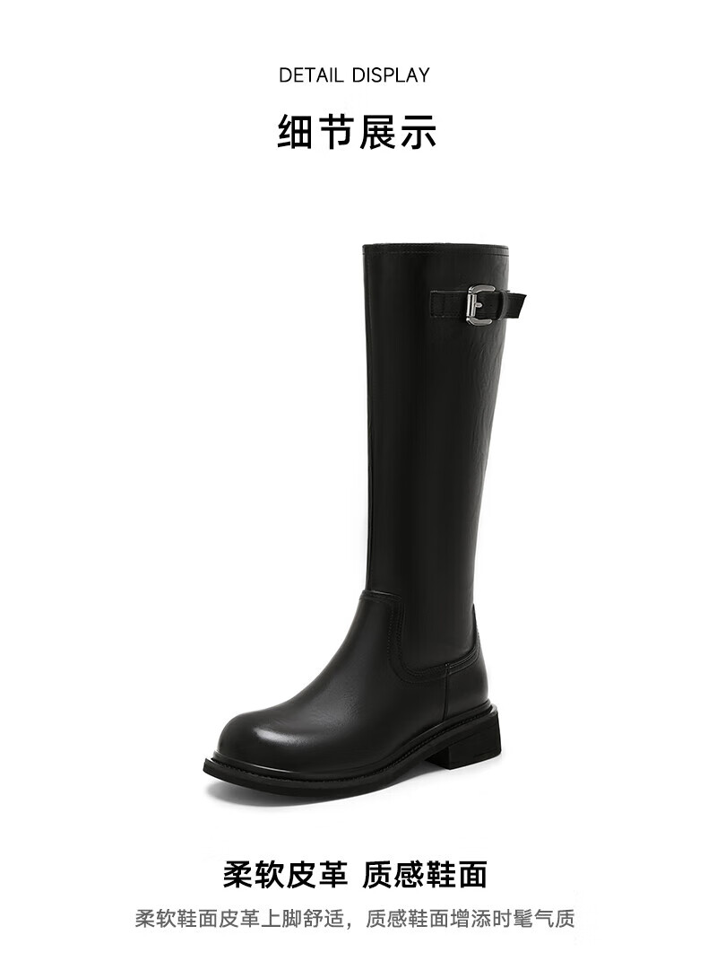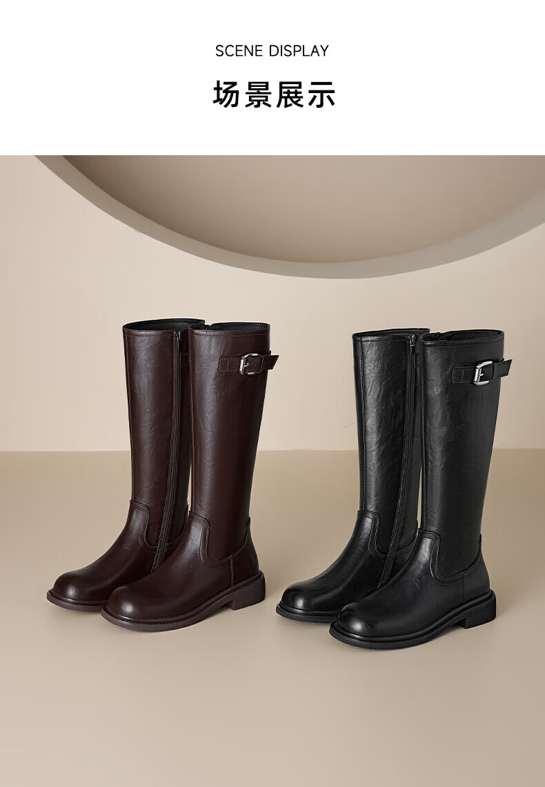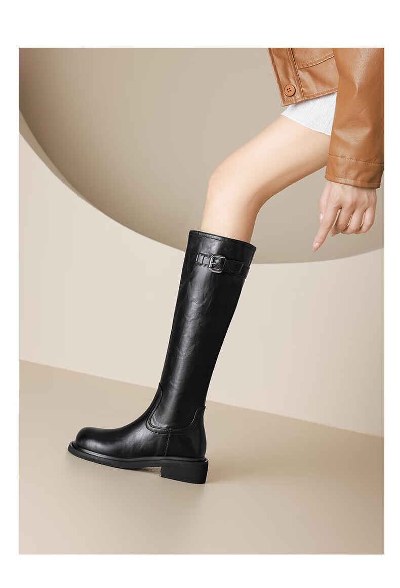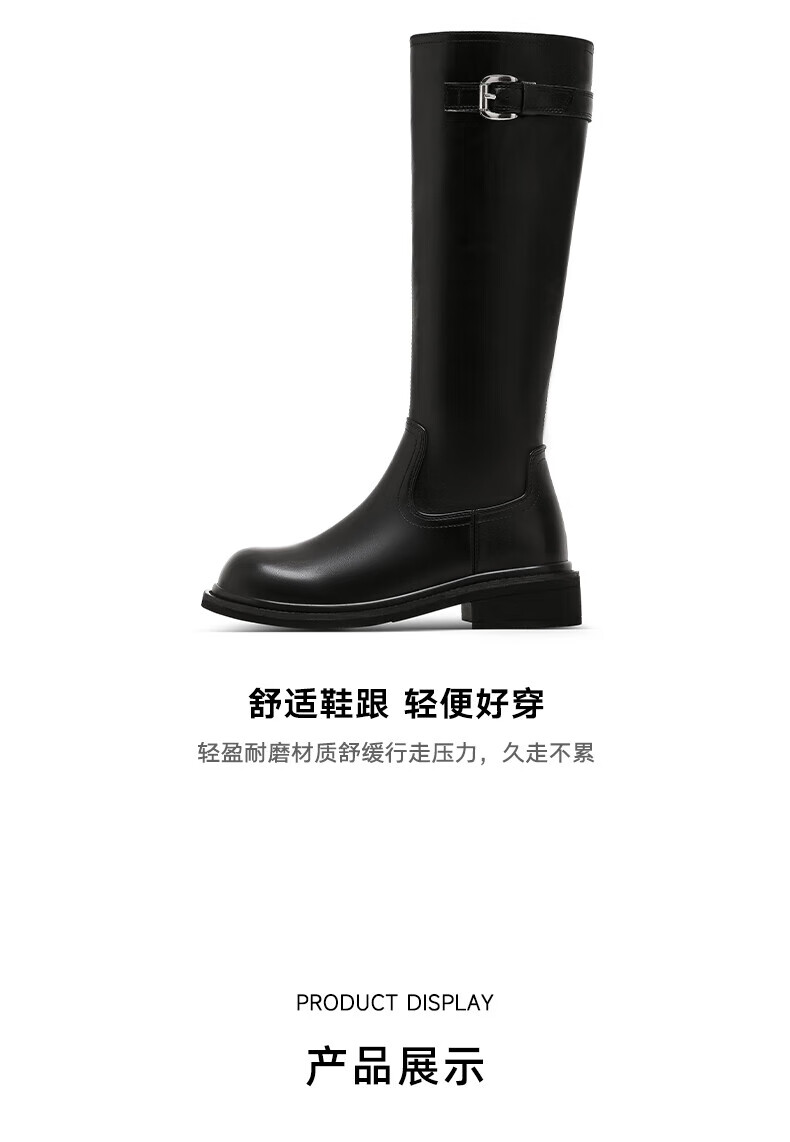 星期六厚底金锁扣长筒靴女2025新款秋冬百搭显瘦长靴不过膝英伦骑士靴女 黑色 37