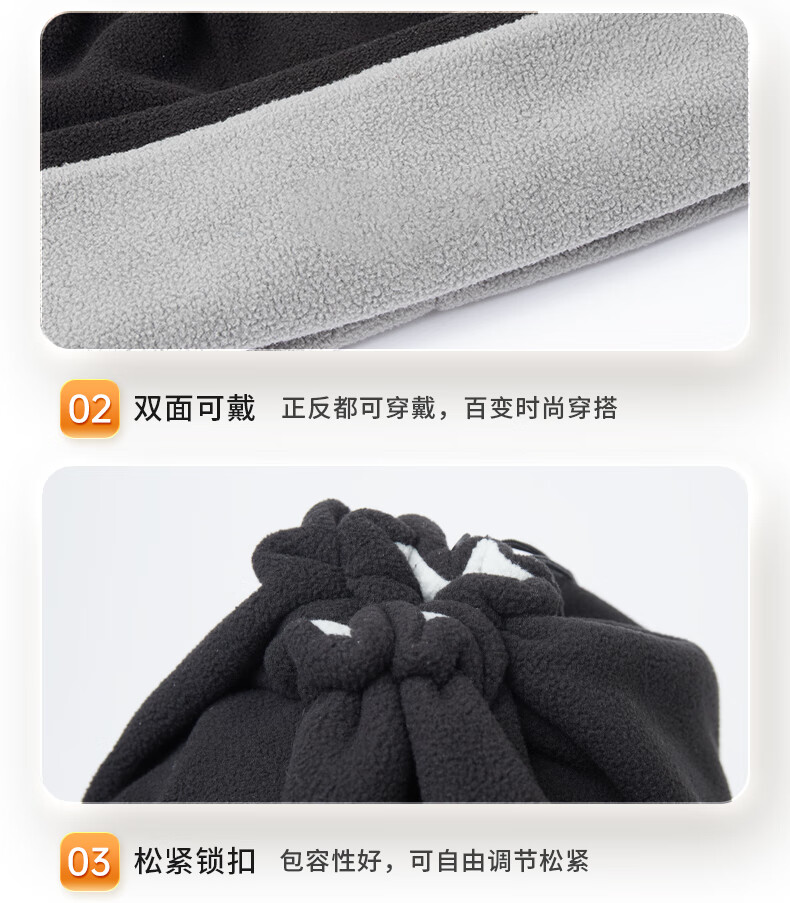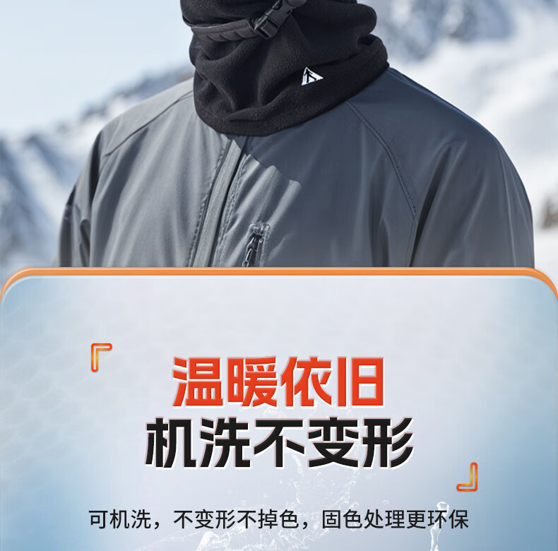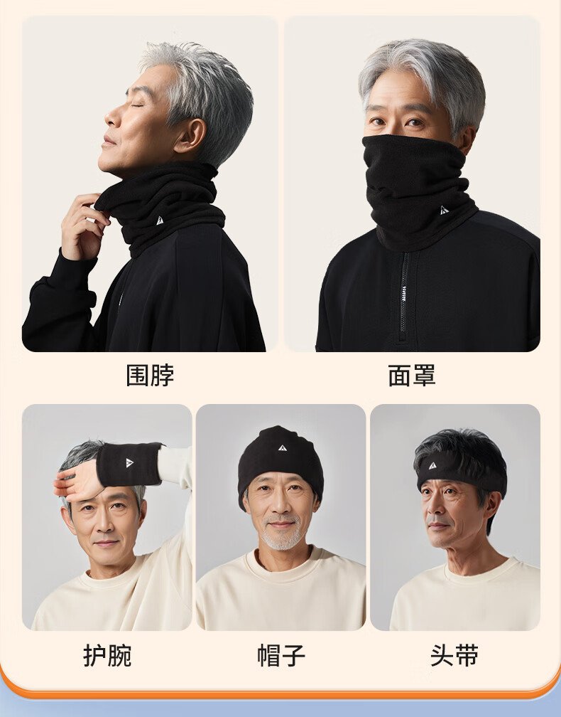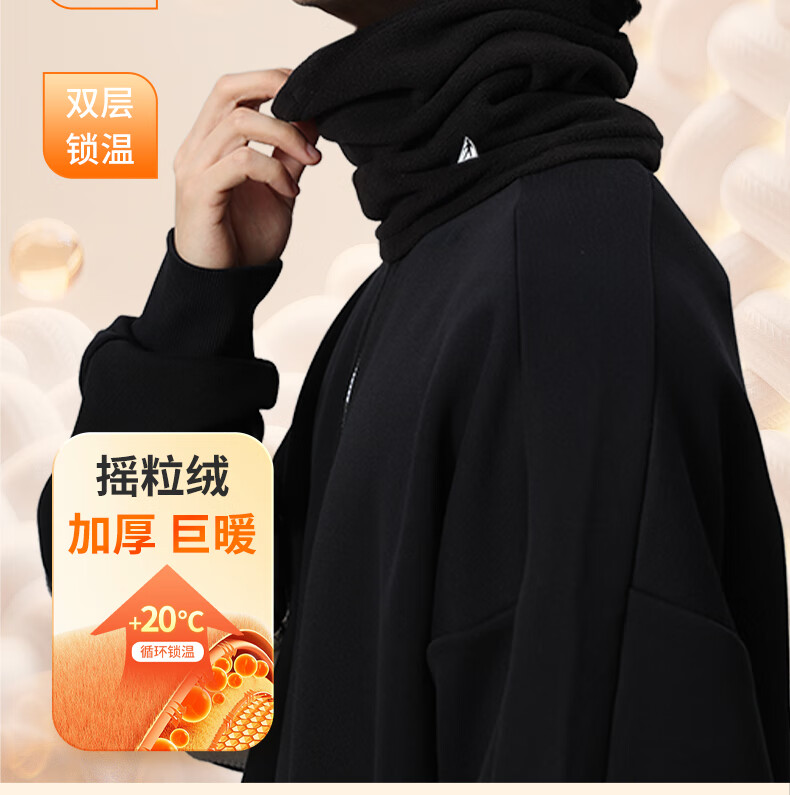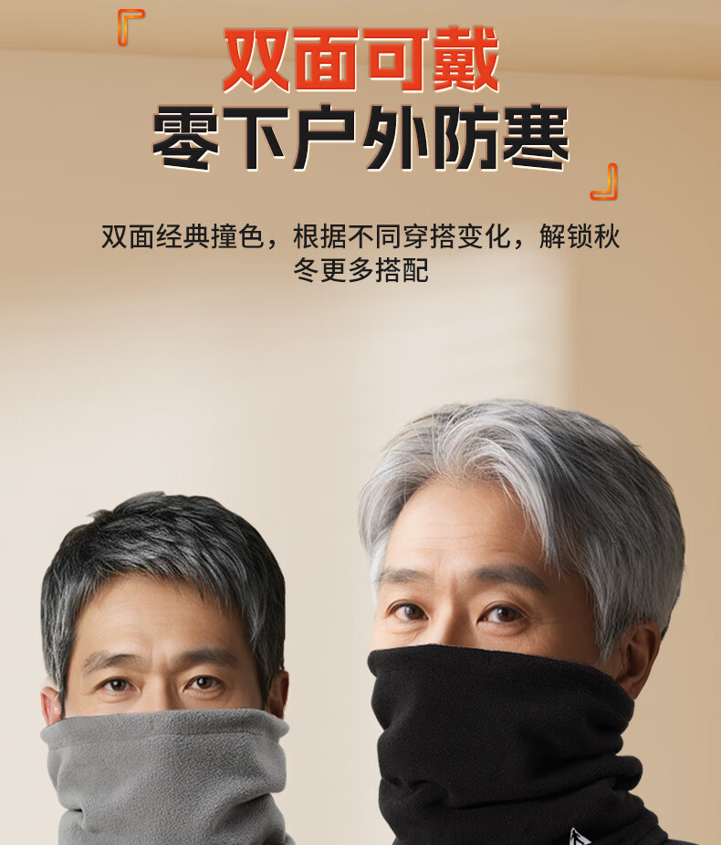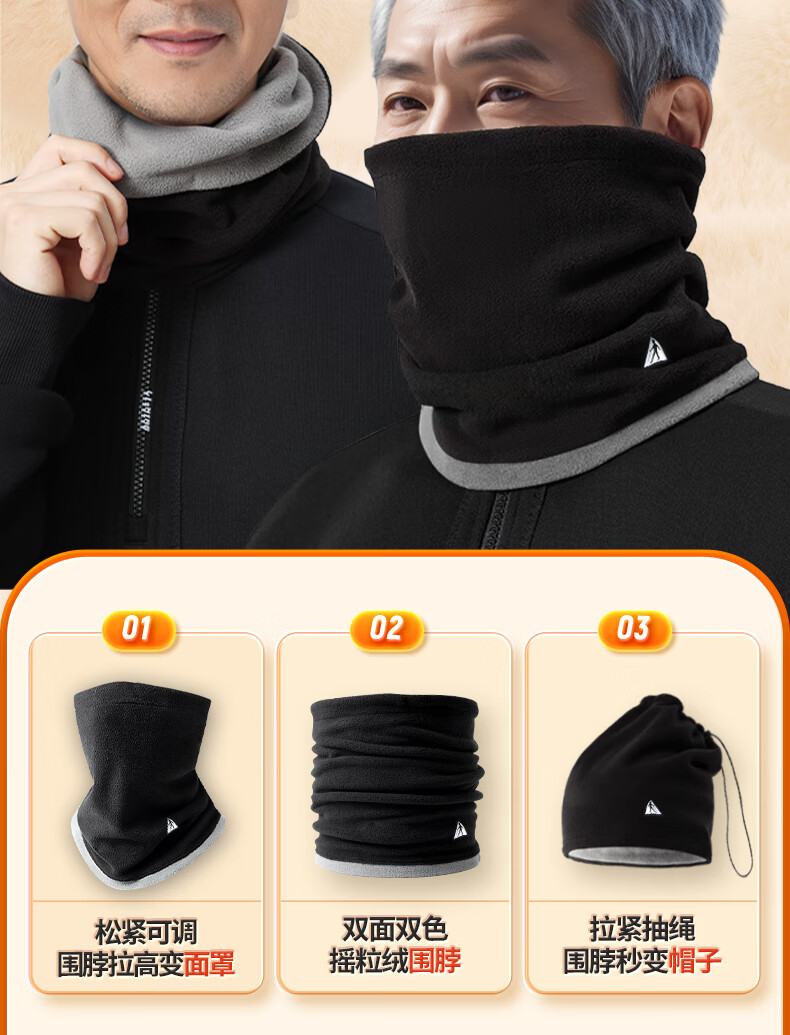 足力健围脖加绒男士秋冬保暖脖套中老年双面摇粒绒可变帽子面罩两用 黑灰【两面】 均码