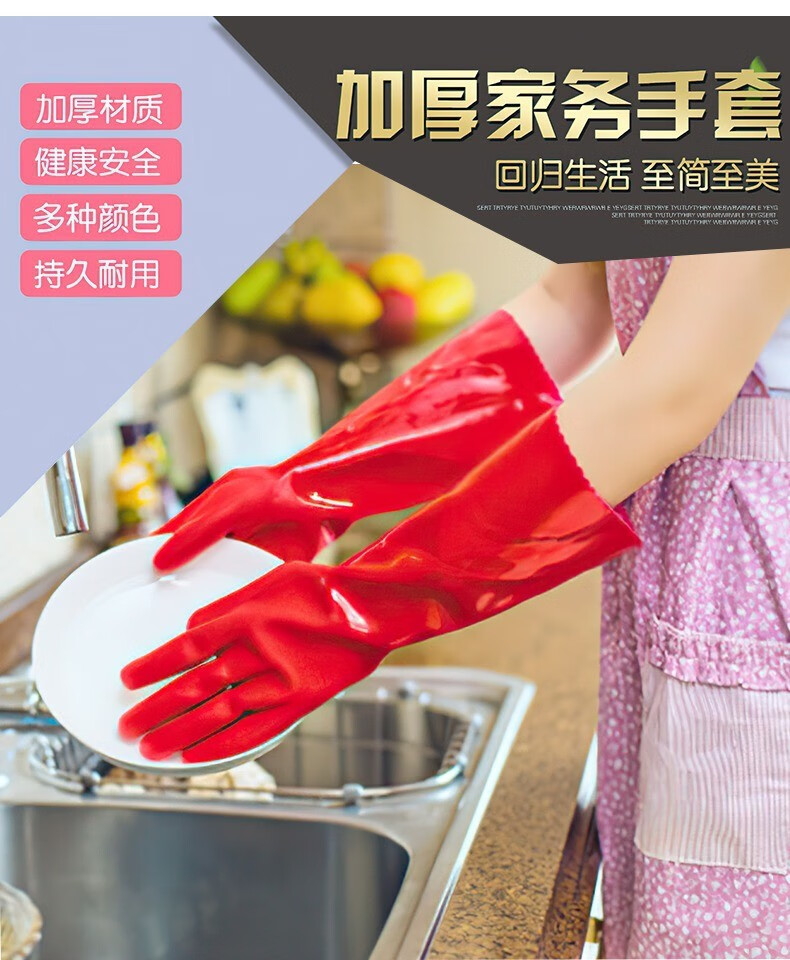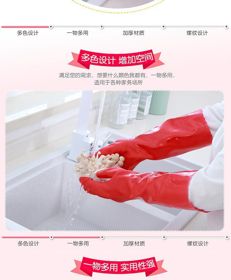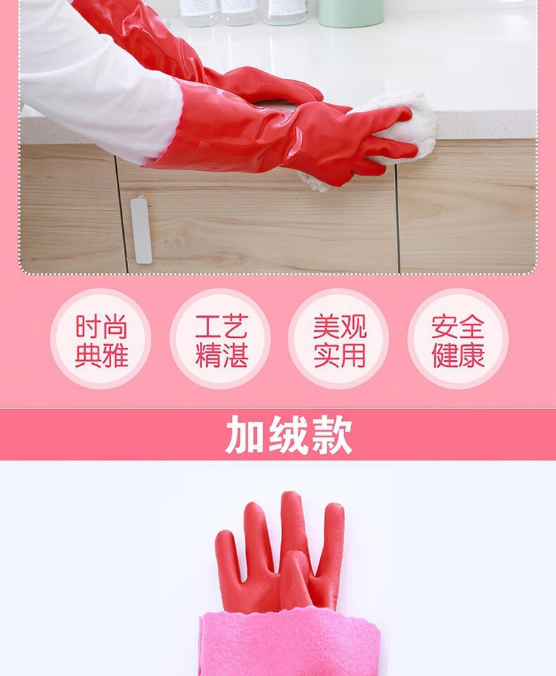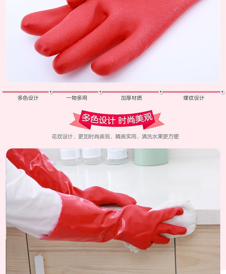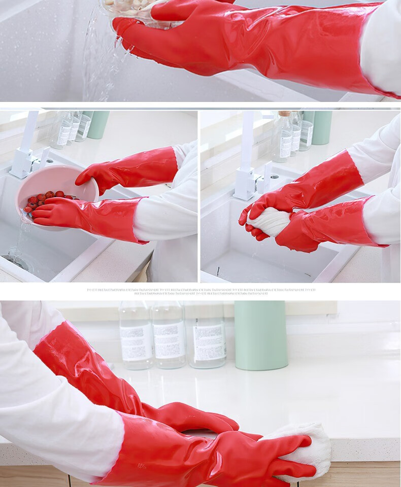 欧格达冬季加绒加长厨房清洁家务保暖手套洗碗防水劳保橡胶皮加棉手套女 红色35CM(两双装)
