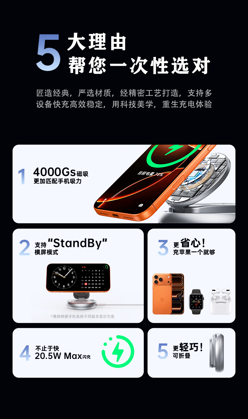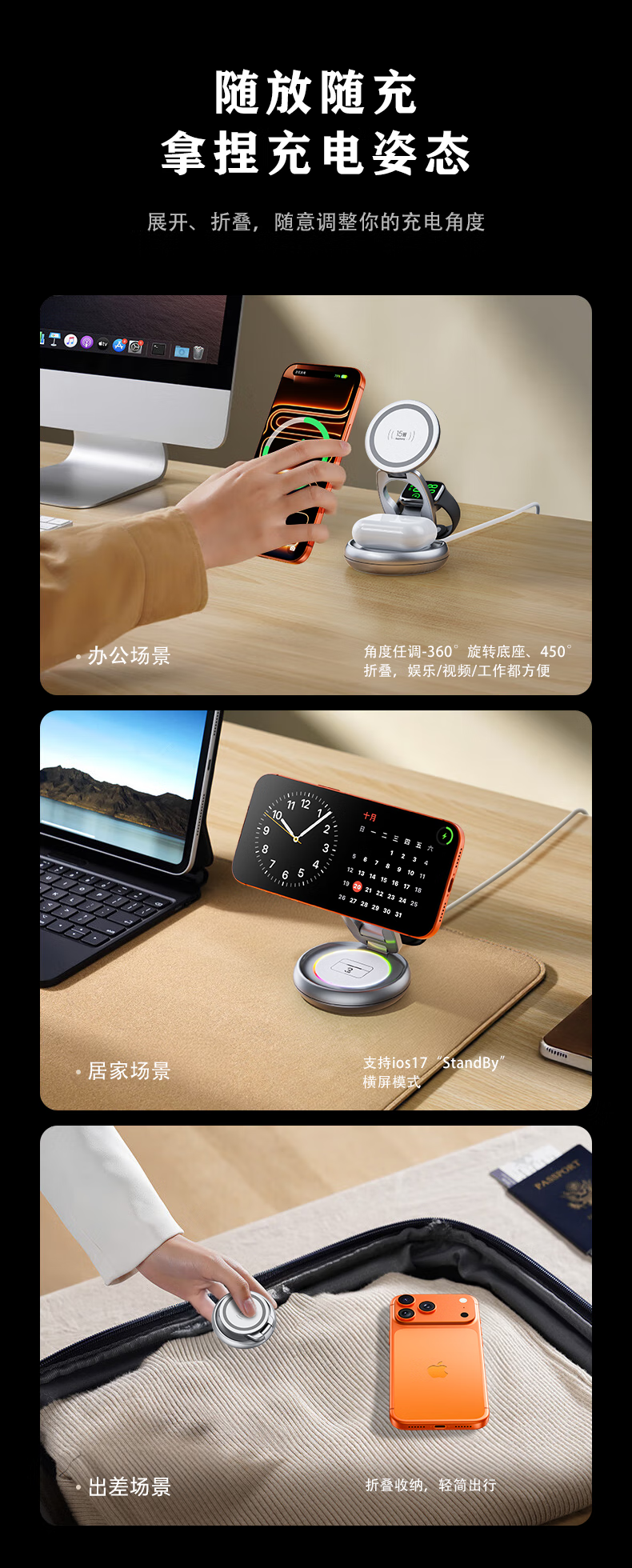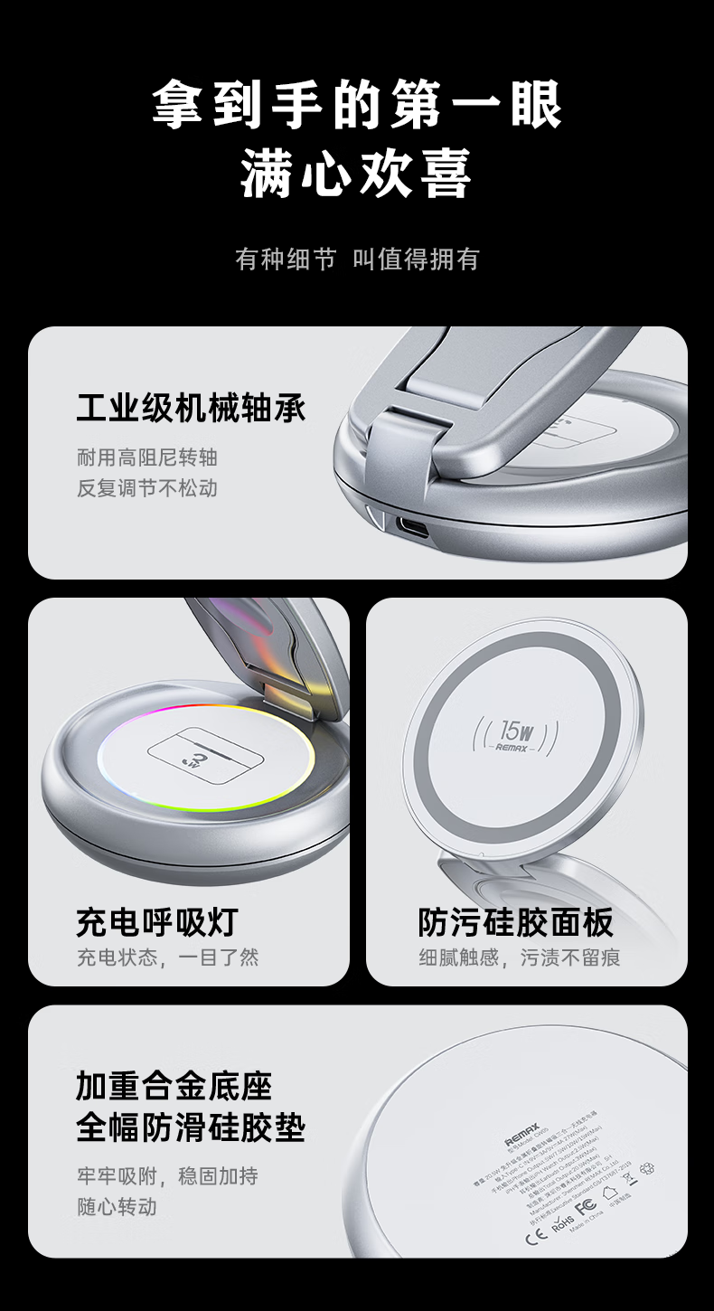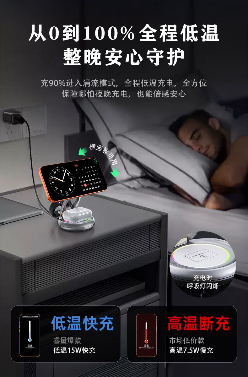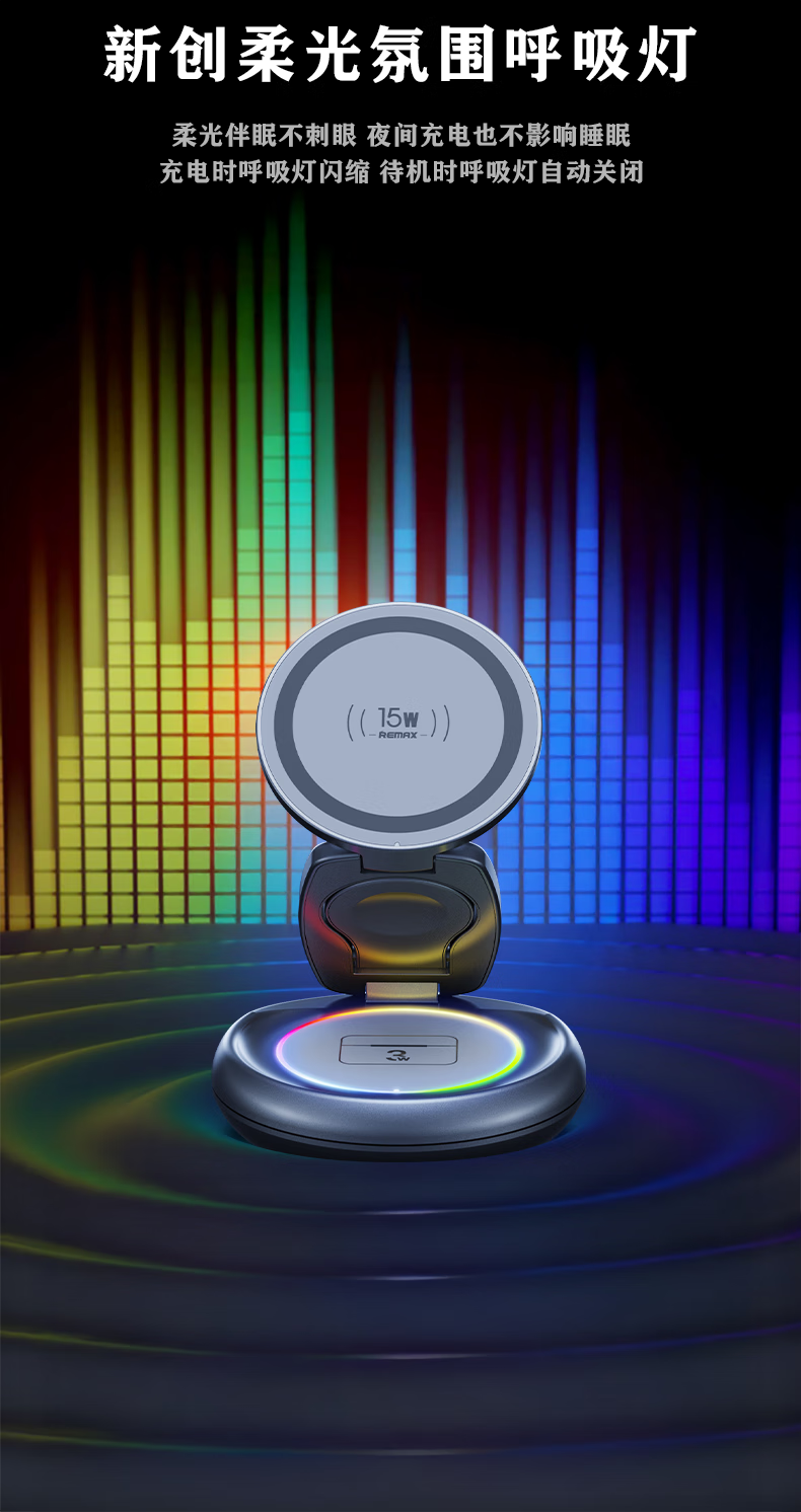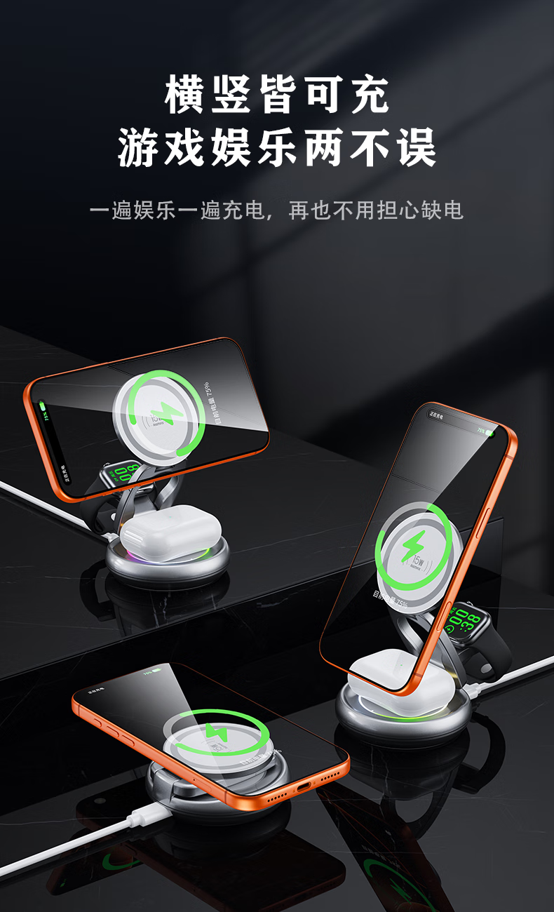 睿量苹果便携无线充电器三合一可折叠立式手机支架magsafe磁吸适用iPhone17/华为小米/iwatch手表/耳机