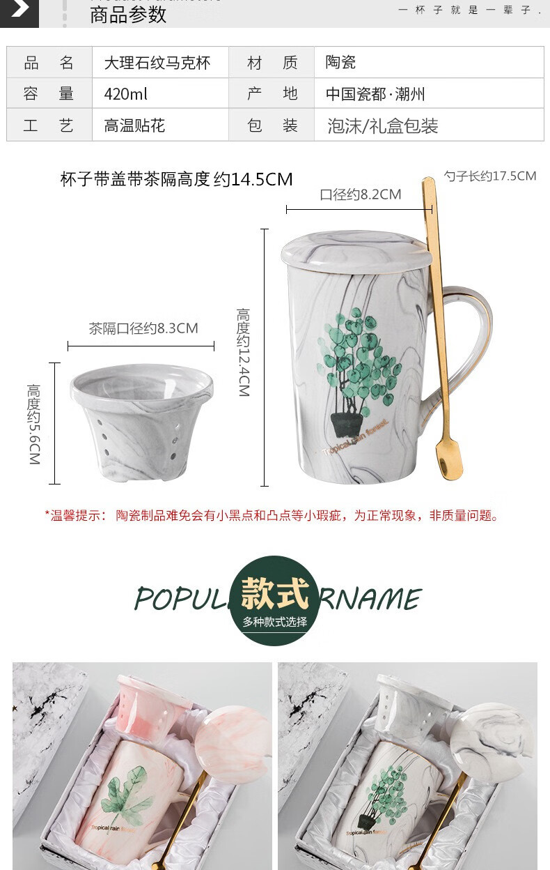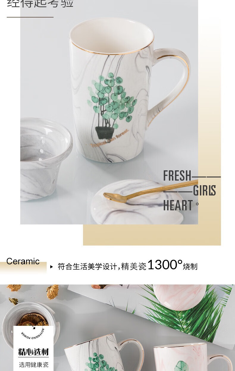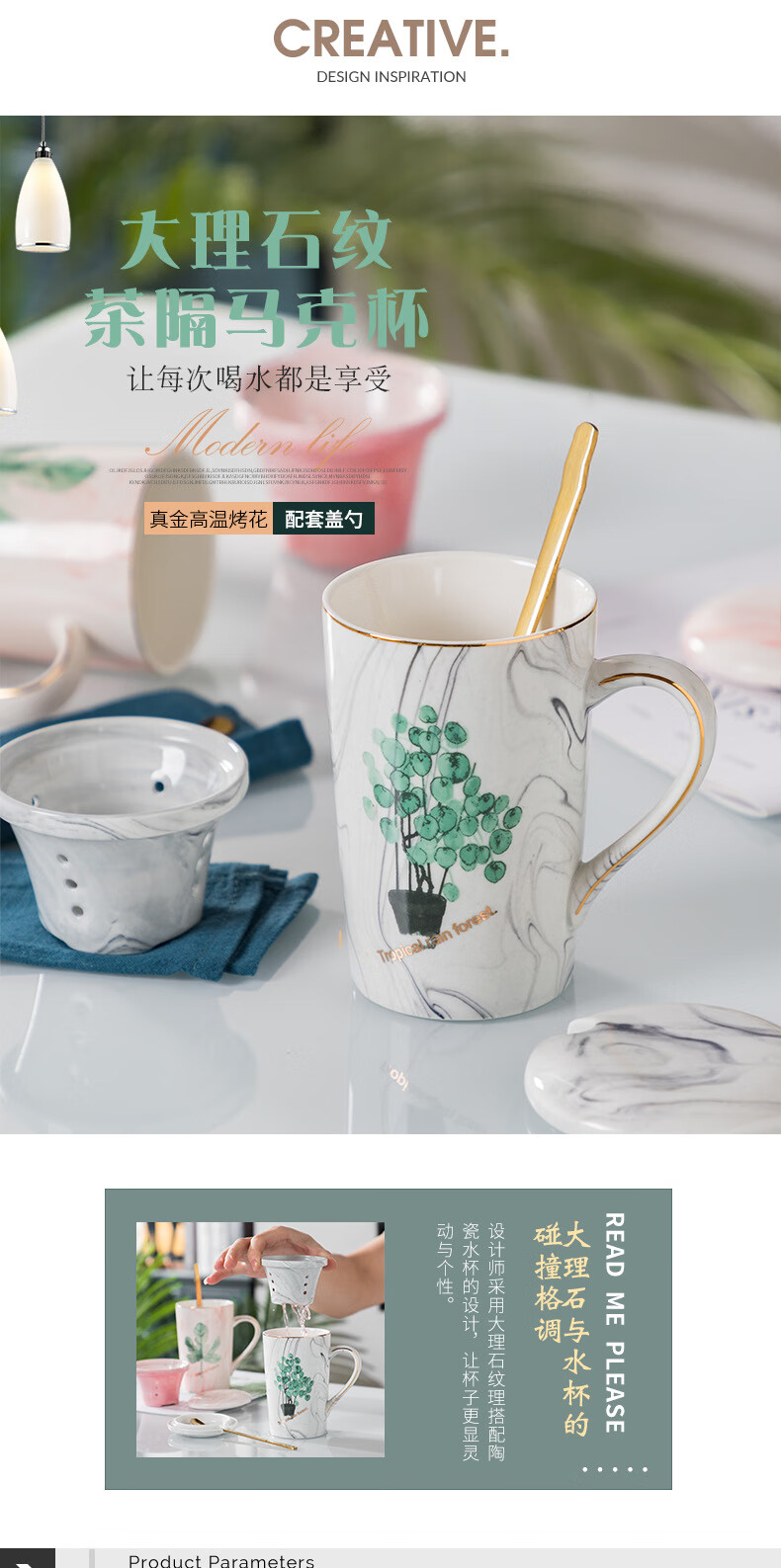【严选好货】创意日式潮流陶瓷咖啡杯家用带勺盖家用礼品马克杯伴 描金圆币草灰茶隔+勺盖 401-500ml