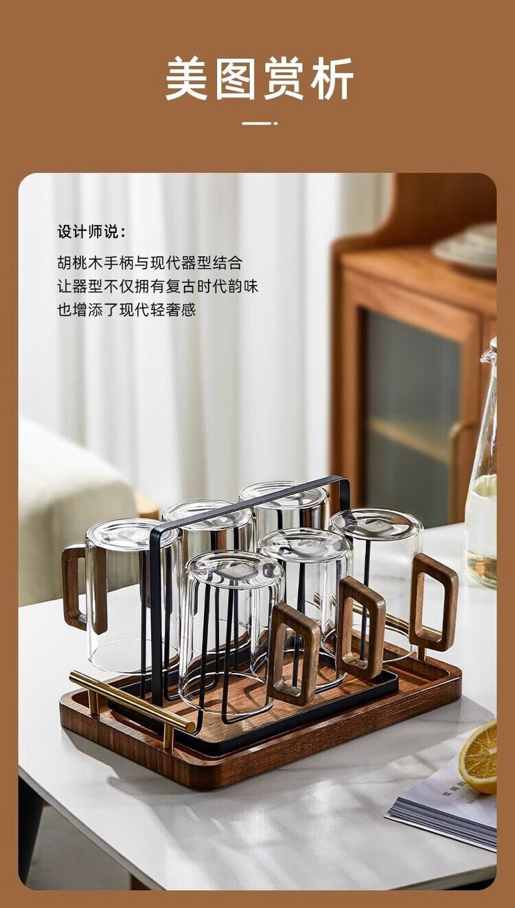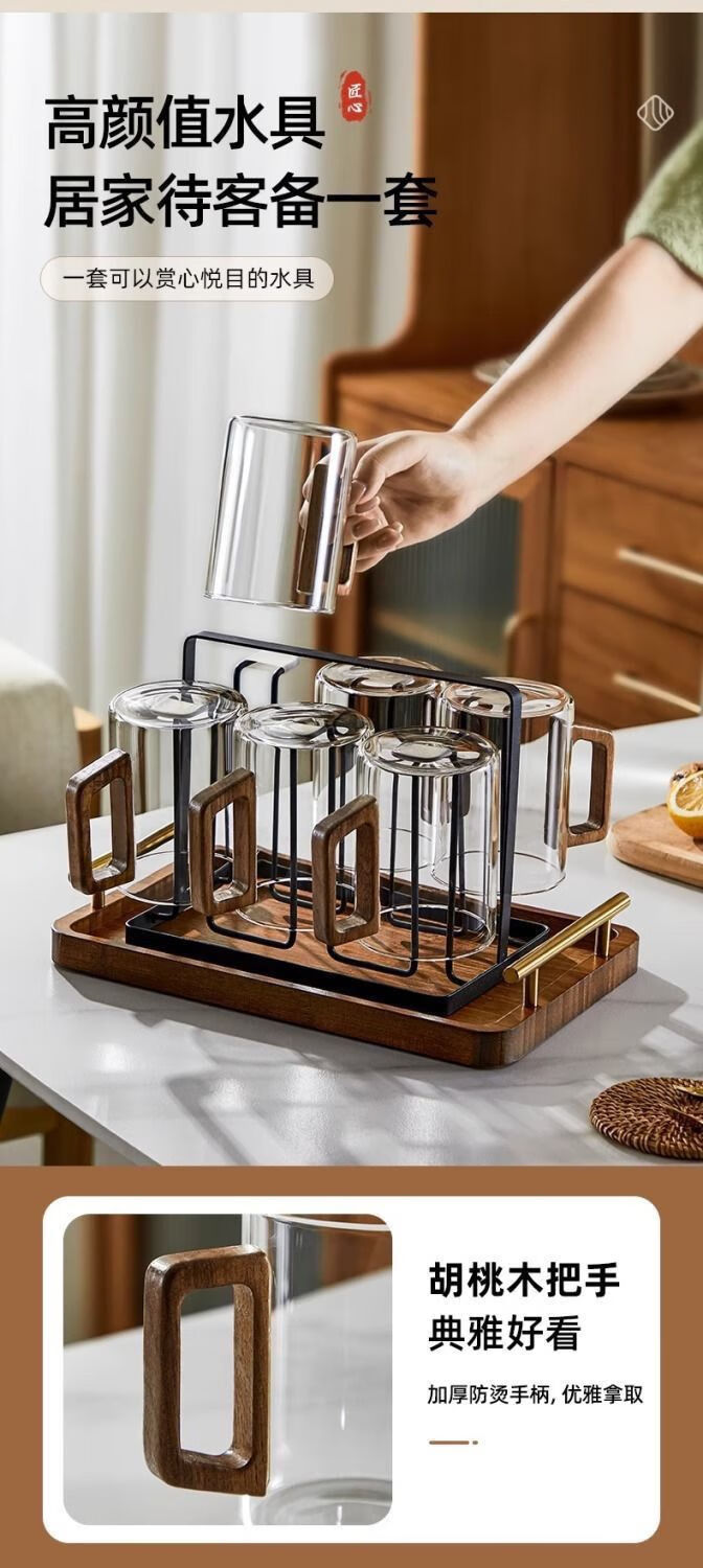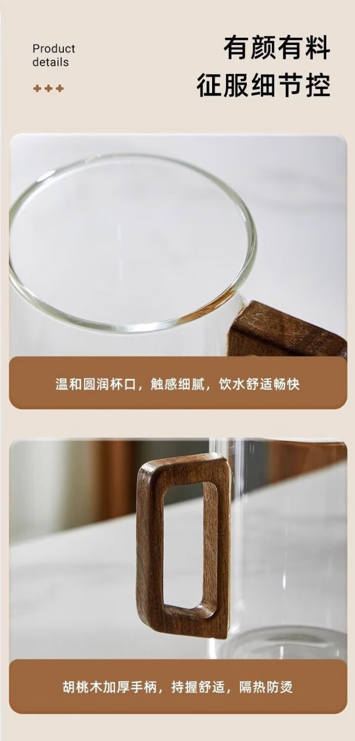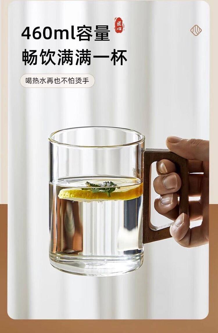 简漾耐高温耐热茶水分离玻璃把手水杯玻璃杯办公个人专用办公室茶杯 胡桃木实木把手杯1支 透明色(500毫升)
