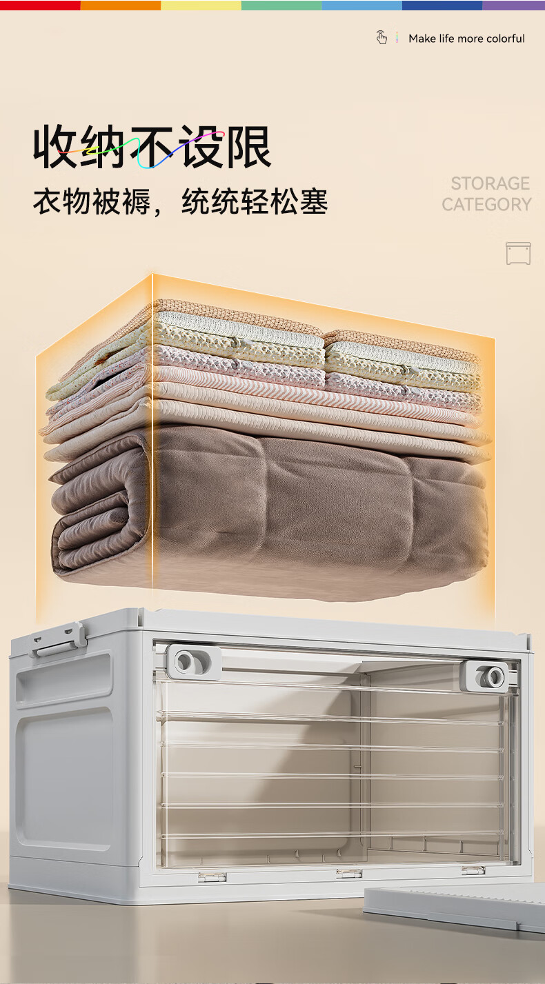 京东物流 棉麻衣服收纳箱家用大容量布艺折叠筐衣柜棉被储物神器 米色【透视窗】双开门 66升-防潮防霉【50*40*33CM】1个