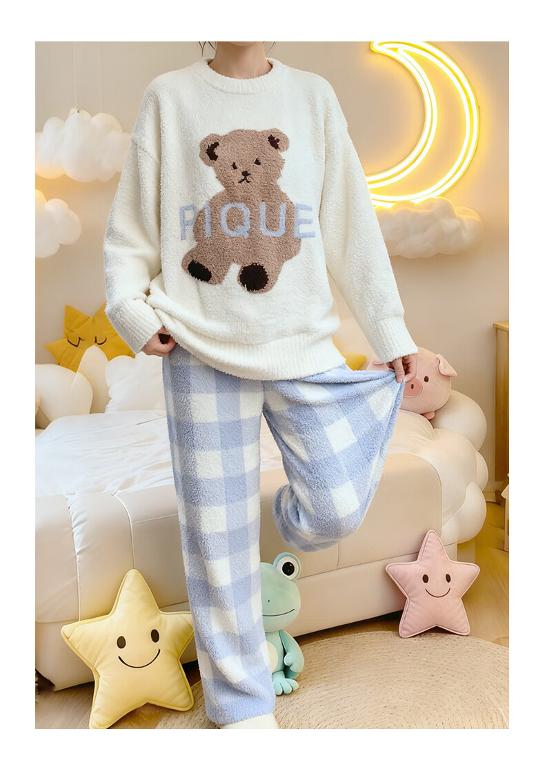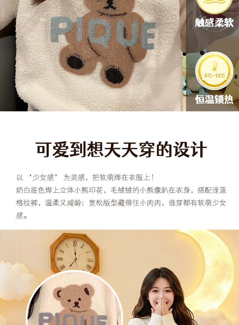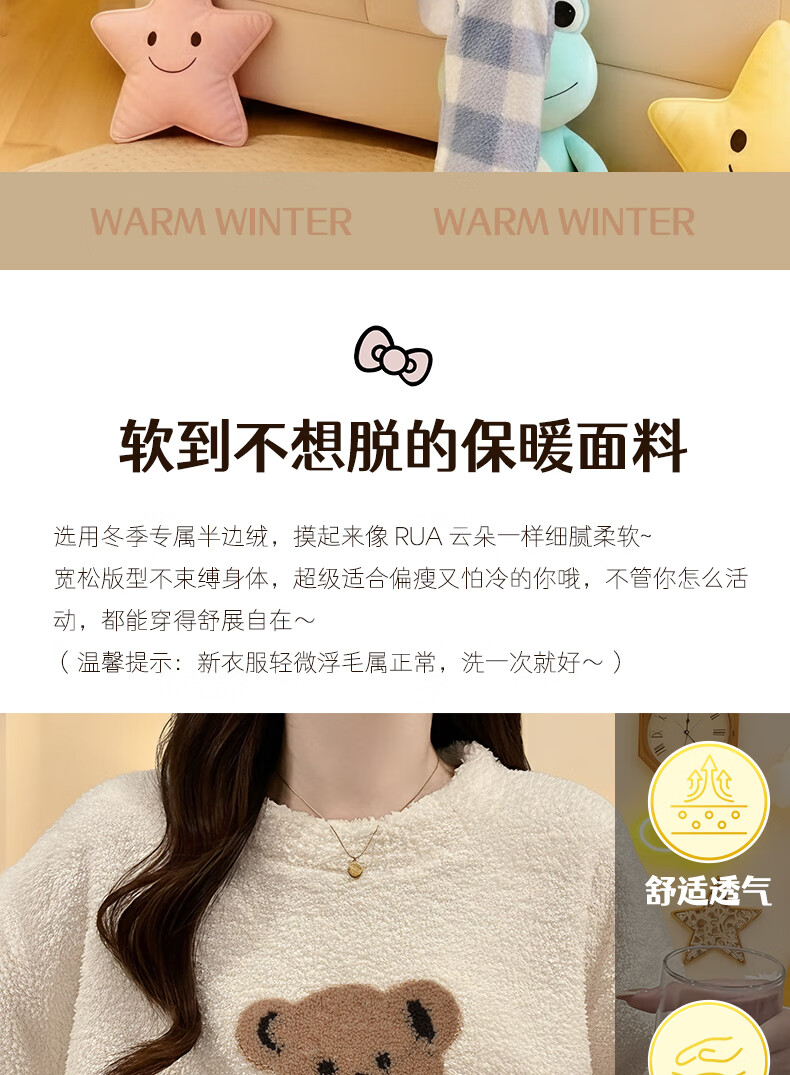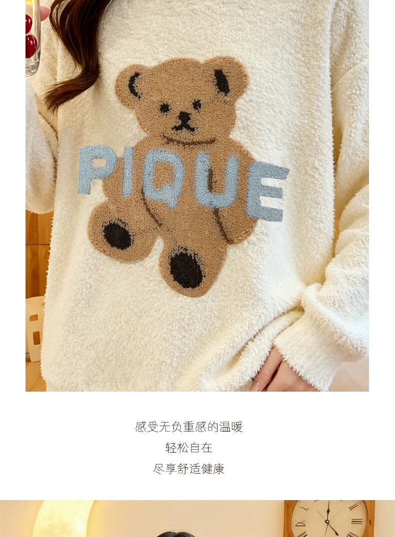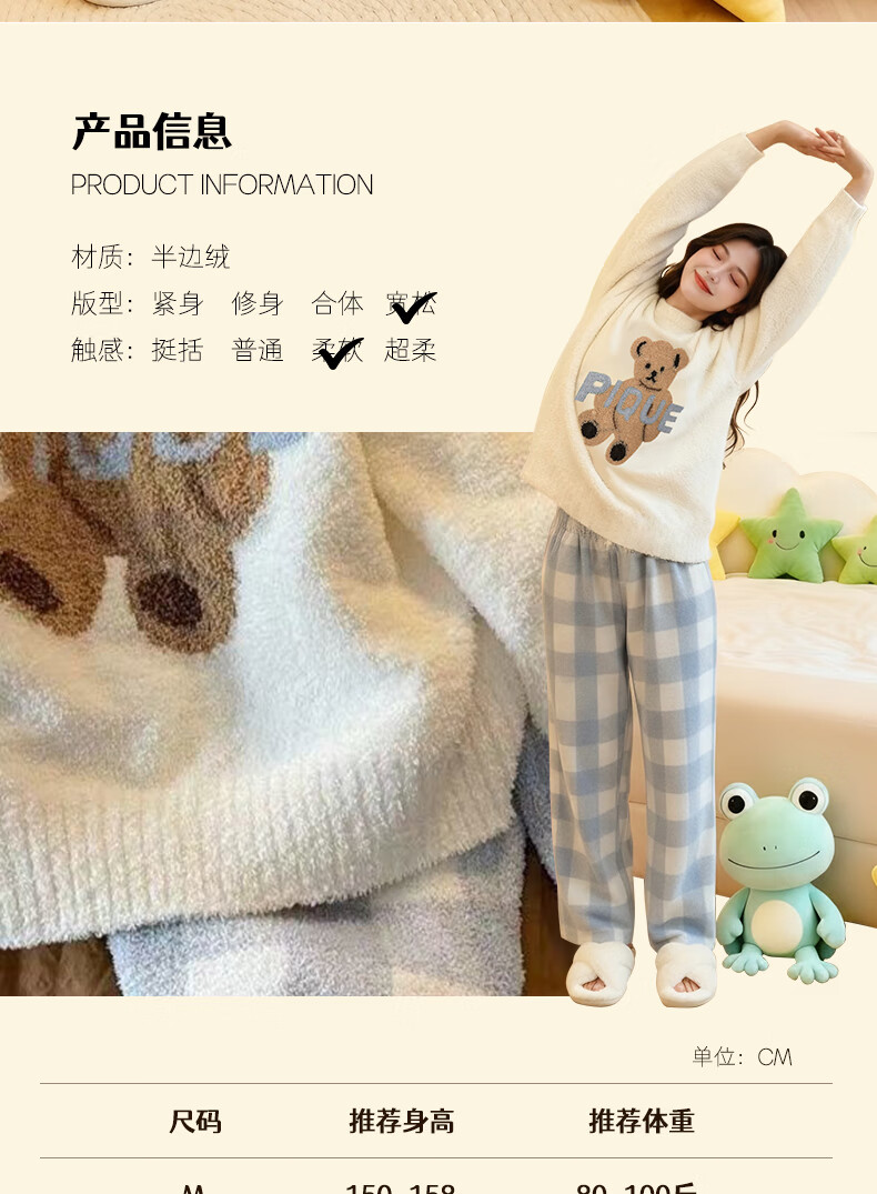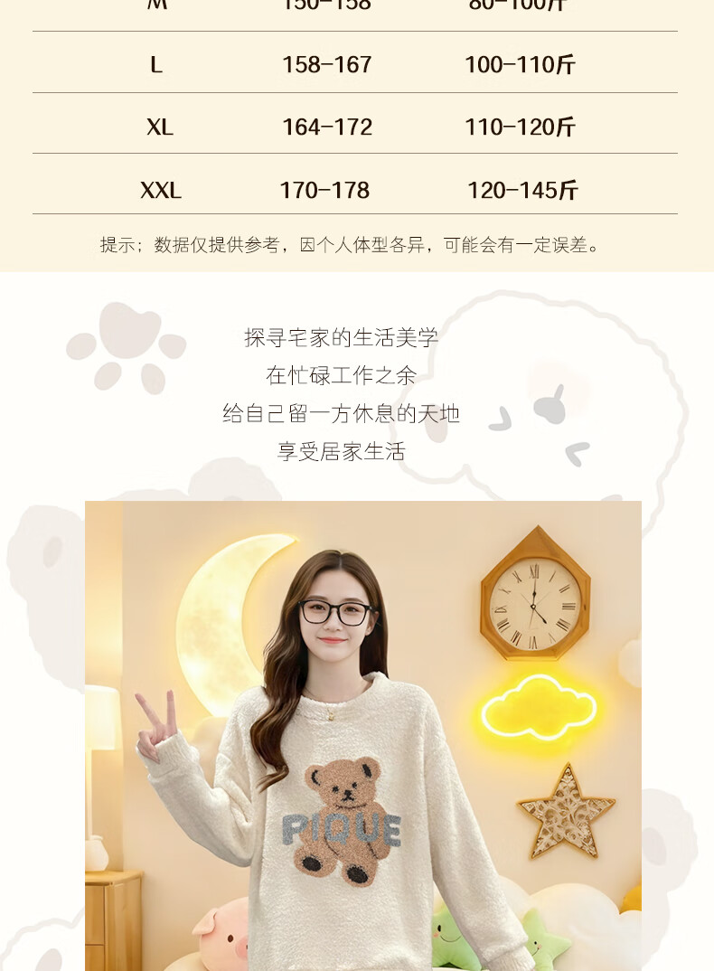 迷黎小熊图案可爱半边绒睡衣家居服套装少女风保暖女装 米色 XL