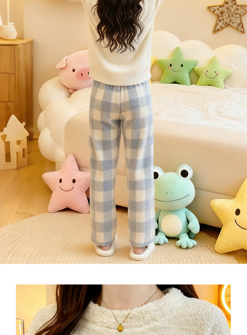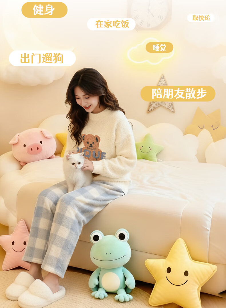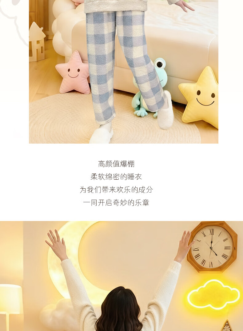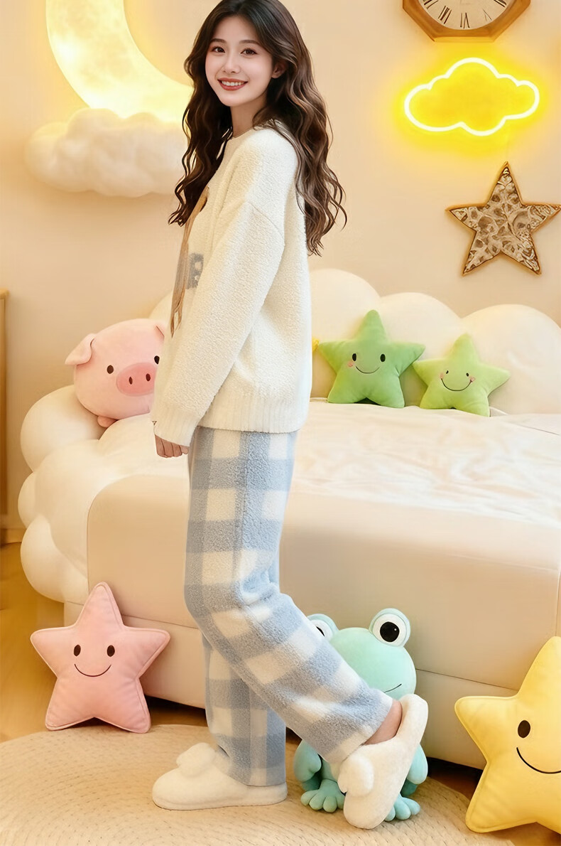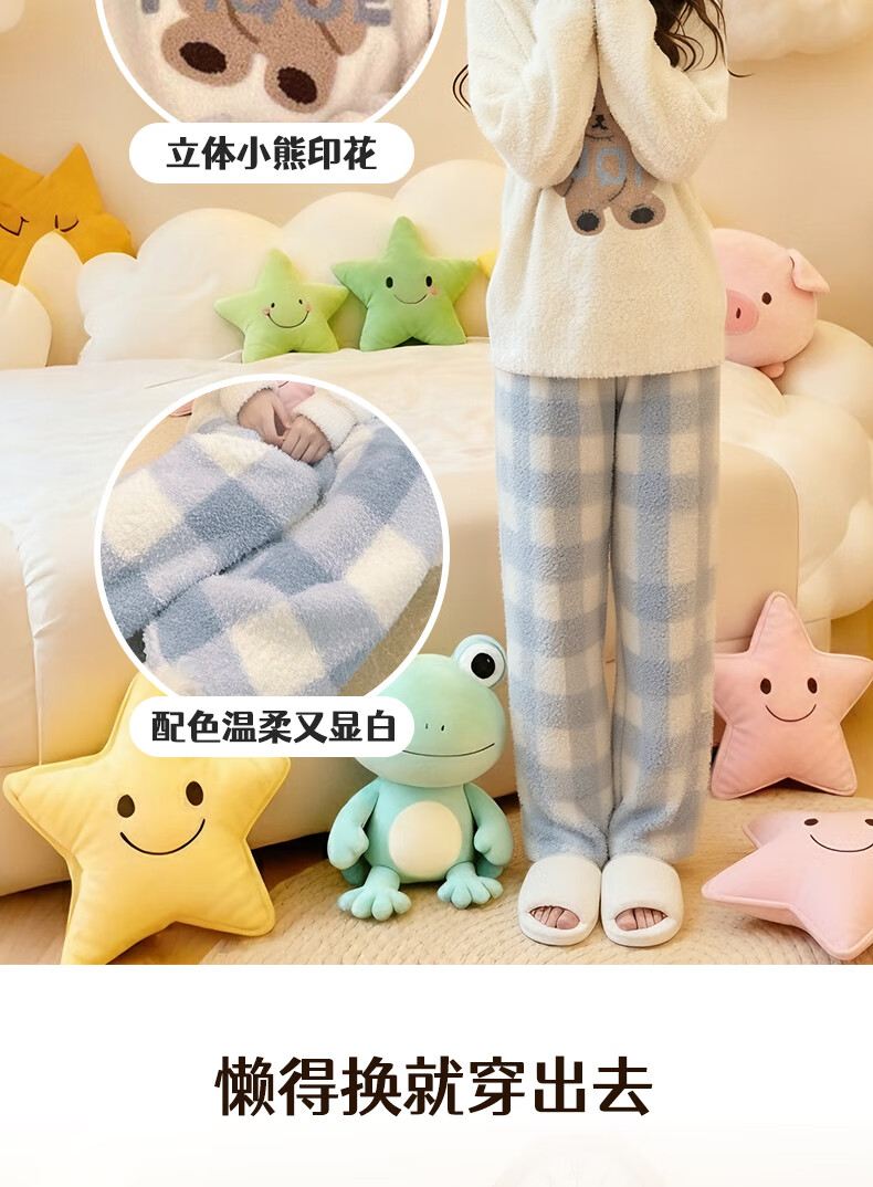 迷黎小熊图案可爱半边绒睡衣家居服套装少女风保暖女装 米色 XL