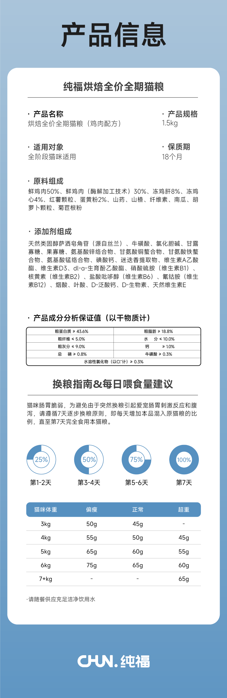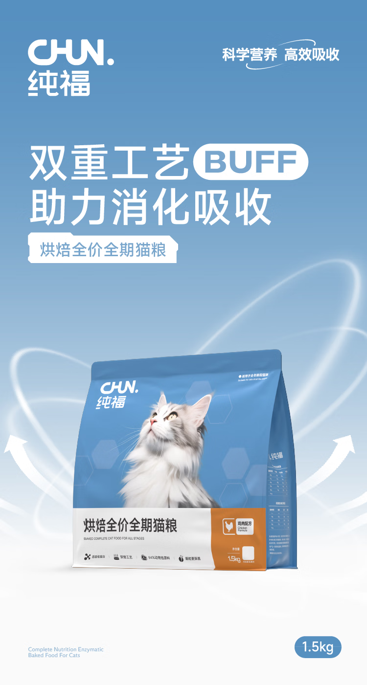 纯福低温烘焙鲜肉酶解消化吸收单一肉源鸡肉全价全期成猫幼猫通用猫粮 烘焙猫粮1.5kg【单包装】