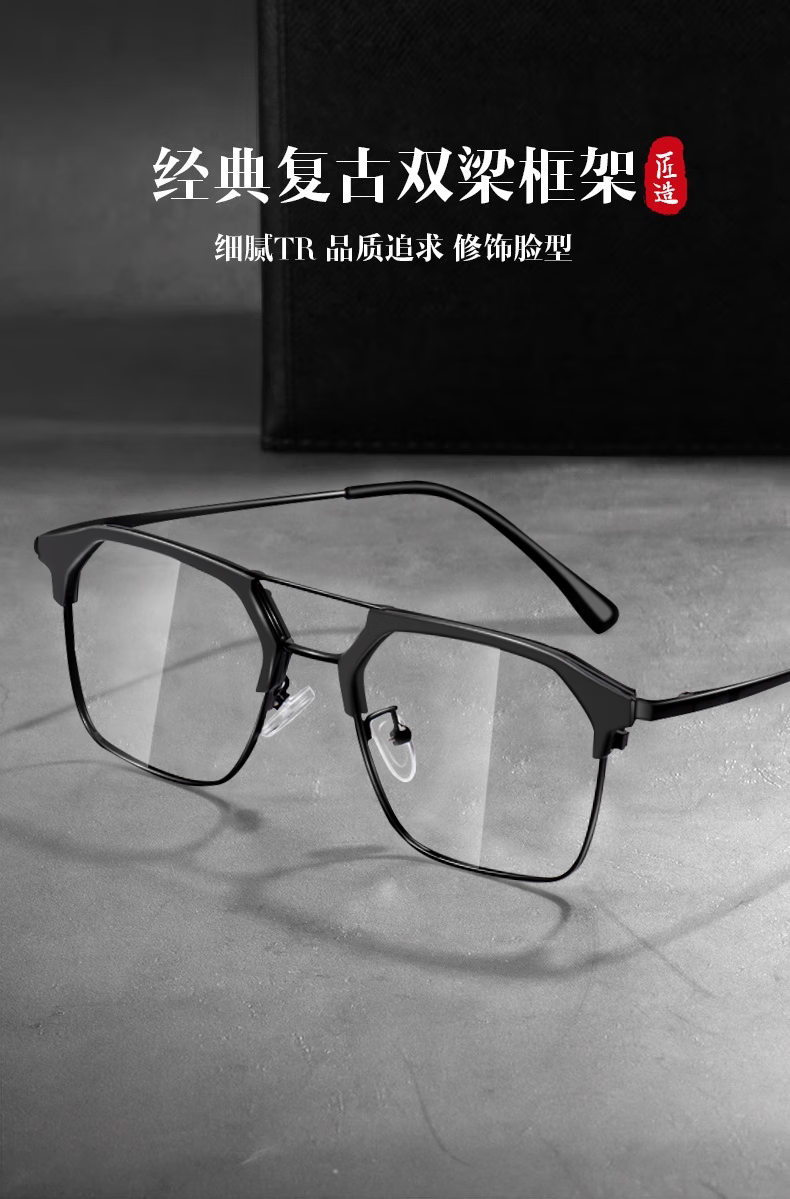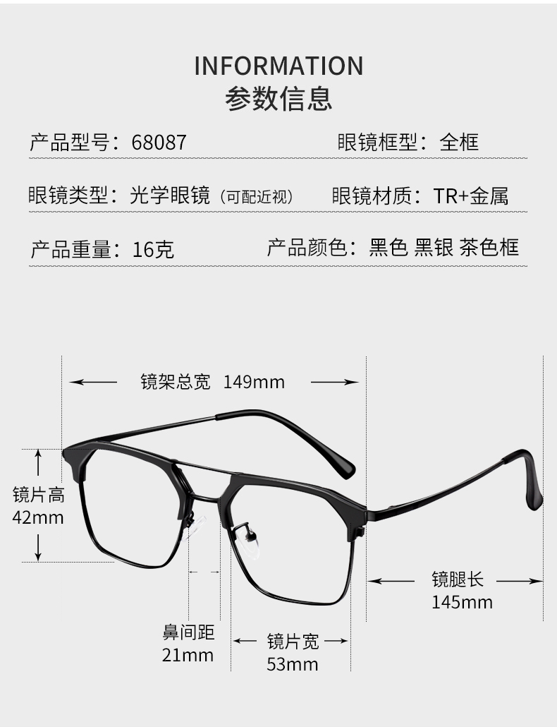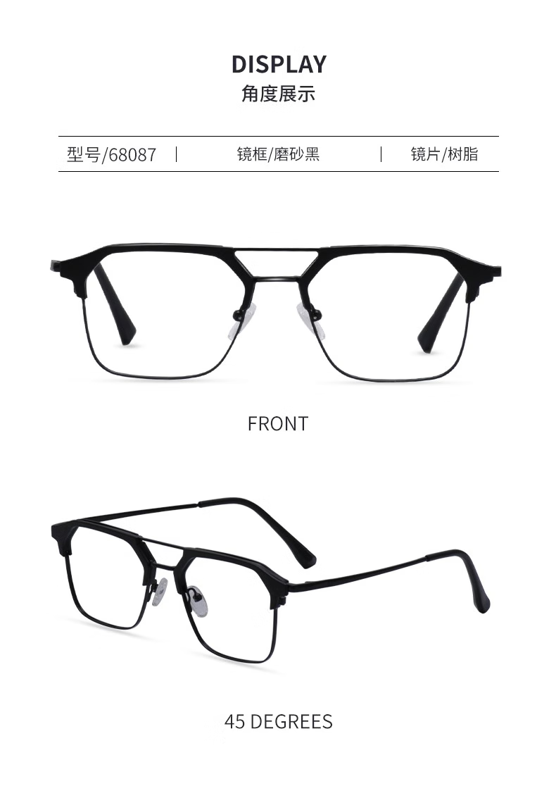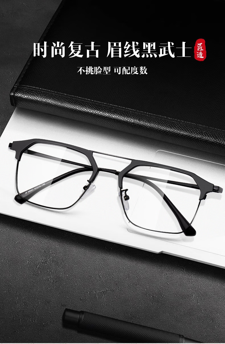 潮库双梁全框近视眼镜框男款可配度数痞帅黑色复古黑武士眼镜架 68087 砂黑 万新1.60防蓝光镜片0-800