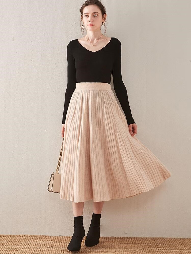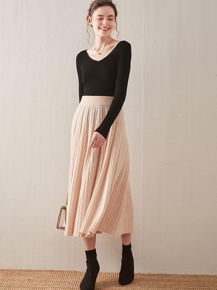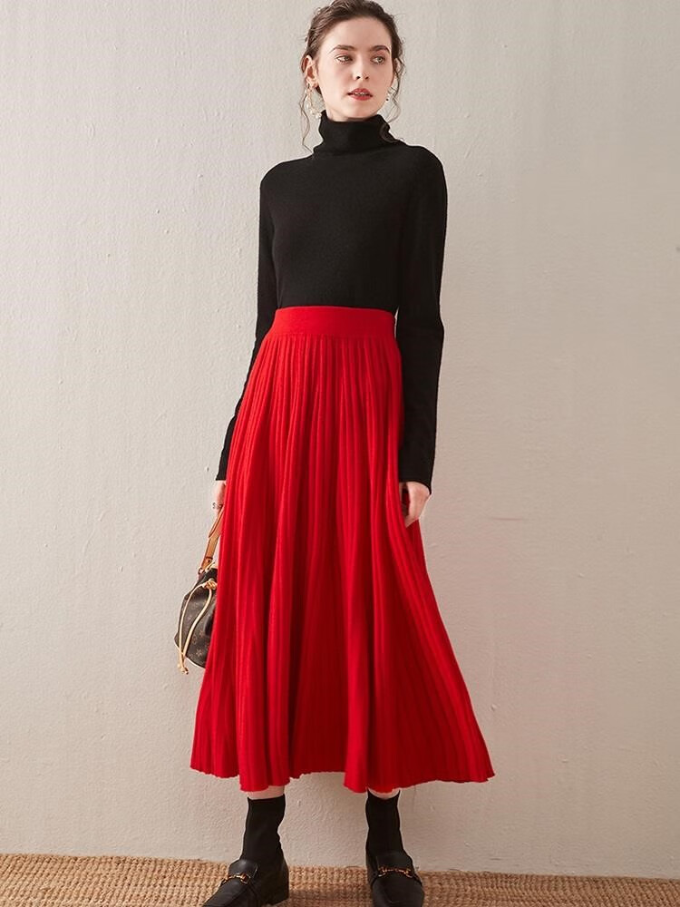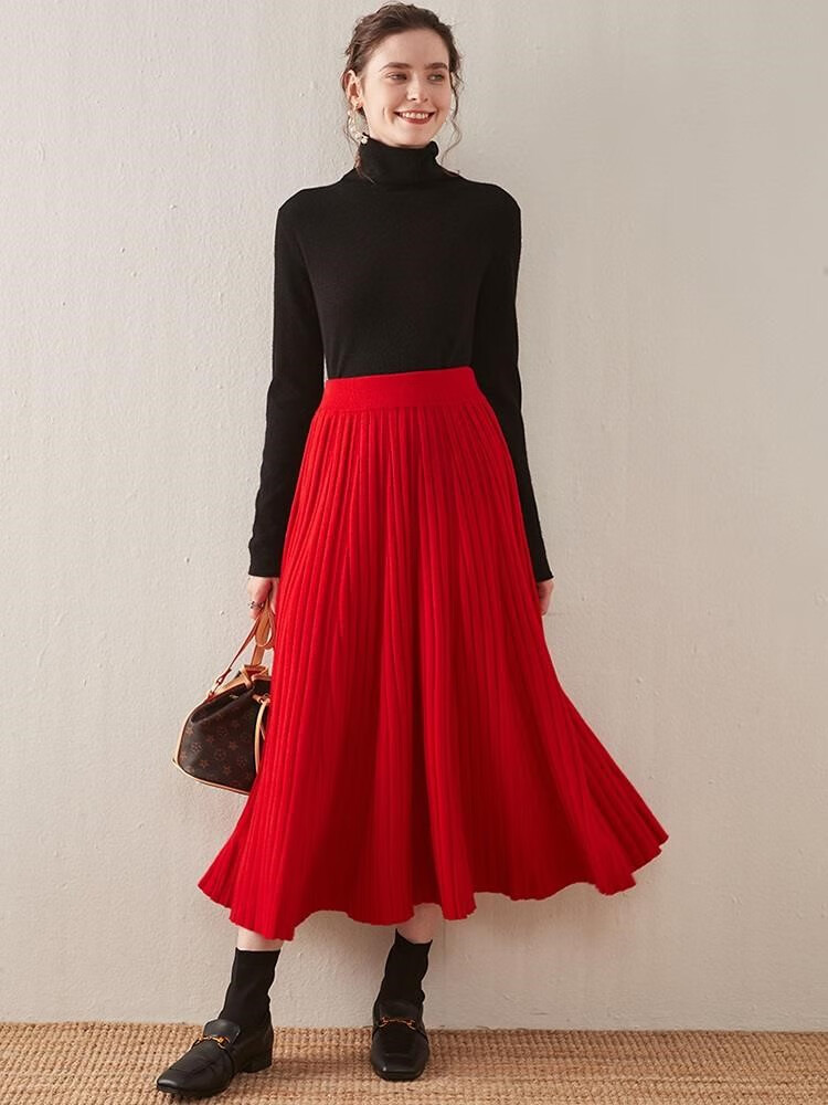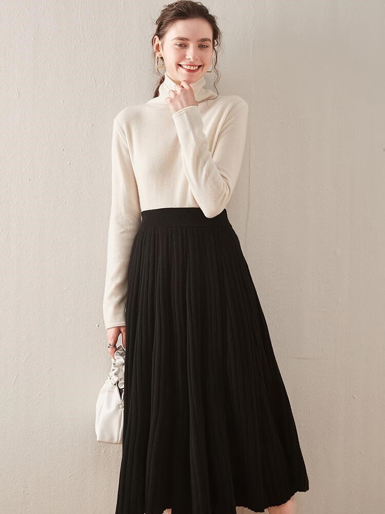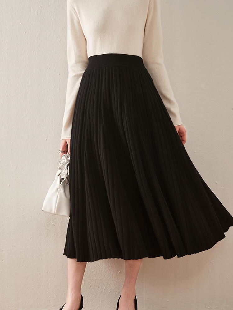EMZ鄂尔多斯100纯羊毛半身裙女秋冬中长款高腰百褶大摆裙A字裙针织裙 黑色 黑色 2XL