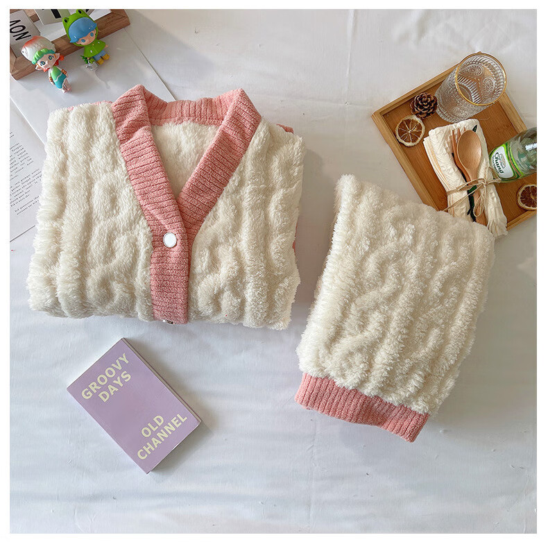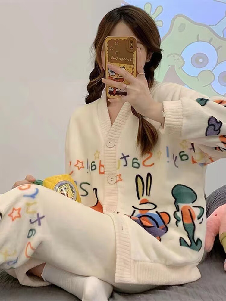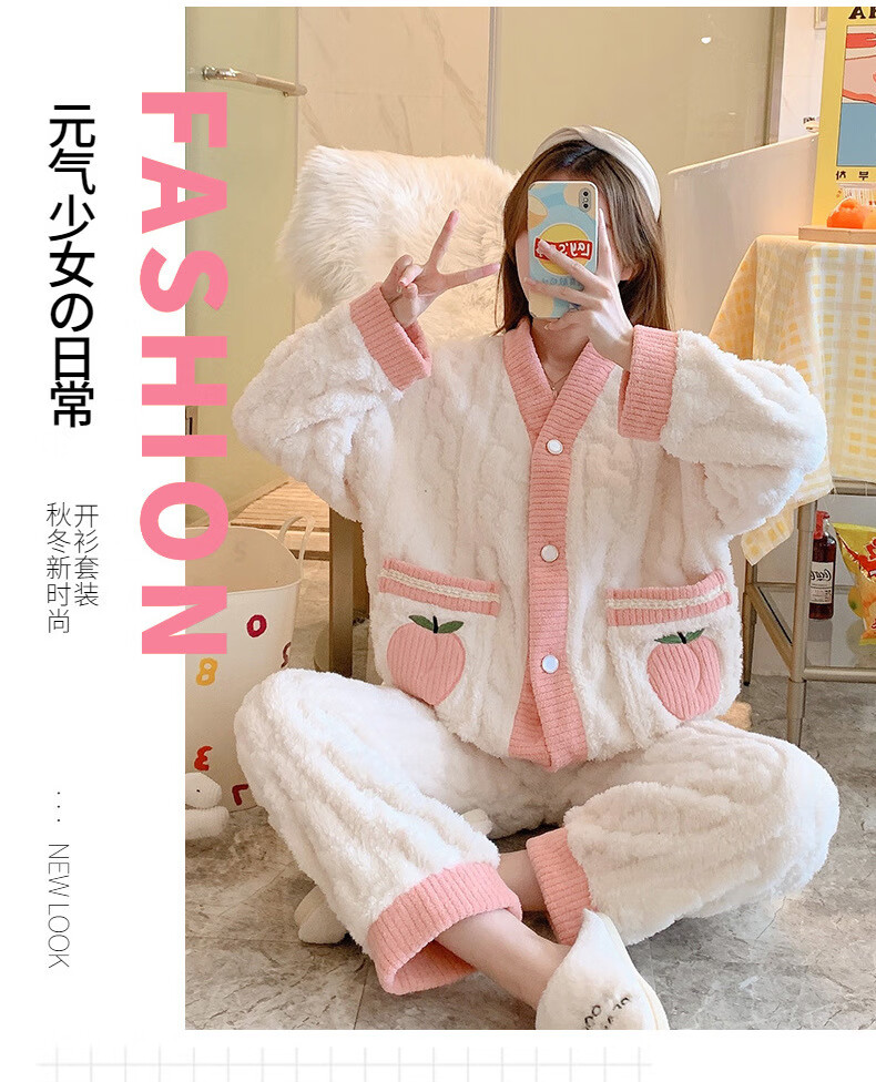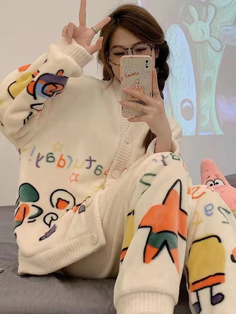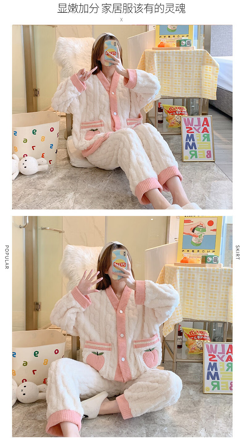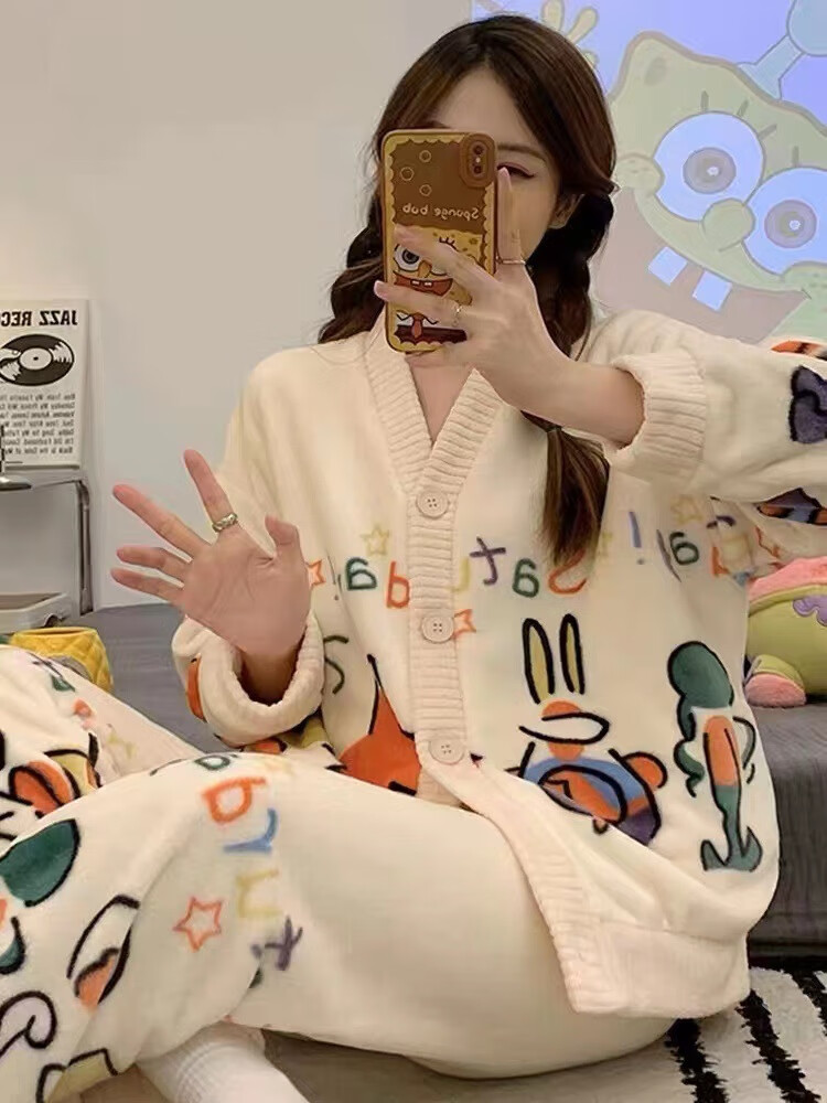 有只绵秋冬加厚加绒保暖睡衣女学生可爱珊瑚绒套装宽松法兰绒家居服 蝴蝶结-套装 L 码(建议90-120斤)