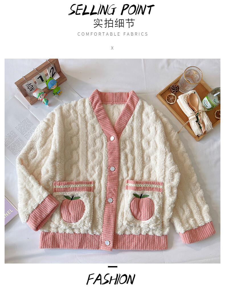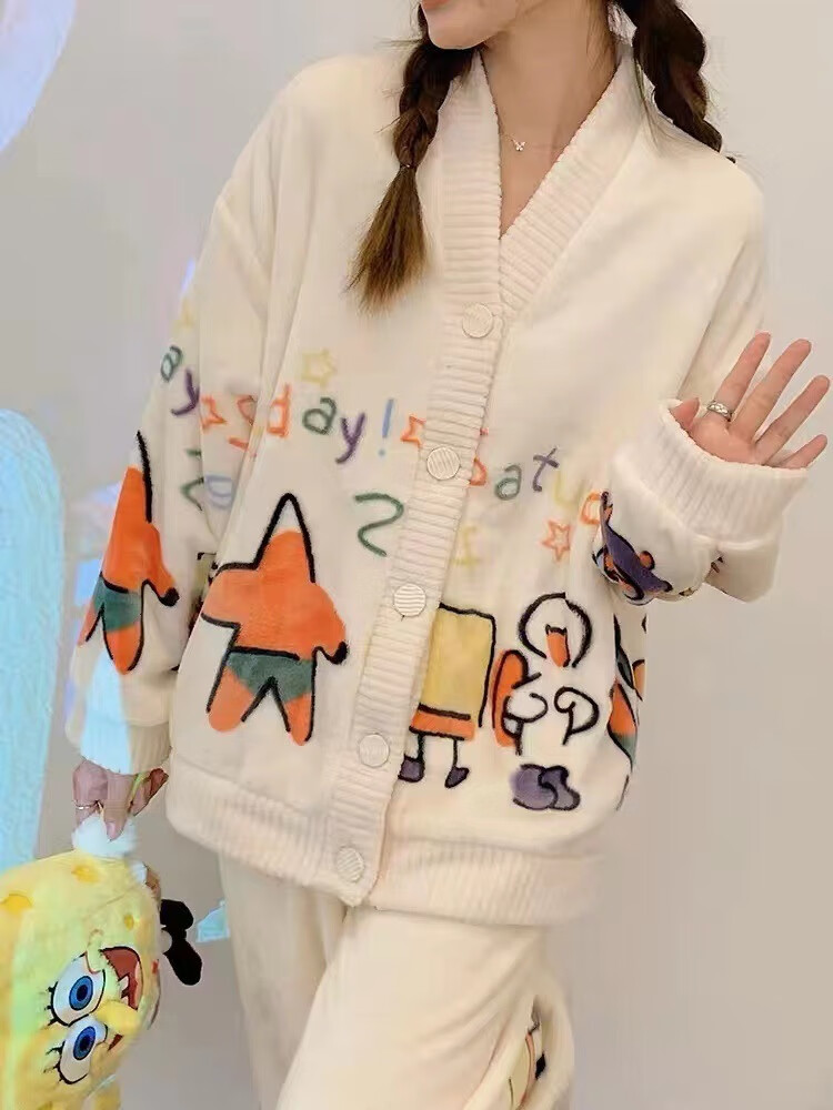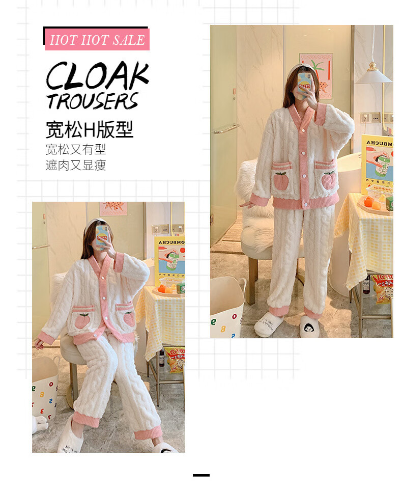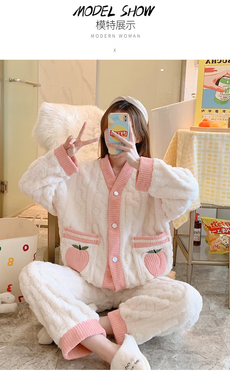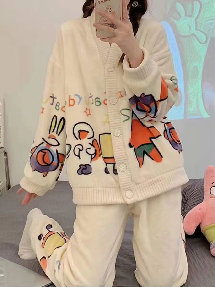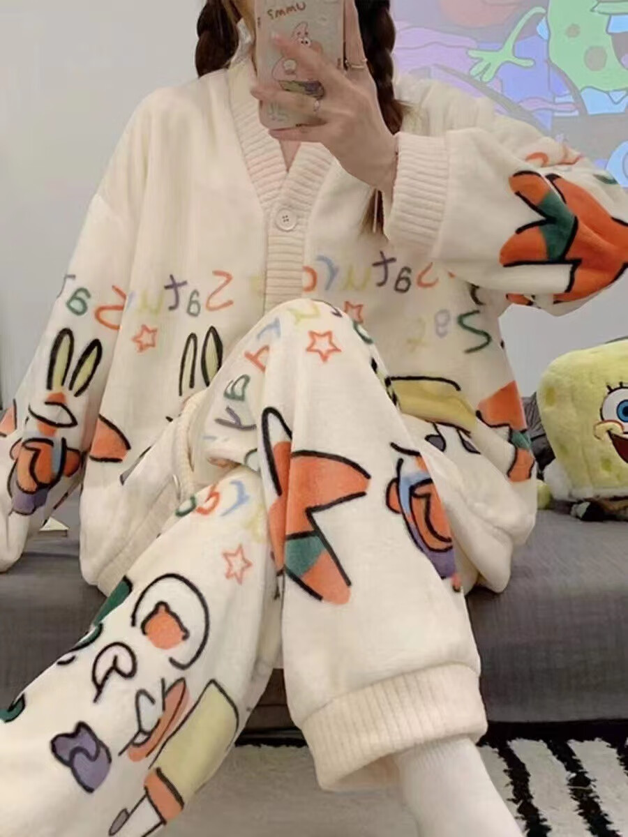 有只绵秋冬加厚加绒保暖睡衣女学生可爱珊瑚绒套装宽松法兰绒家居服 蝴蝶结-套装 L 码(建议90-120斤)