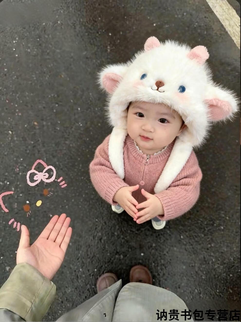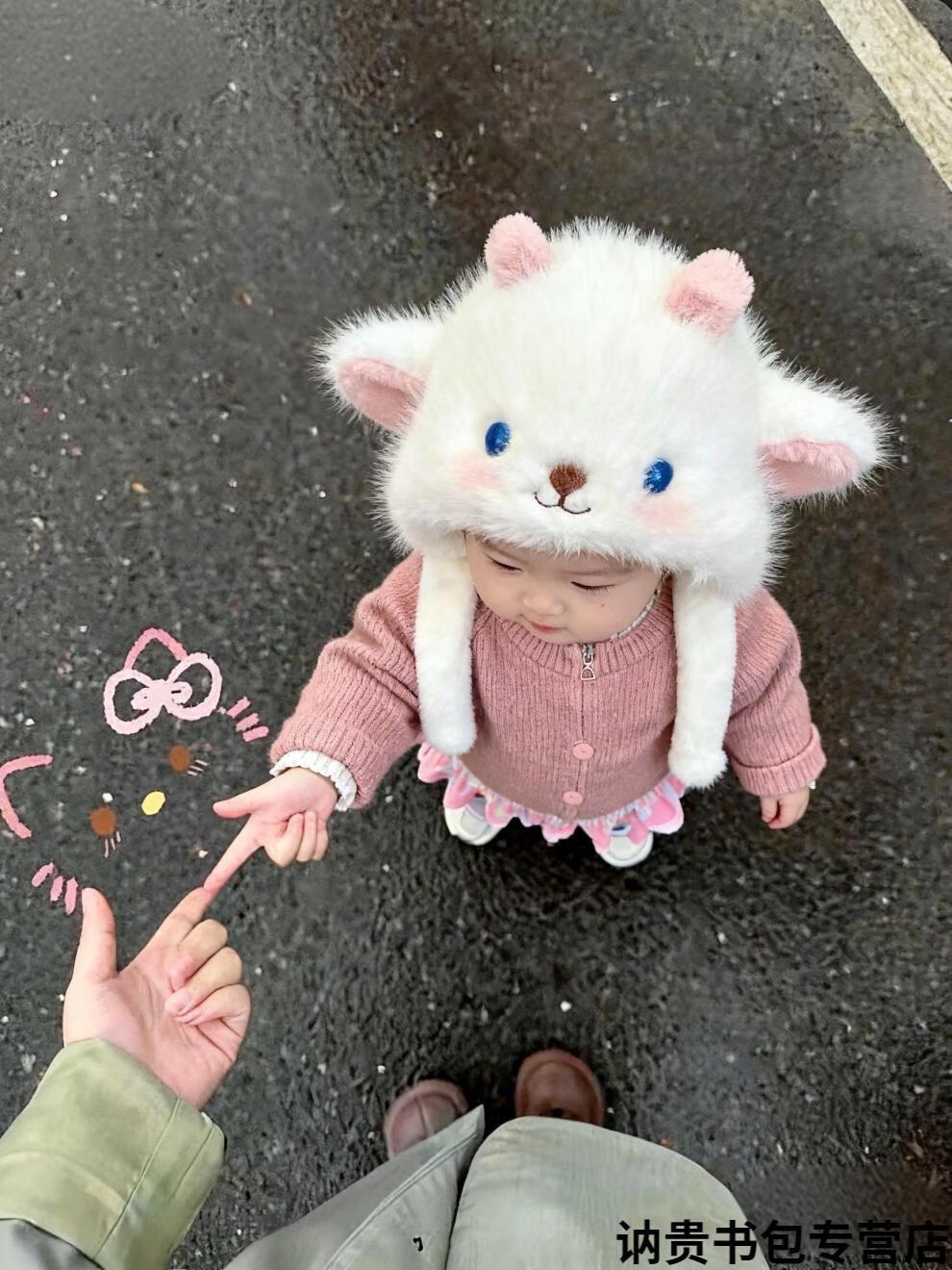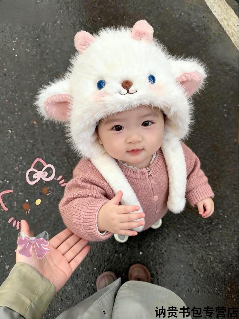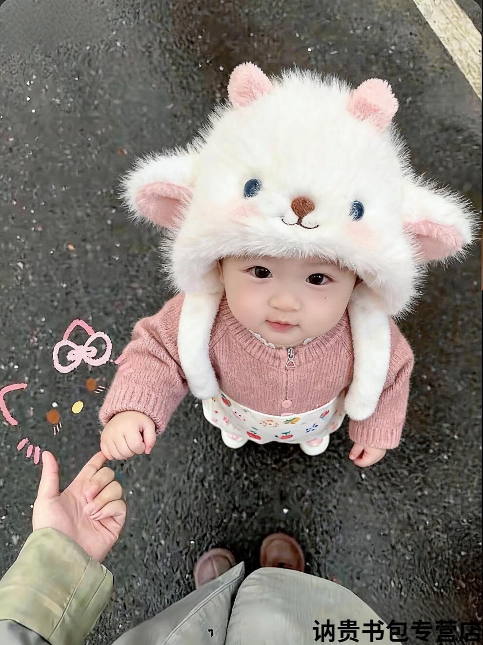 G.duck小黄鸭会动耳朵的帽子毛绒保暖女冬季可爱毛茸茸防寒儿童宝宝 呆萌羊角-米色【内置气囊+耳朵会动】 均码(头围46cm以上可戴)