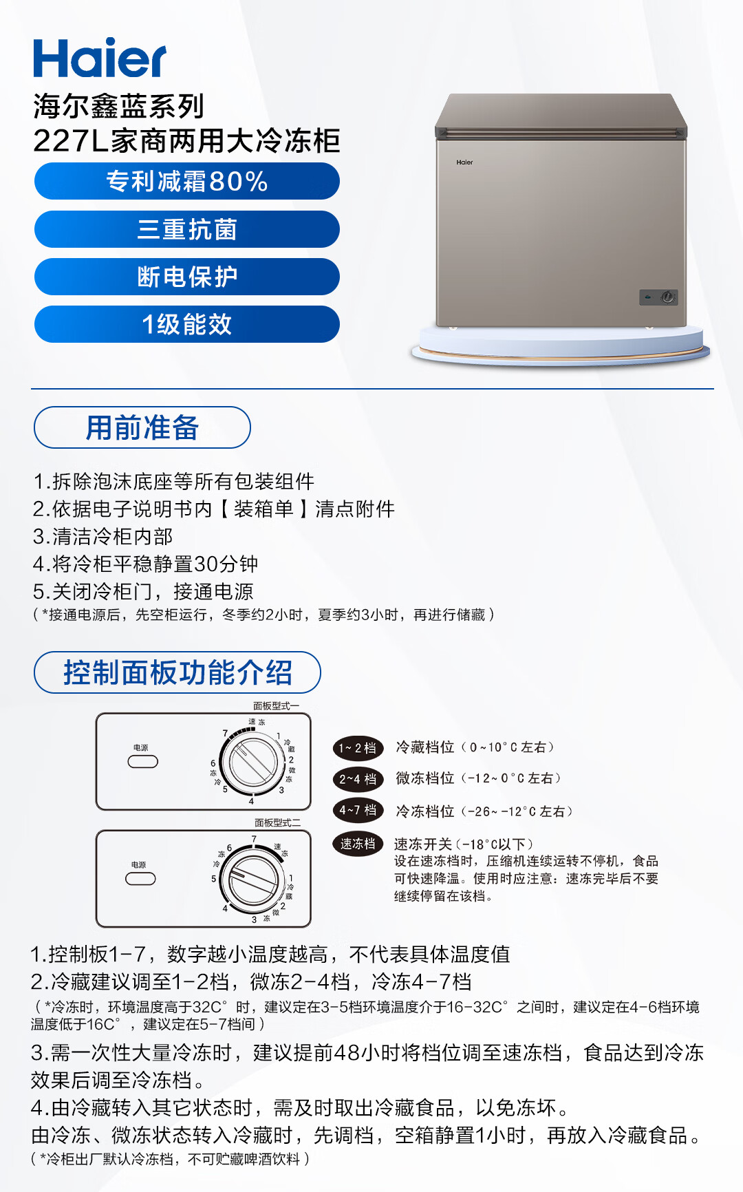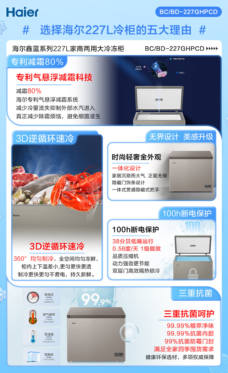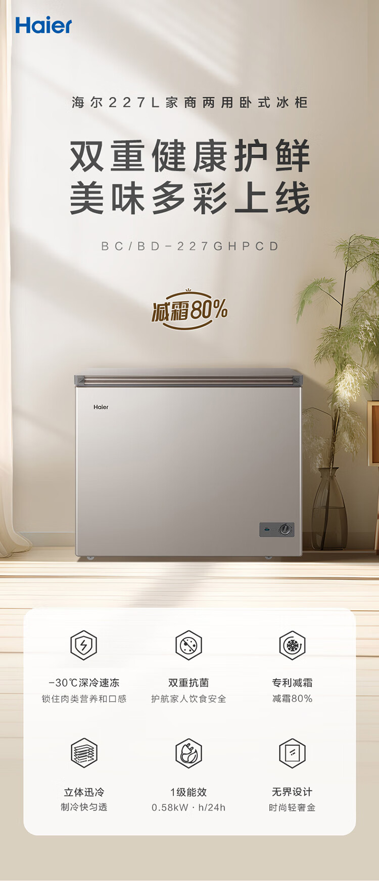 海尔(Haier)227升单温低霜小冰柜家用商用冷藏柜冷冻柜两用冰柜小型冰箱小型冷柜宝蓝BC/BD-227GHPCD国家补贴