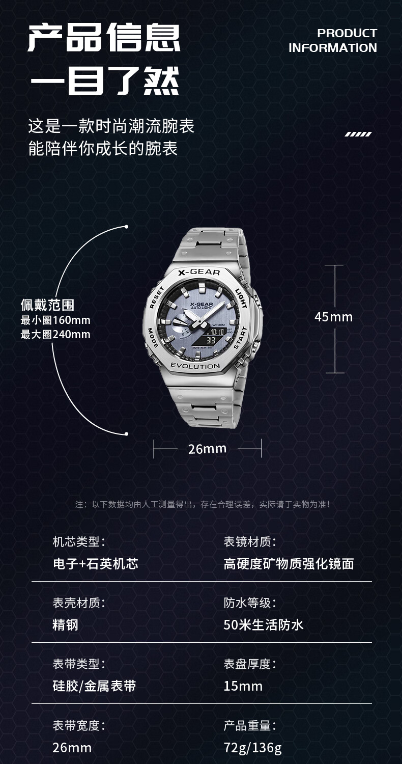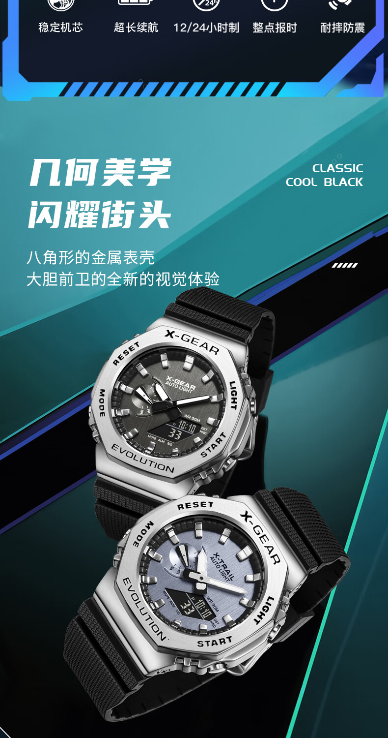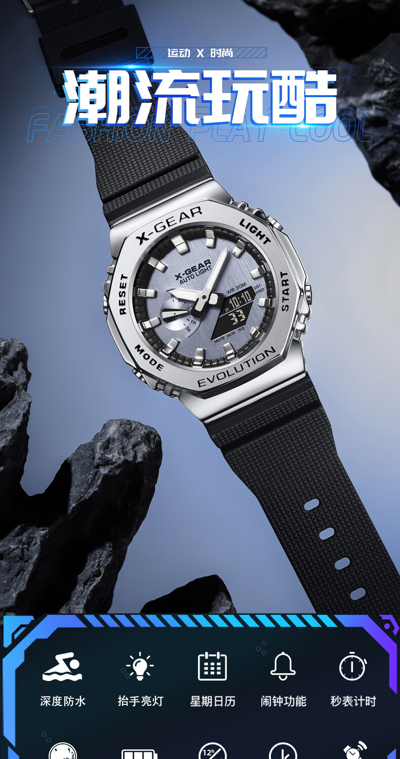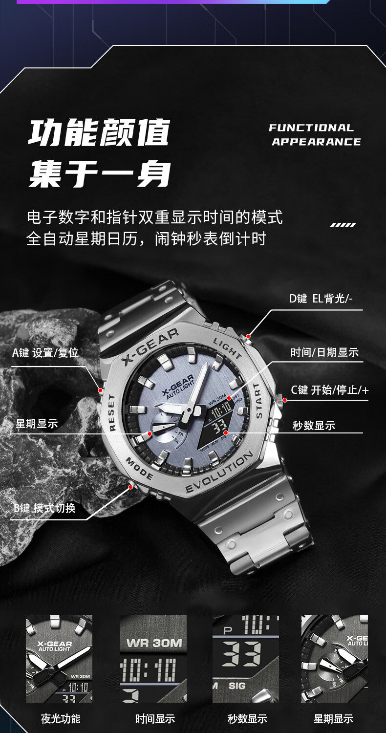 X-GEAR农家八角橡树男士钢铁机械之心青少年初高中学生运动防水石英手表 银蓝钢带【字母款】