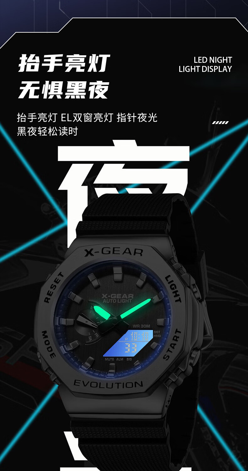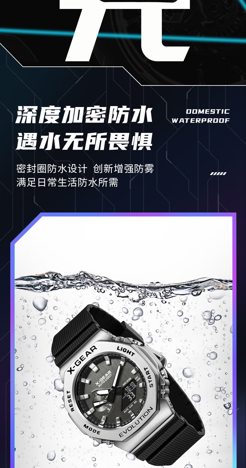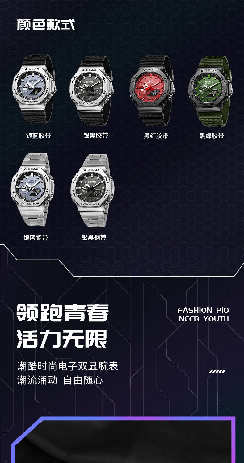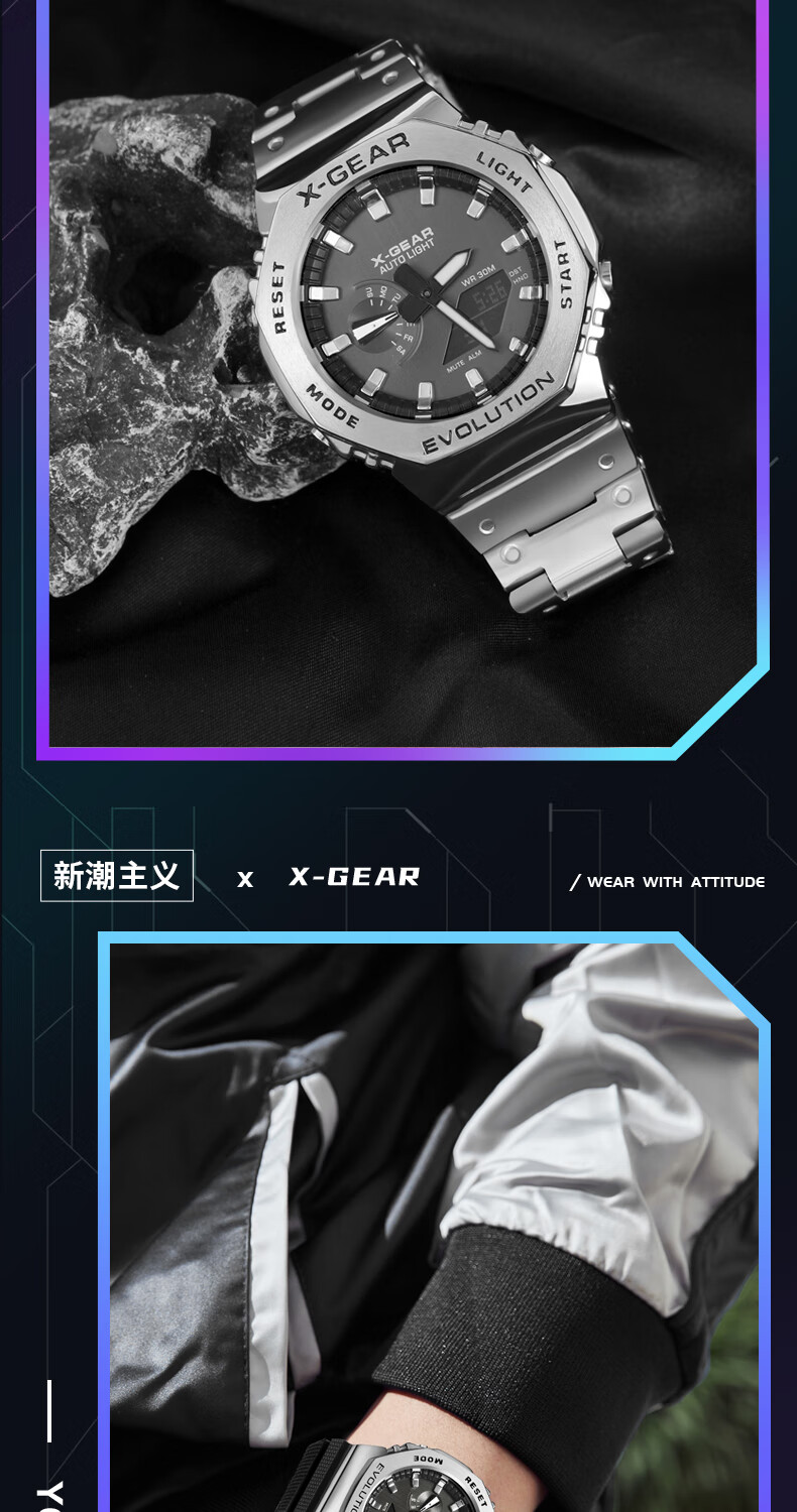 X-GEAR农家八角橡树男士钢铁机械之心青少年初高中学生运动防水石英手表 银蓝钢带【字母款】