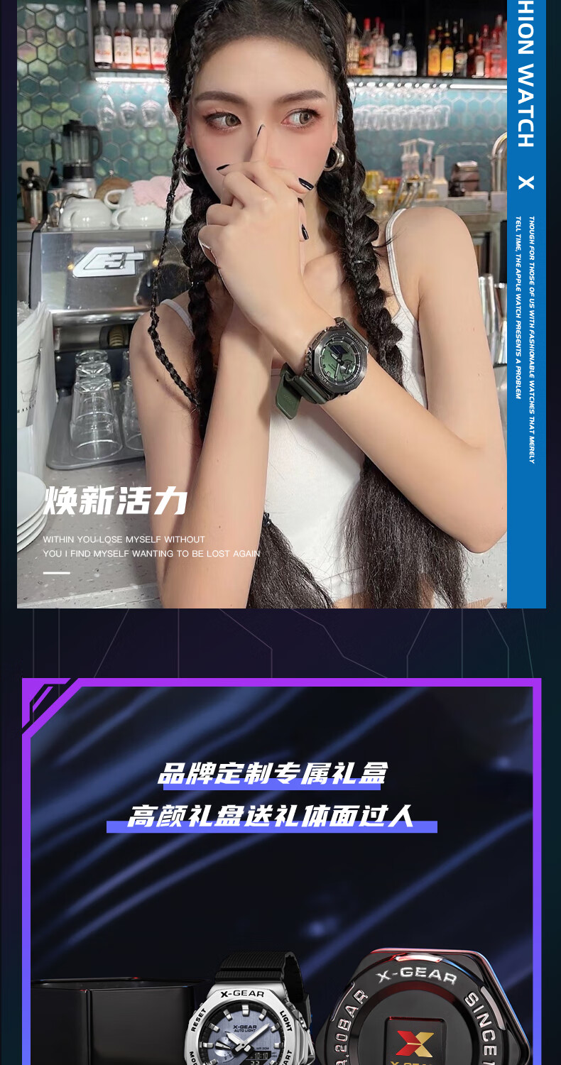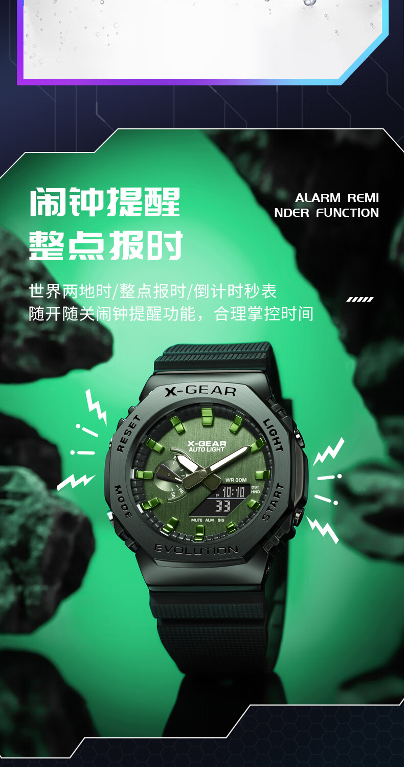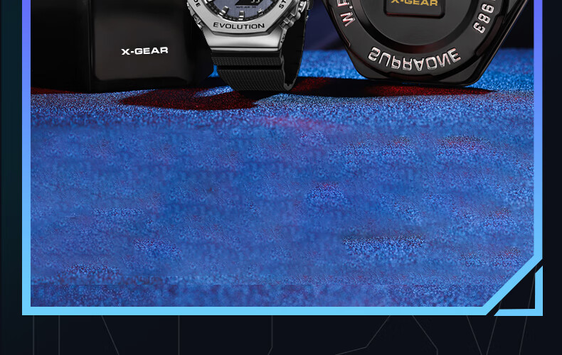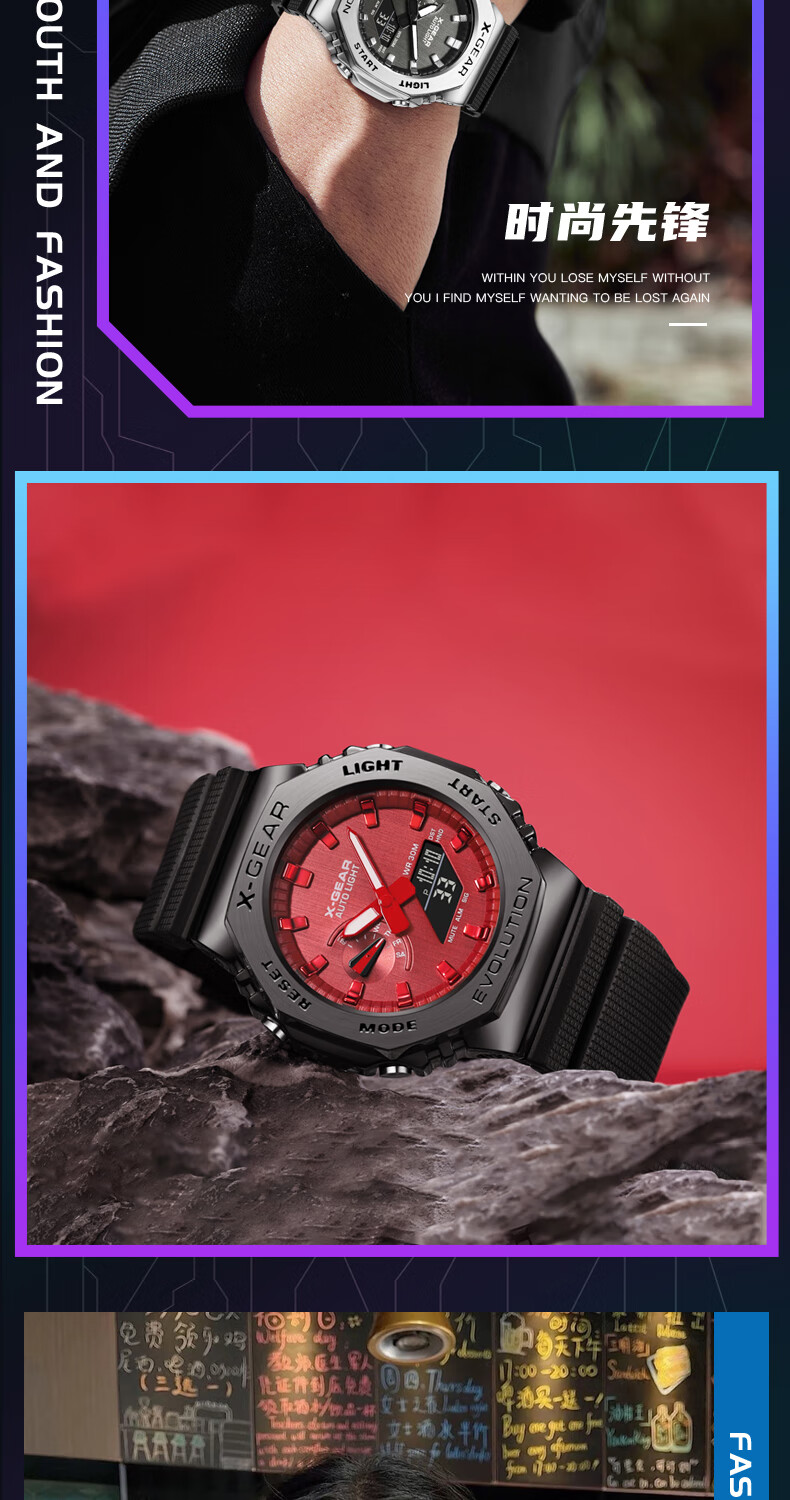 X-GEAR农家八角橡树男士钢铁机械之心青少年初高中学生运动防水石英手表 银蓝钢带【字母款】