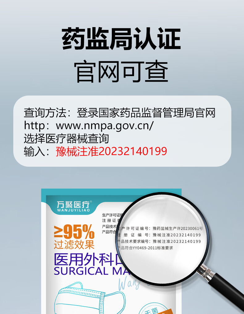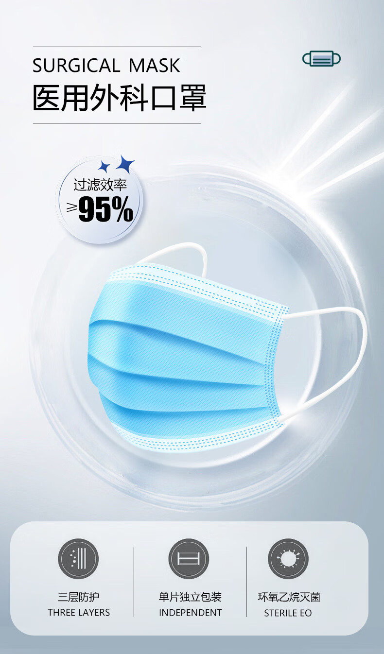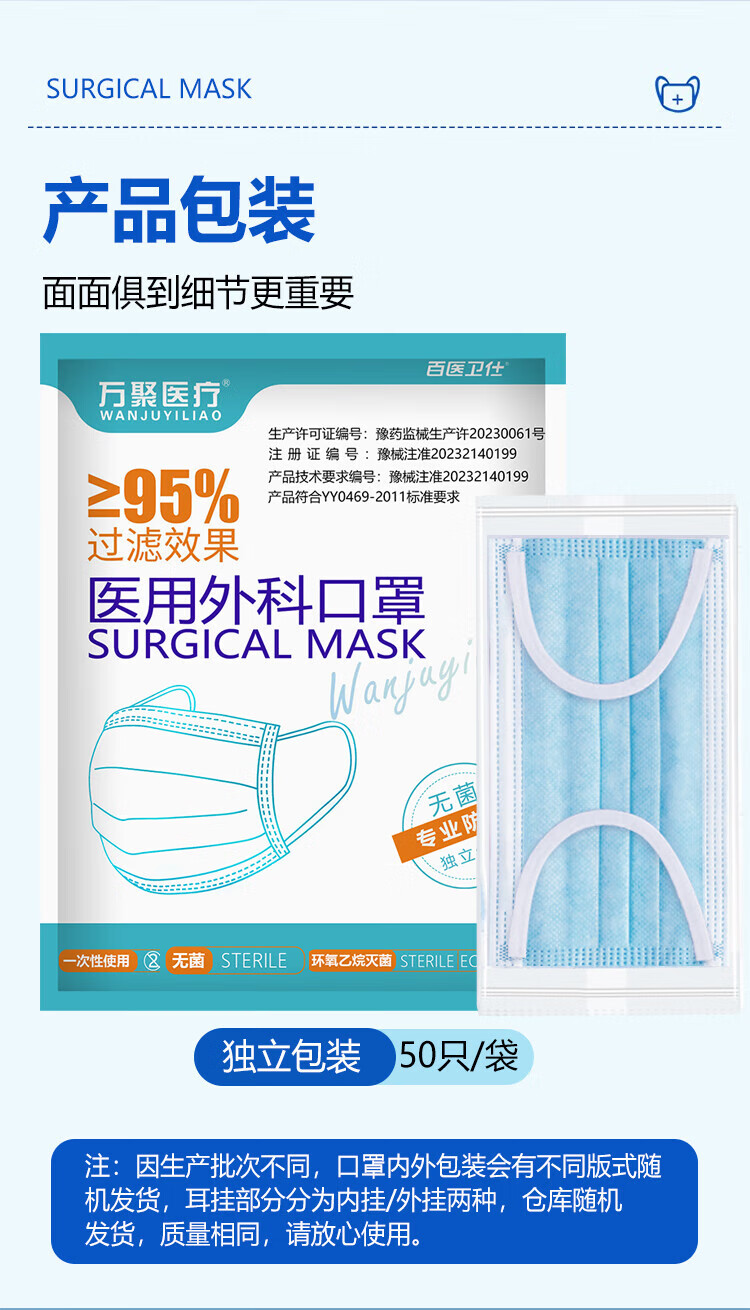 万聚医疗医用外科口罩独立包装灭菌级一次性医用口罩成人防尘防细菌防过敏 (灭菌独立装)医用外科口罩100只