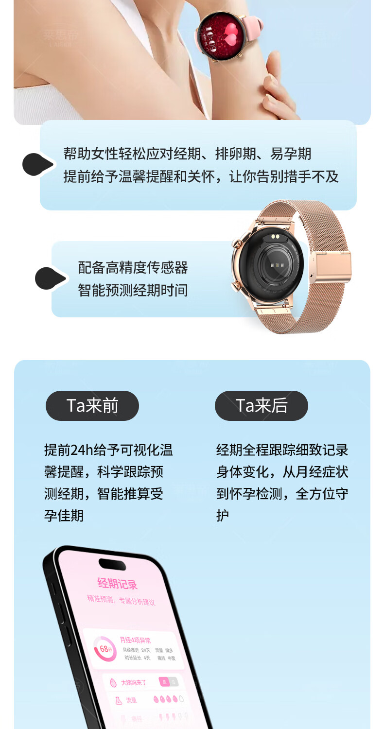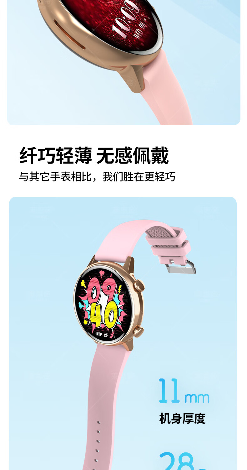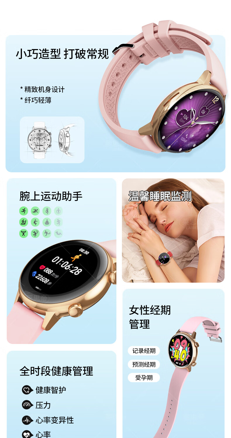 莱思帝智能手表女生款迷你小巧心率血压血氧睡眠监测跑步防水长续航蓝牙打电话离线支付运动mini手环 香槟金+粉色硅胶