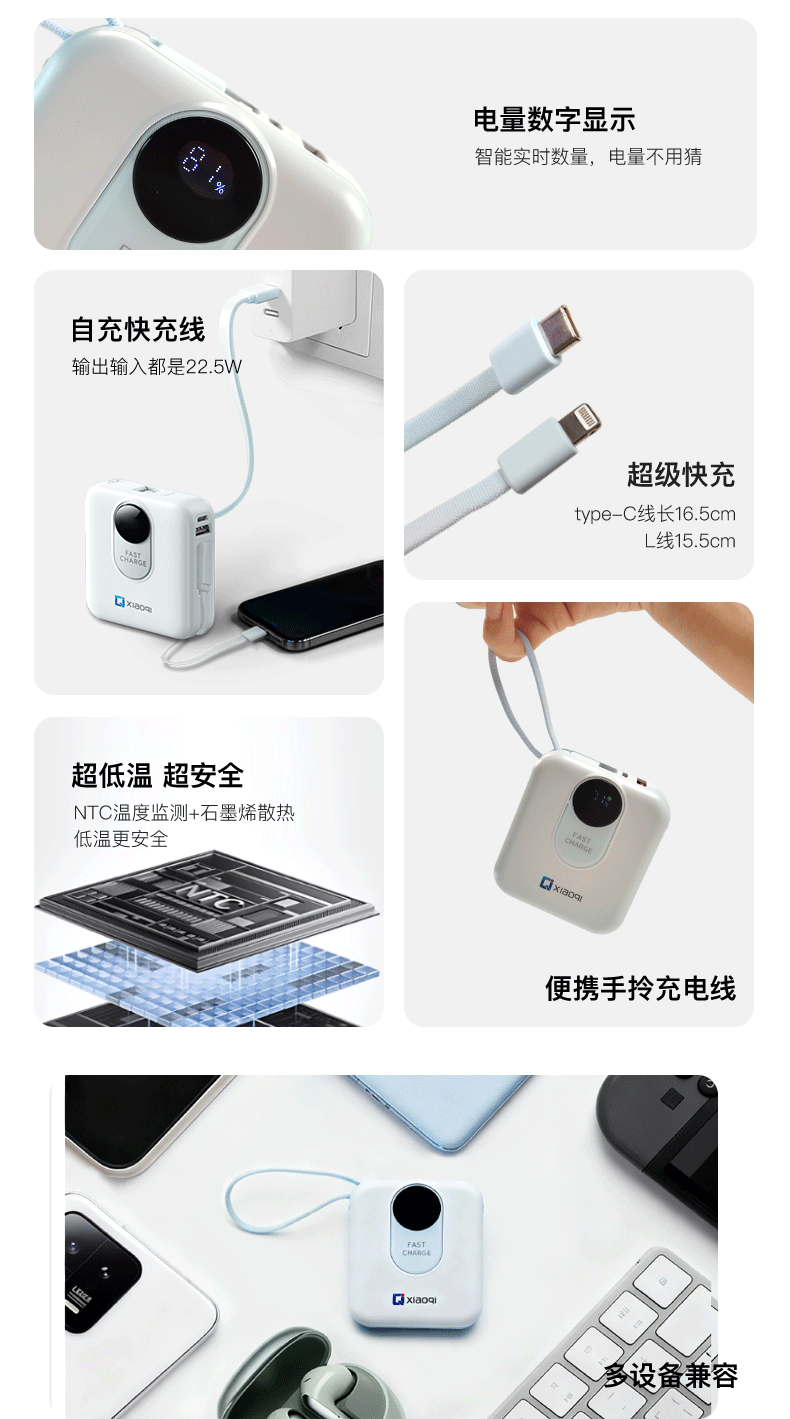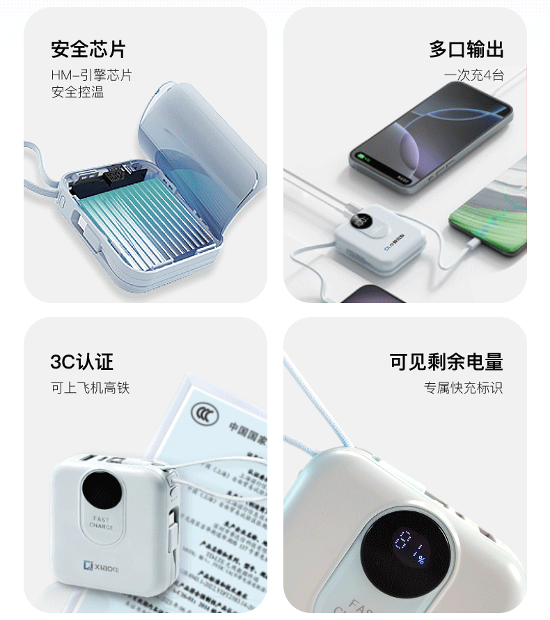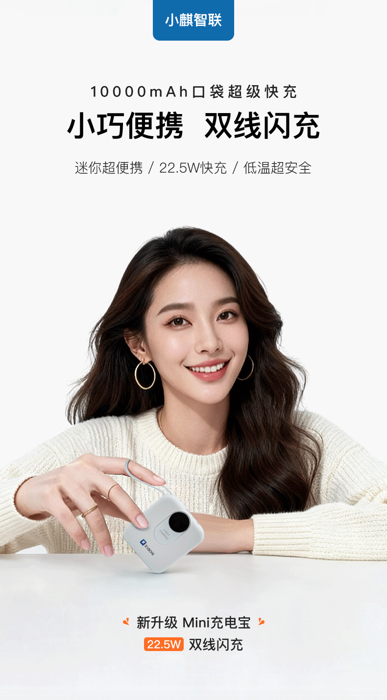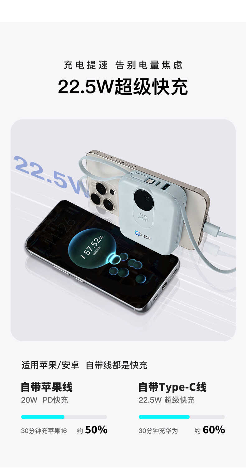 小麒智联【3C认证可上飞机】超级快充充电宝自带双线10000毫安移动电源使用华为荣耀苹果17小米 【米橙】带支架自带双线手电照明