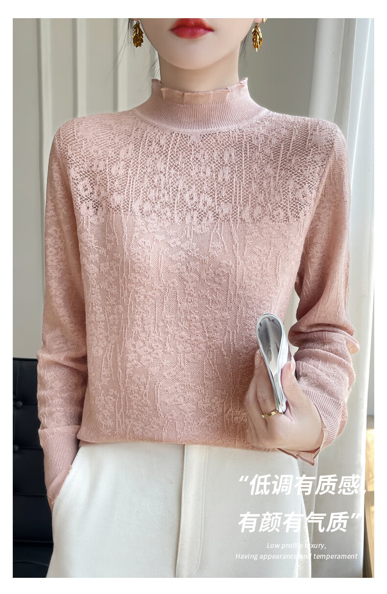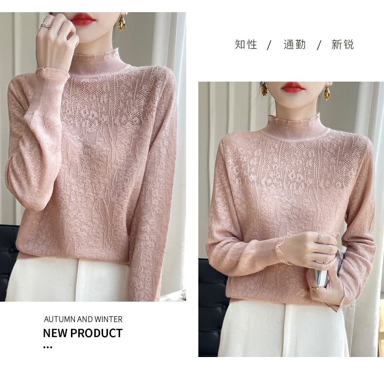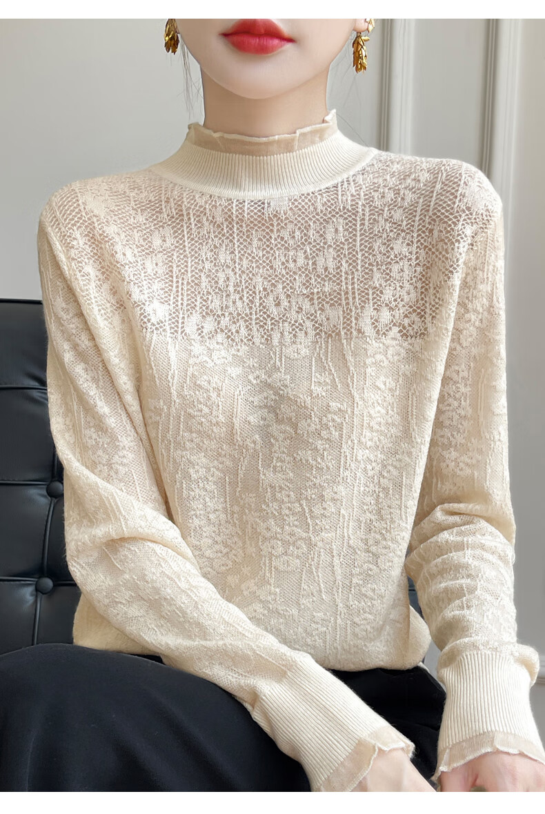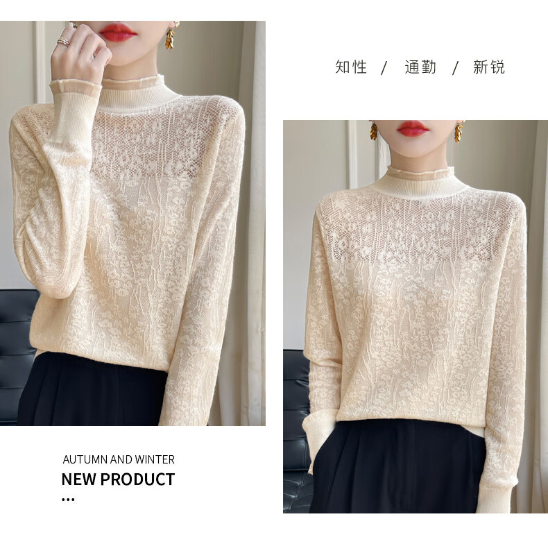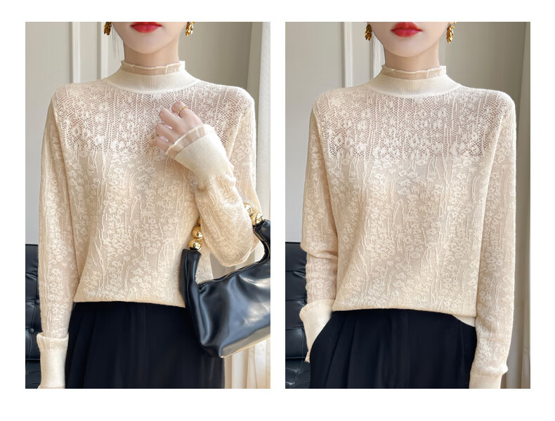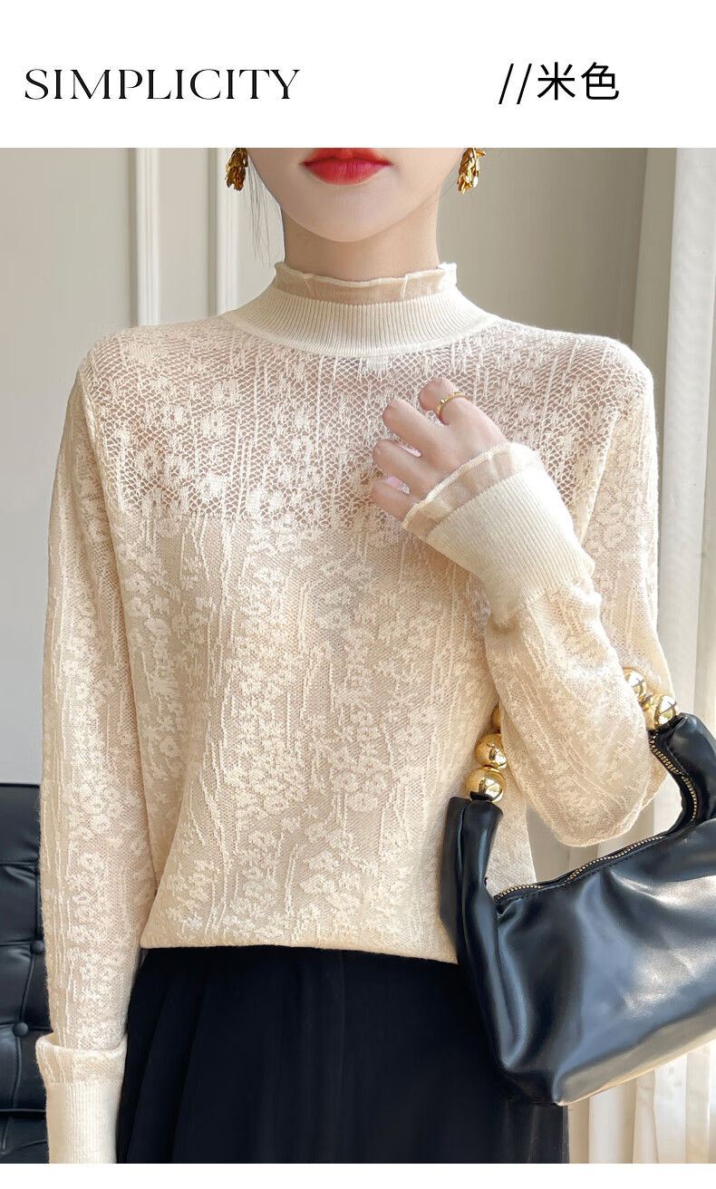 香影芬蕾丝打底衫女2025秋冬新款半高领针织衫女显瘦外搭女装上衣毛衣女 米色 L (建议105-115斤)