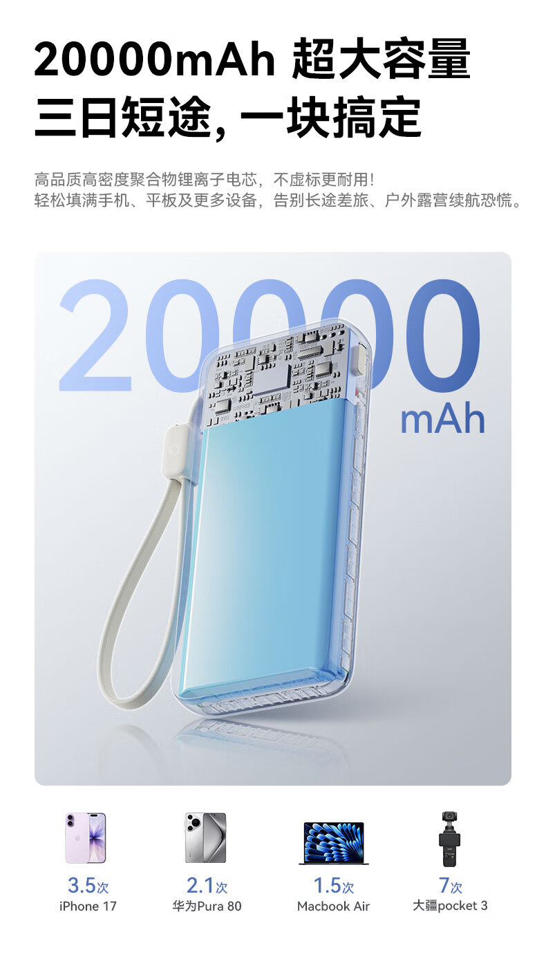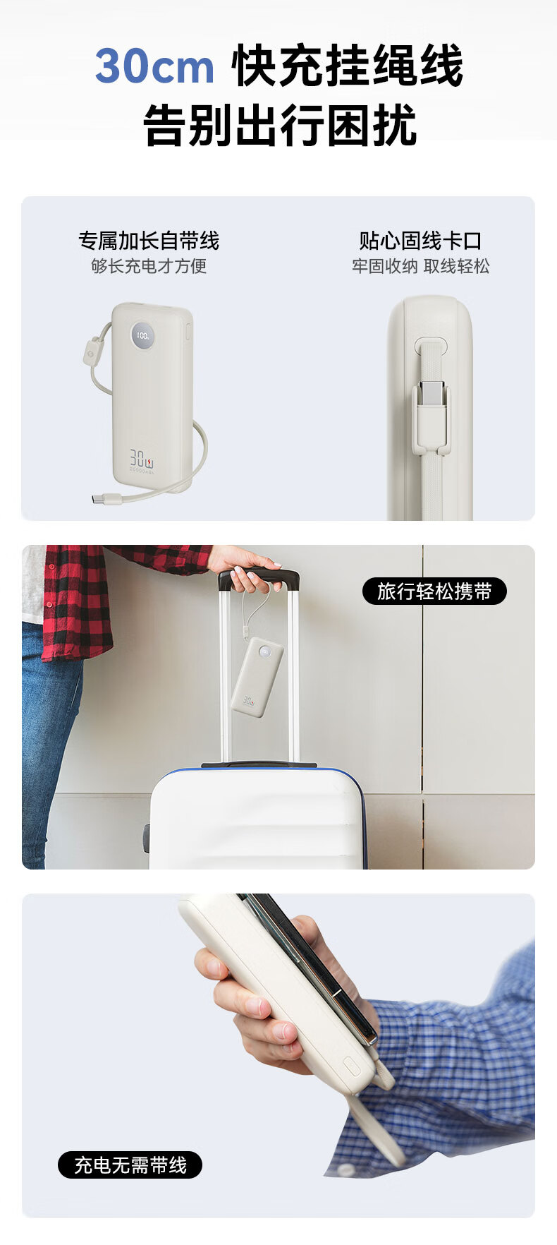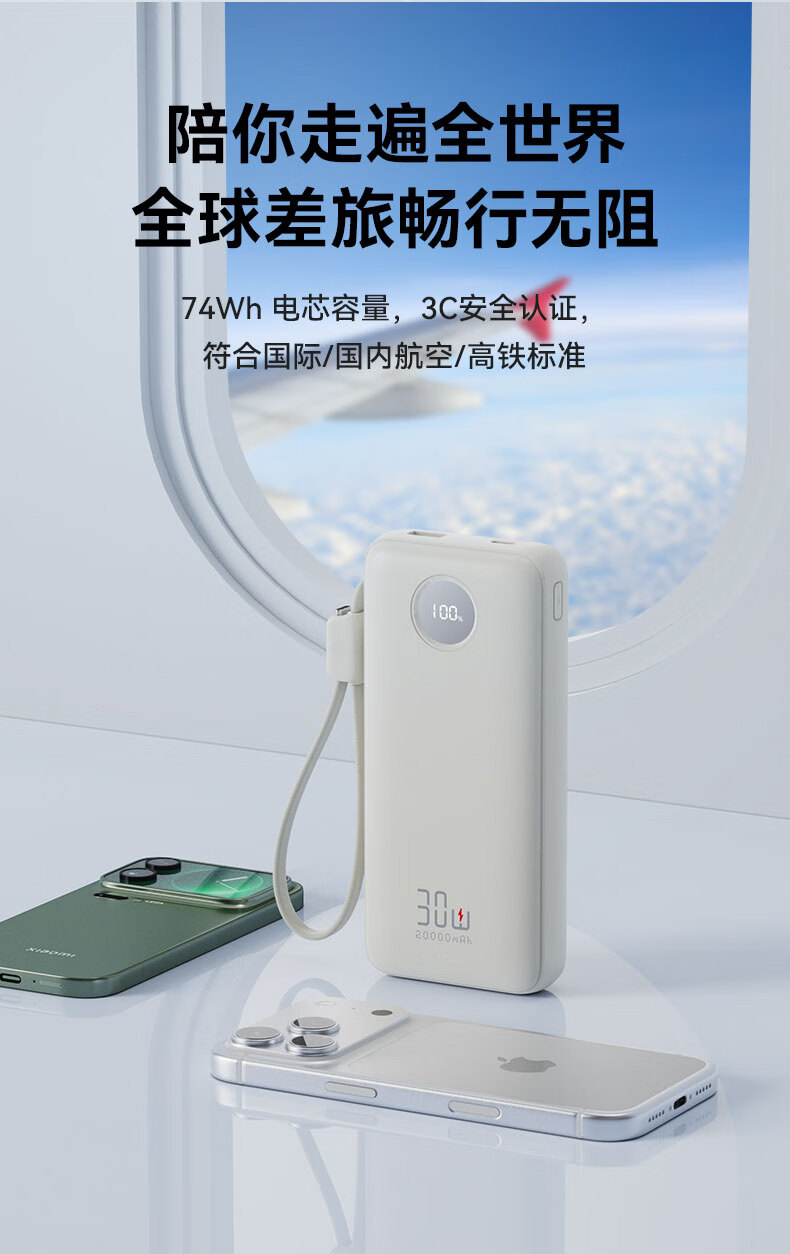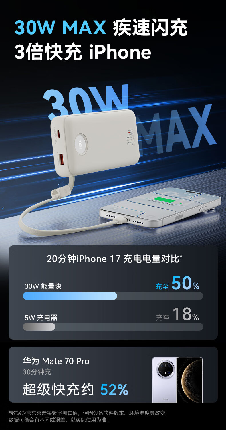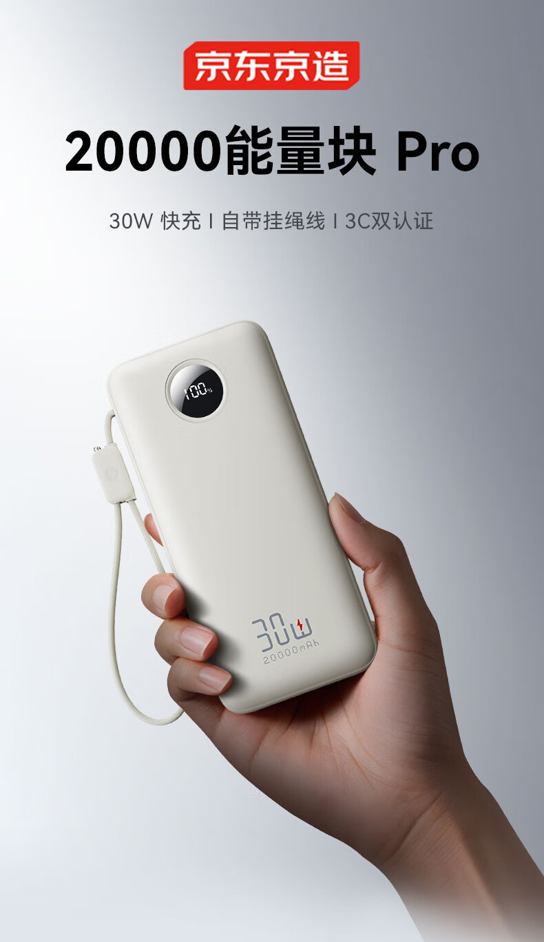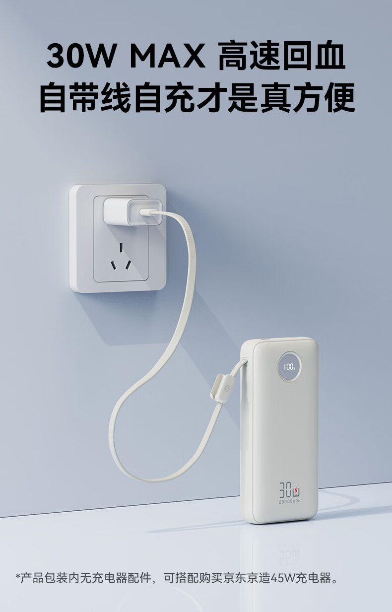 京东京造30W大功率充电宝20000毫安自带线3c认证可上飞机京东自营移动电源适用苹果17华为小米17荣耀vivo