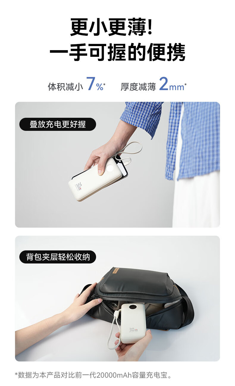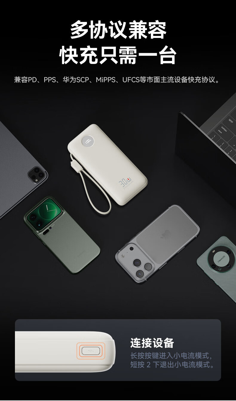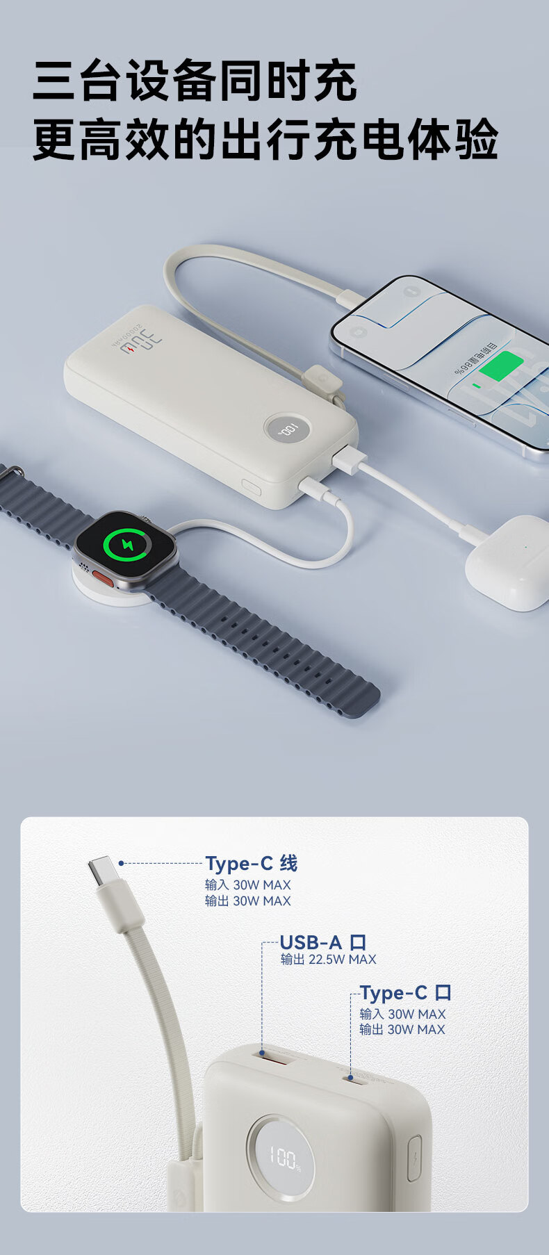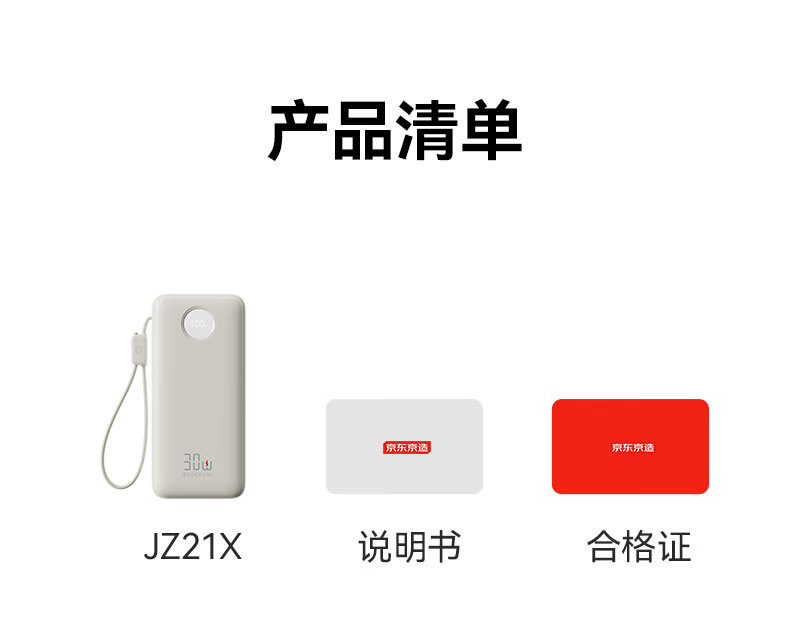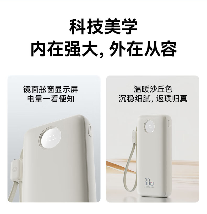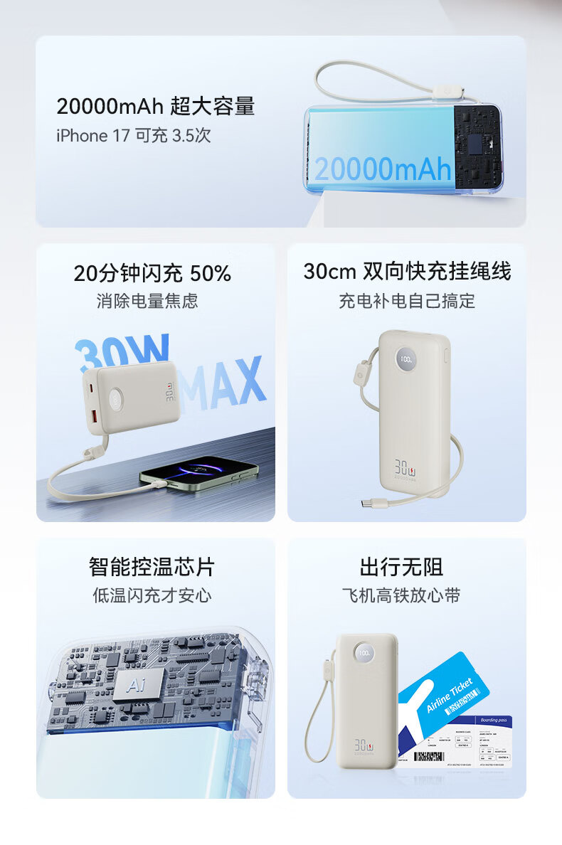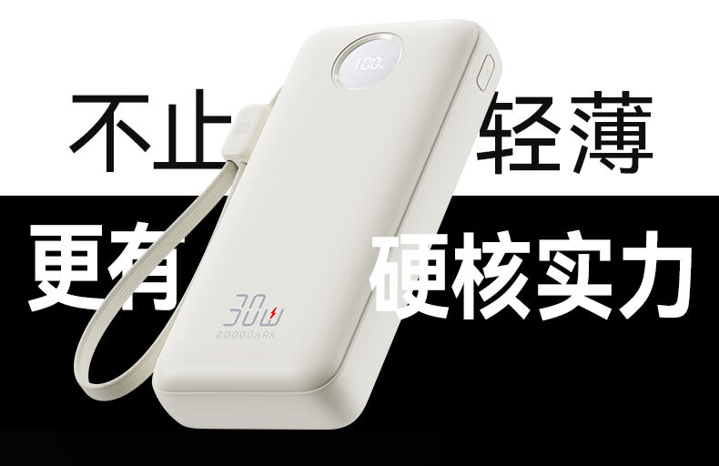京东京造30W大功率充电宝20000毫安自带线3c认证可上飞机京东自营移动电源适用苹果17华为小米17荣耀vivo